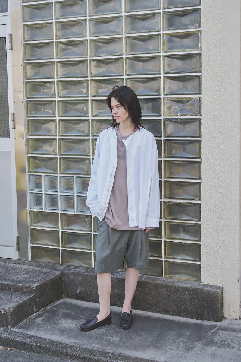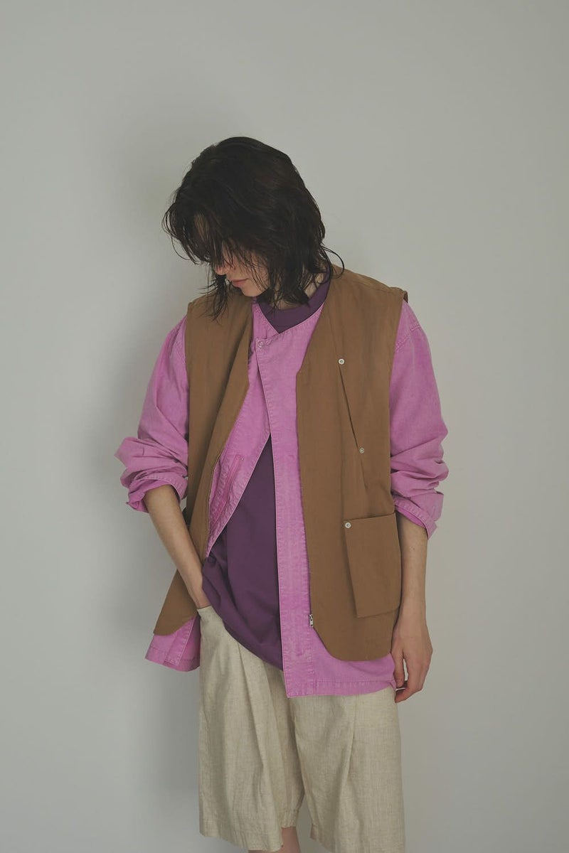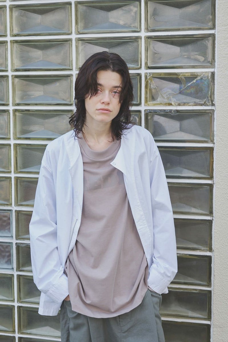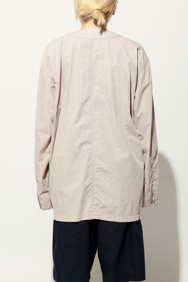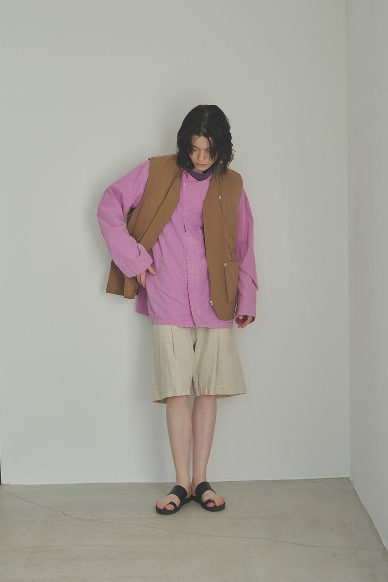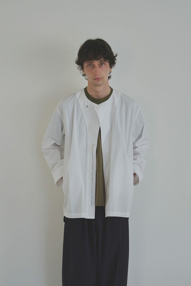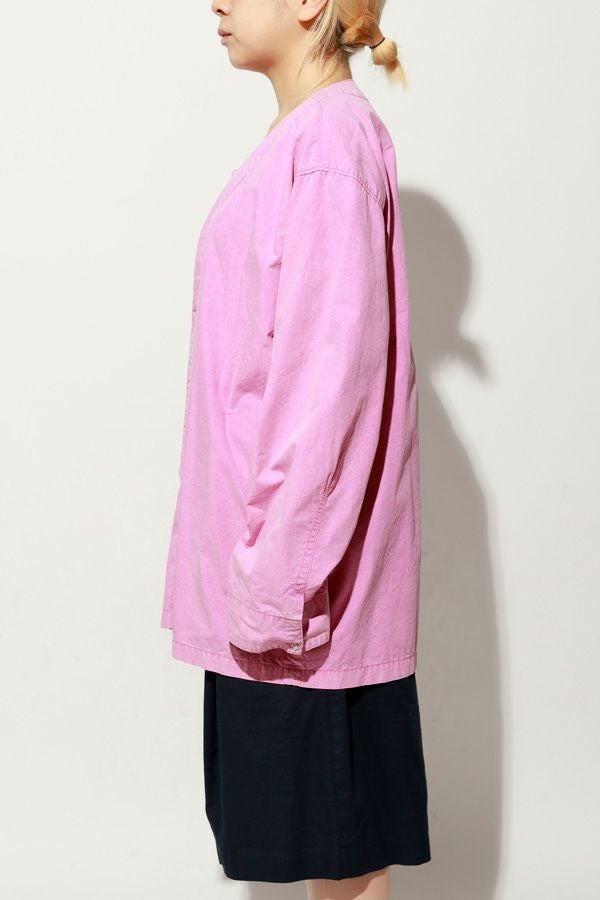 羽織るだけで完成、大人のノーカラーシャツジャケット。 ゆったりとしたシルエットのノーカラーシャツ。シンプルながらもケミカル加工で独特な風合いをプラスし、フロントファスナーを閉めればジャケット感覚で着られる1枚です。袖はダーツとスリットで立体感を生み、腕の動きやすさにも配慮しました。 素材にはハリ感のあるブロードを使用しつつ、ケミカル加工によって柔らかさと独特なカラーを表現。色落ち感のあるピンクやグレーなどが、軽やかで爽やかな印象を演出します。 全体のハリ感を残しながらも、着心地の良い柔らかさを両立させた大人のシャツジャケットです。