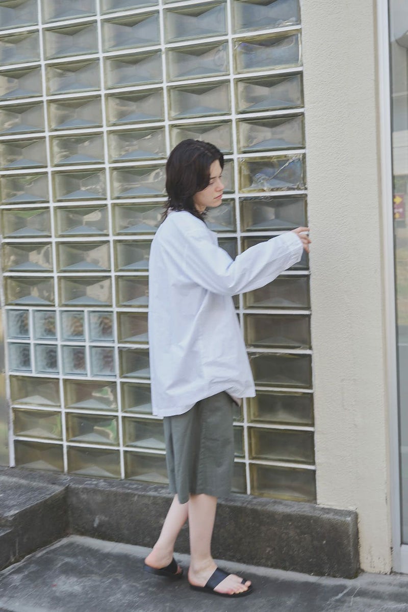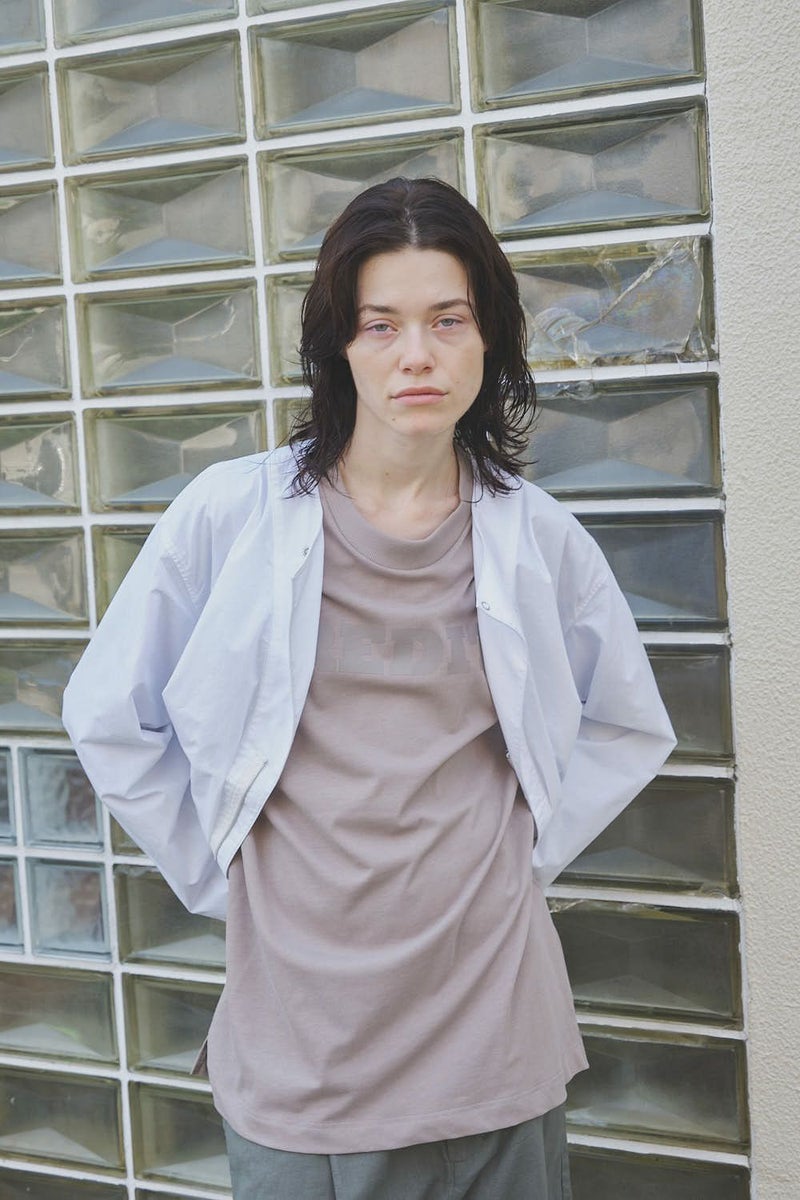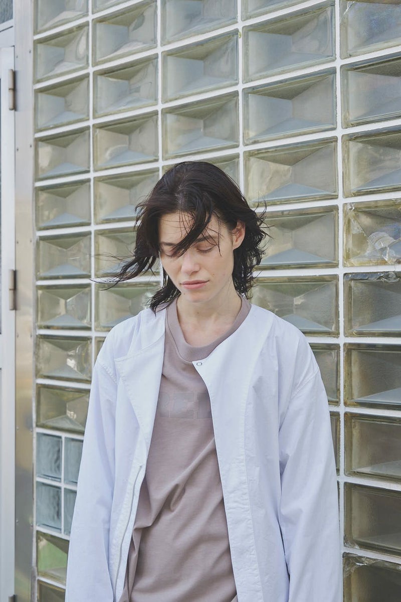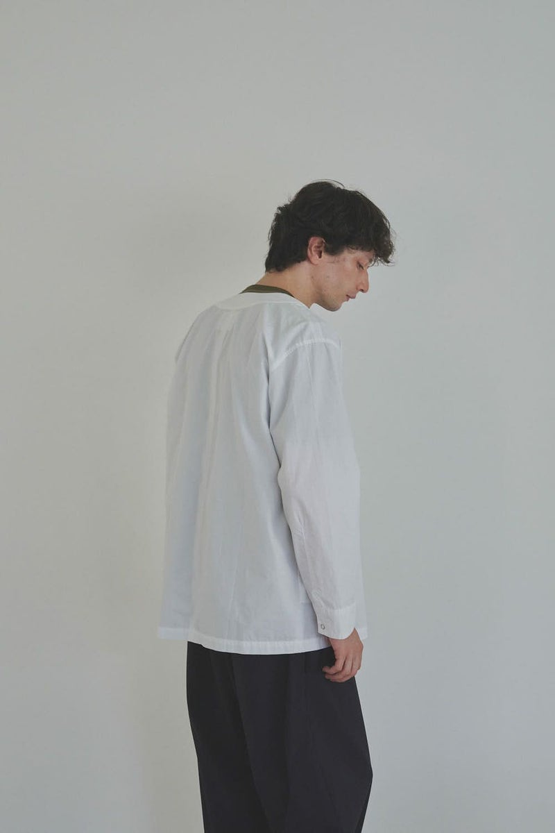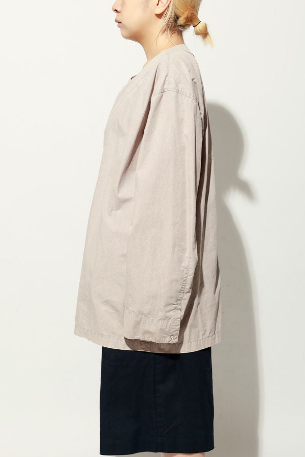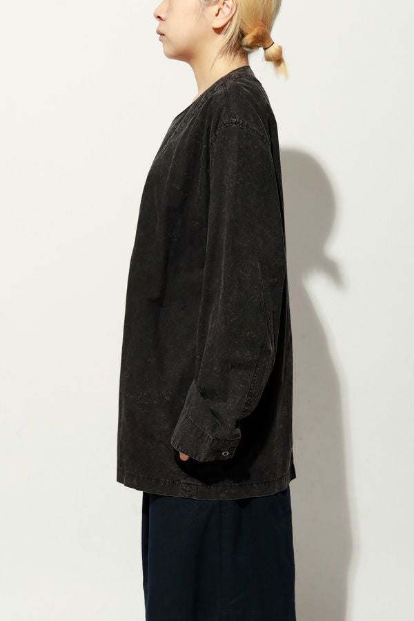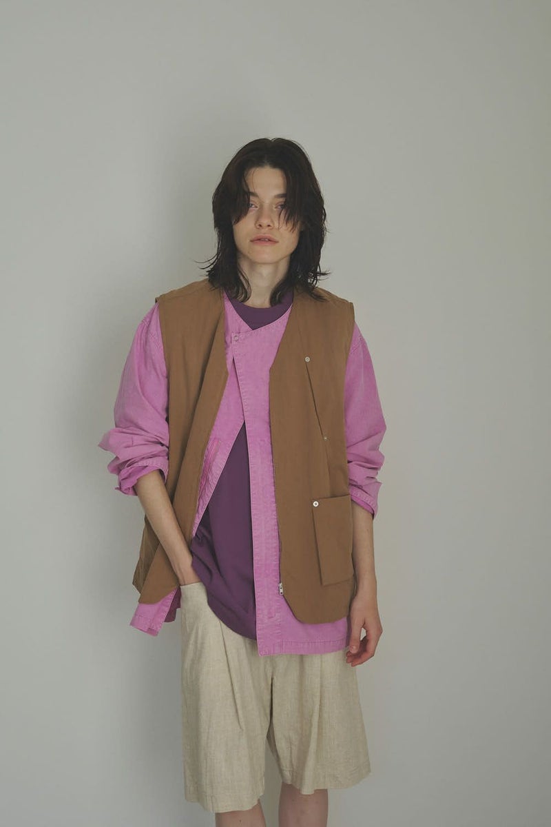 羽織るだけで完成、大人のノーカラーシャツジャケット。 ゆったりとしたシルエットのノーカラーシャツ。シンプルながらもケミカル加工で独特な風合いをプラスし、フロントファスナーを閉めればジャケット感覚で着られる1枚です。袖はダーツとスリットで立体感を生み、腕の動きやすさにも配慮しました。 素材にはハリ感のあるブロードを使用しつつ、ケミカル加工によって柔らかさと独特なカラーを表現。色落ち感のあるピンクやグレーなどが、軽やかで爽やかな印象を演出します。 全体のハリ感を残しながらも、着心地の良い柔らかさを両立させた大人のシャツジャケットです。