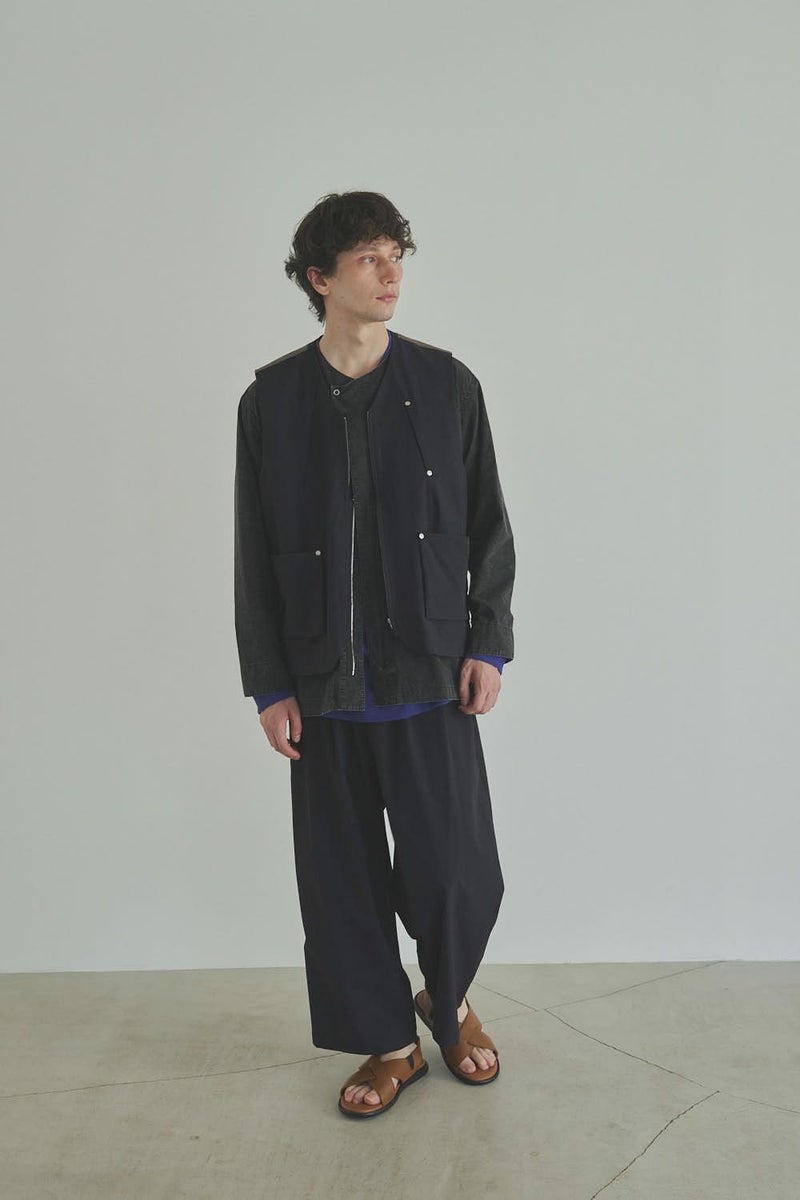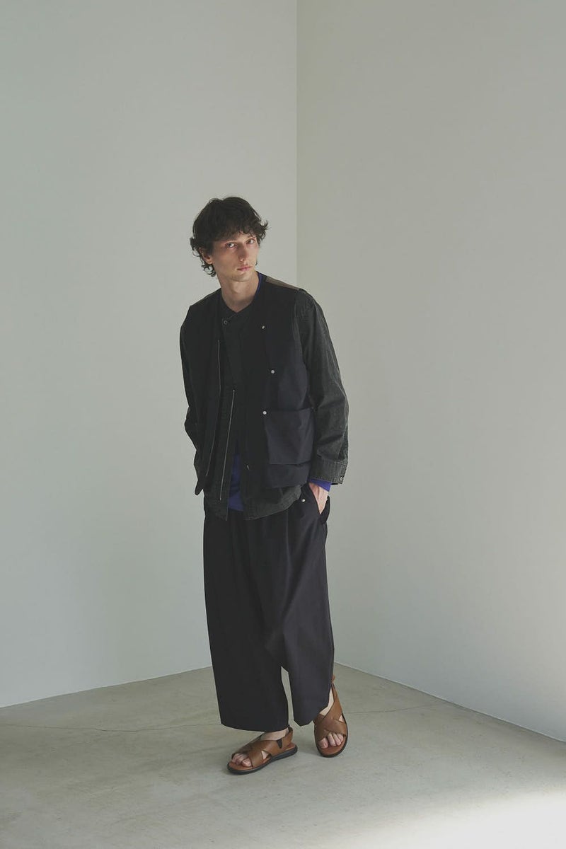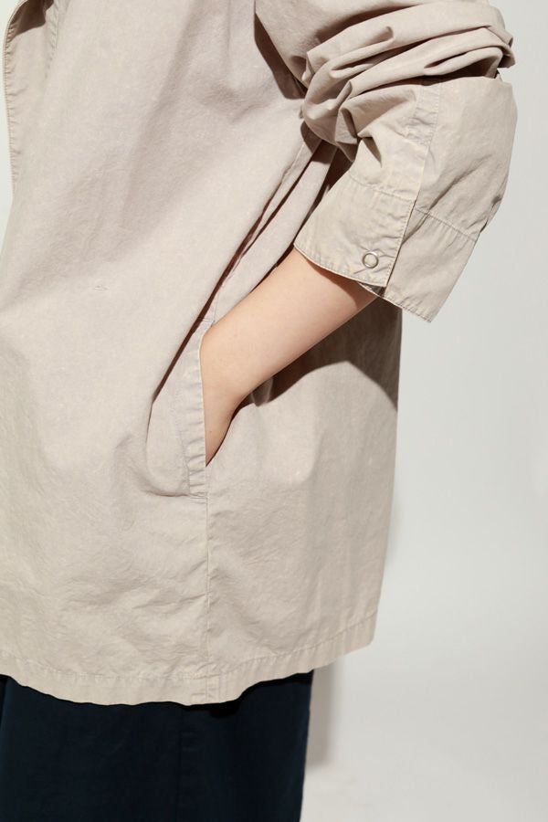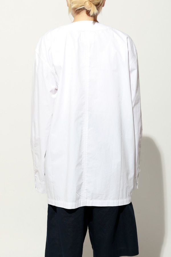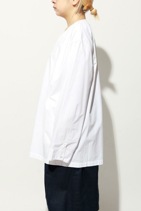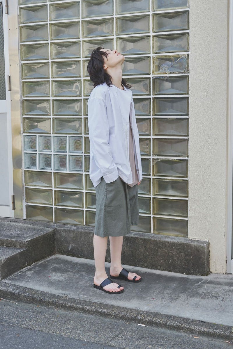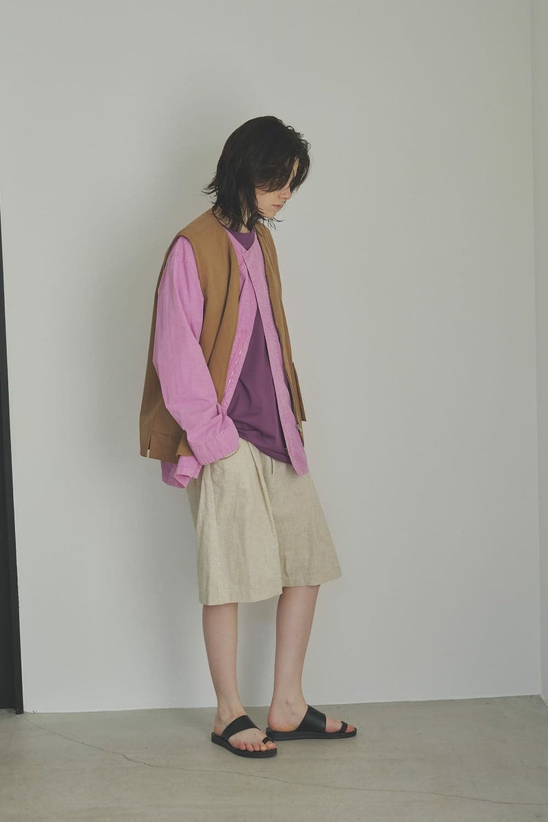 羽織るだけで完成、大人のノーカラーシャツジャケット。 ゆったりとしたシルエットのノーカラーシャツ。シンプルながらもケミカル加工で独特な風合いをプラスし、フロントファスナーを閉めればジャケット感覚で着られる1枚です。袖はダーツとスリットで立体感を生み、腕の動きやすさにも配慮しました。 素材にはハリ感のあるブロードを使用しつつ、ケミカル加工によって柔らかさと独特なカラーを表現。色落ち感のあるピンクやグレーなどが、軽やかで爽やかな印象を演出します。 全体のハリ感を残しながらも、着心地の良い柔らかさを両立させた大人のシャツジャケットです。