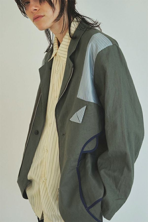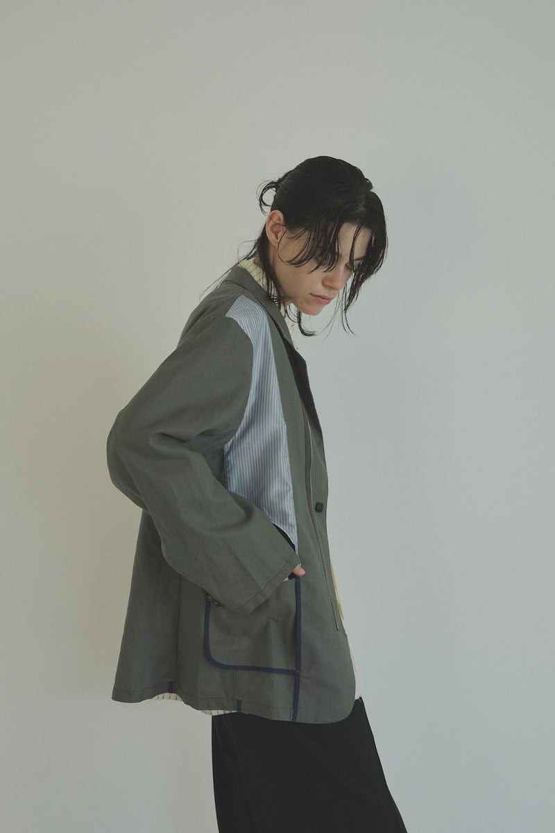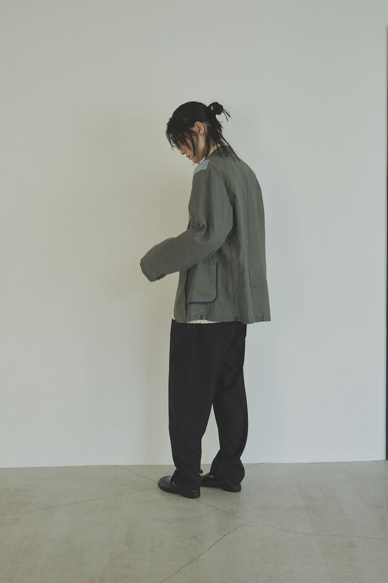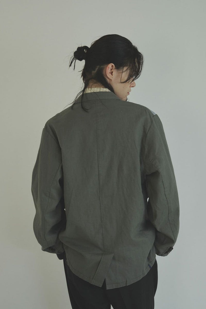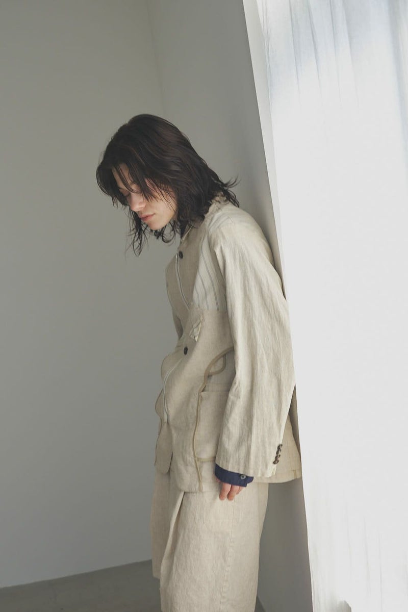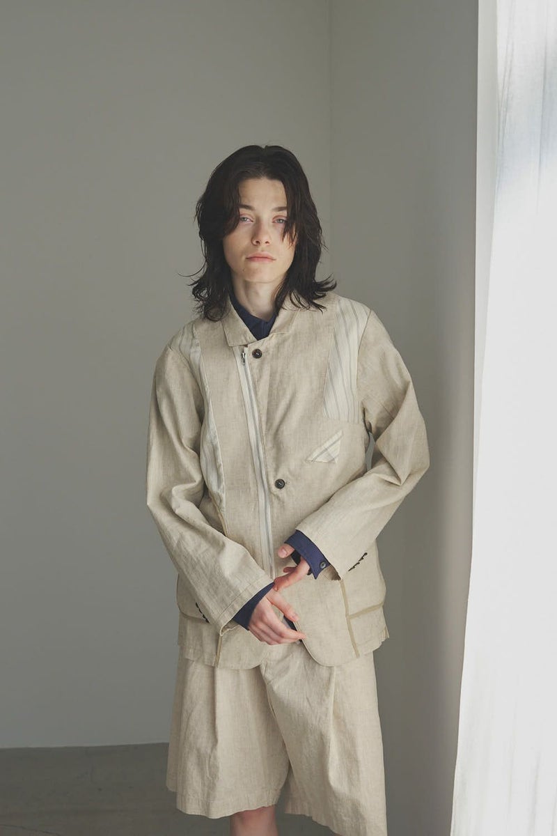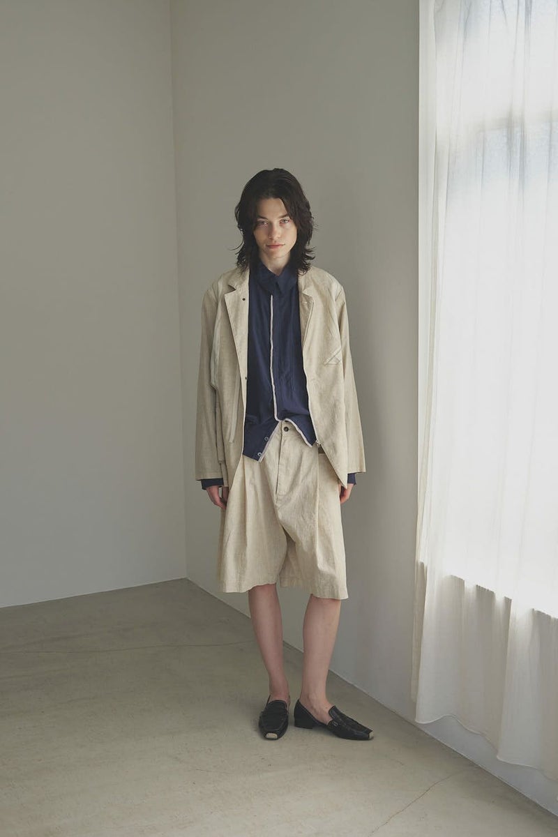 職人技をあえて見せる、インサイドアウトデザインのリネンジャケット。 ゆとりのあるシルエットながら、袖付けには裄綿(ゆきわた:ジャケットやコートの袖山に入れる芯地)を仕込み、だらしなく見えない凛とした佇まいに。 フロントに差し込んだファスナーを閉めれば、ブルゾン感覚でも着られる2WAY仕様です。 素材にはネップ感の残る粗野な雰囲気の綿麻キャンバスを採用。 麻の光沢と綿の素朴さが混ざり合い、リラックス感と上質感を併せ持つ独特の表情に仕上げています。 そして最大の特徴は、スーツ職人の技術をあえて表に出した“インサイドアウト”デザイン。裏地を修正しやすいように考えられたお台場仕立ての見返しをアシンメトリーに配置することで、デザイン性を増しています。 バックスタイルはシンプルな表情に抑え、フックベントやキッスボタン(重ねボタン)など、本来は裏側に隠れるディテールを前面に。 これはスーツ工場の職人の技術をアピールするためだけに考えられた遊び心あるデザインです。 ●2サイズ展開 ●リネンハーフパンツ(26155-9904P)とセットアップ可 ●手洗い可