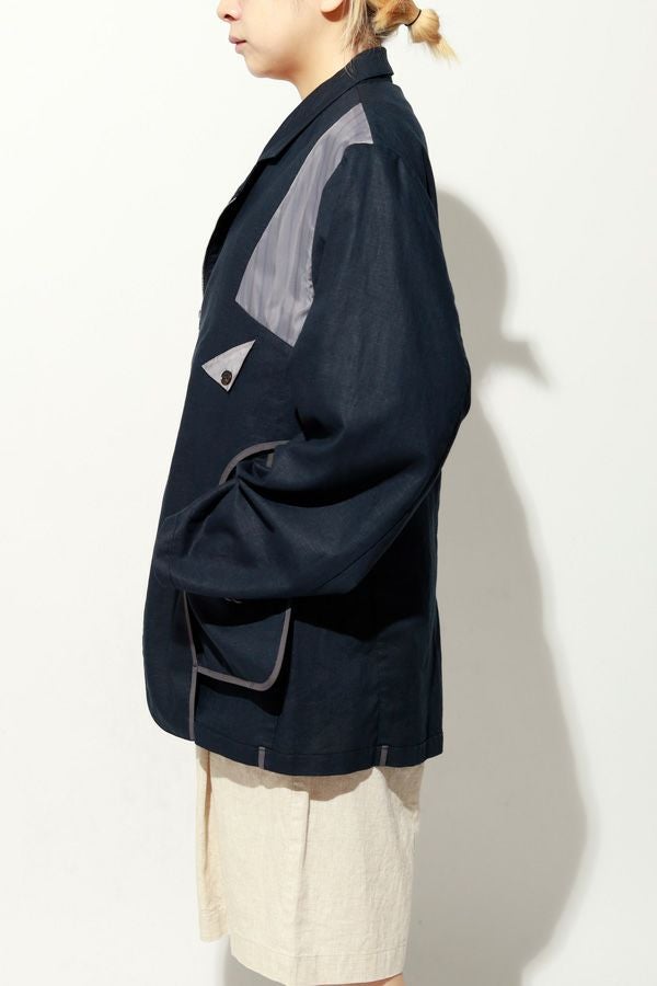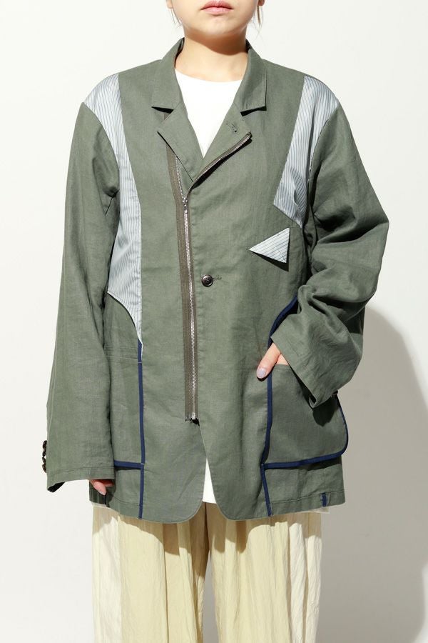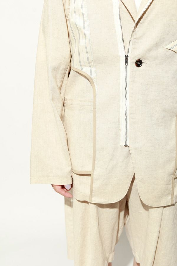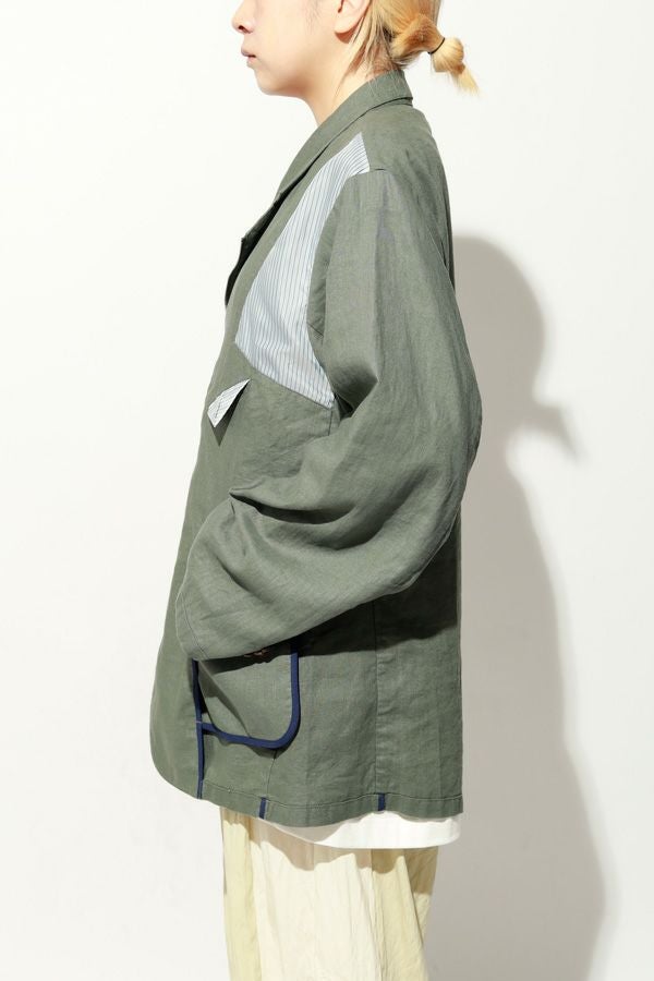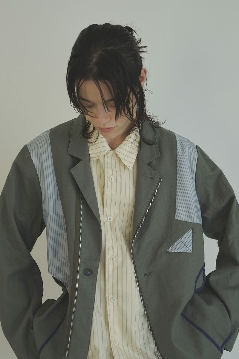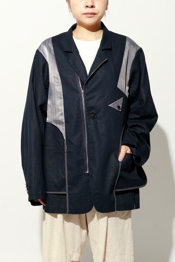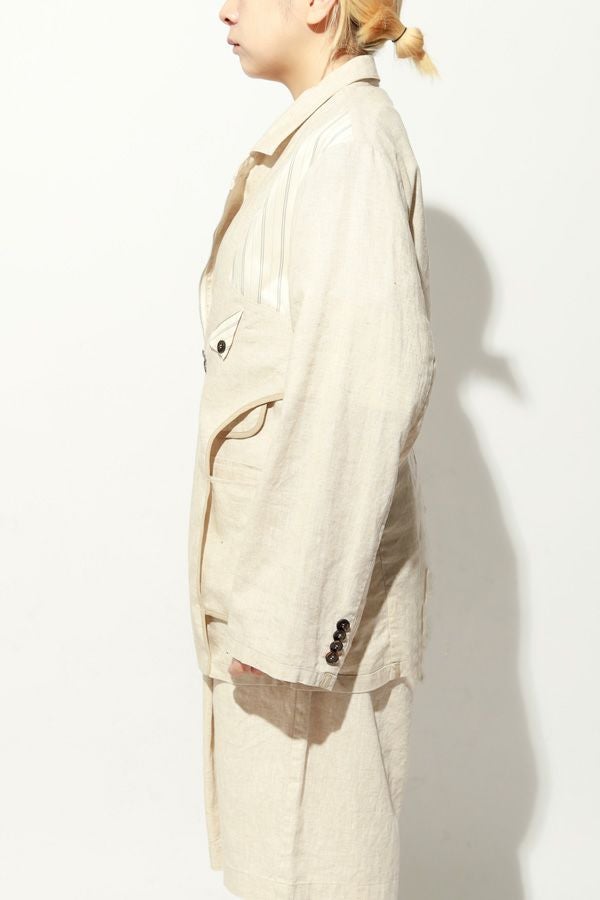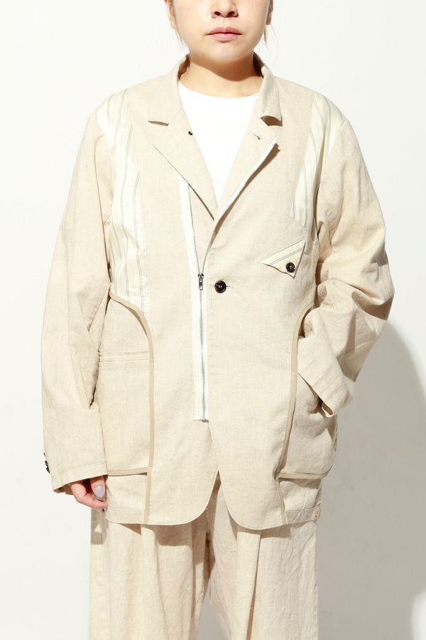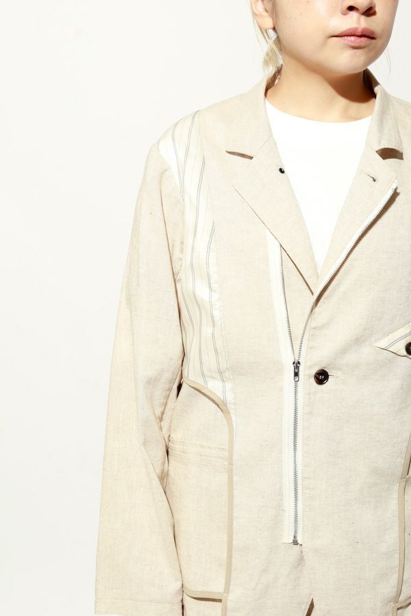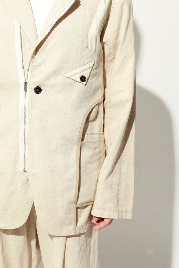 職人技をあえて見せる、インサイドアウトデザインのリネンジャケット。 ゆとりのあるシルエットながら、袖付けには裄綿(ゆきわた:ジャケットやコートの袖山に入れる芯地)を仕込み、だらしなく見えない凛とした佇まいに。 フロントに差し込んだファスナーを閉めれば、ブルゾン感覚でも着られる2WAY仕様です。 素材にはネップ感の残る粗野な雰囲気の綿麻キャンバスを採用。 麻の光沢と綿の素朴さが混ざり合い、リラックス感と上質感を併せ持つ独特の表情に仕上げています。 そして最大の特徴は、スーツ職人の技術をあえて表に出した“インサイドアウト”デザイン。裏地を修正しやすいように考えられたお台場仕立ての見返しをアシンメトリーに配置することで、デザイン性を増しています。 バックスタイルはシンプルな表情に抑え、フックベントやキッスボタン(重ねボタン)など、本来は裏側に隠れるディテールを前面に。 これはスーツ工場の職人の技術をアピールするためだけに考えられた遊び心あるデザインです。 ●2サイズ展開 ●リネンハーフパンツ(26155-9904P)とセットアップ可 ●手洗い可