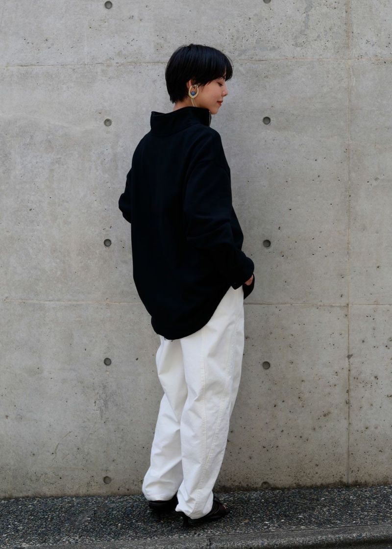 しっかりとしたウェイトの裏毛素材で、カジュアルすぎない印象に仕上げたプルオーバー。 身幅はゆったりしていながら、すとんと落ちるすっきりしたシルエットに。お袖はあまり太くしすぎず、袖口はシャツの様なケンボロ仕様で少しきちんと感もプラス。 ハーフジップの裏にテープをかませて肌に金具が触れないようにしております。スウェットではカジュアルすぎるという方に、オススメのアイテムです。