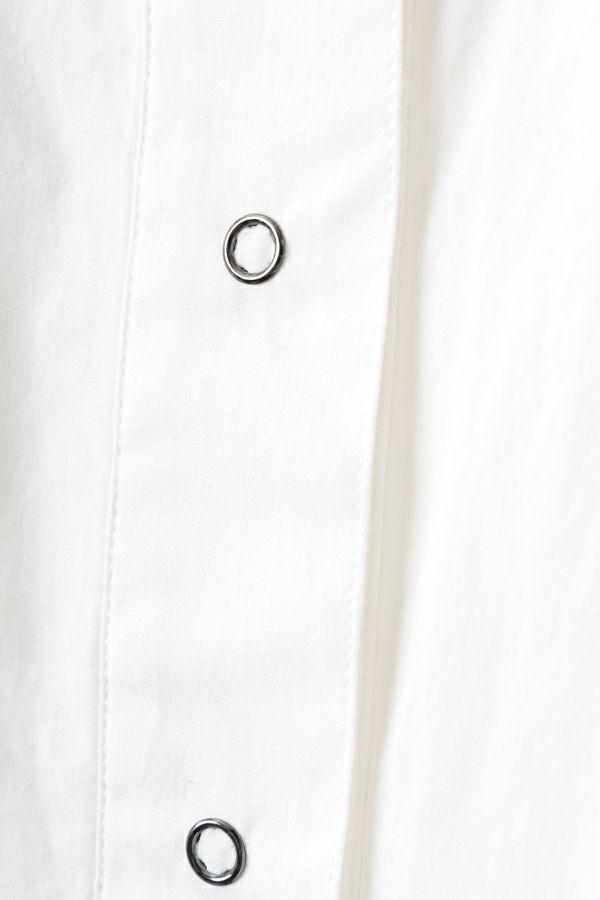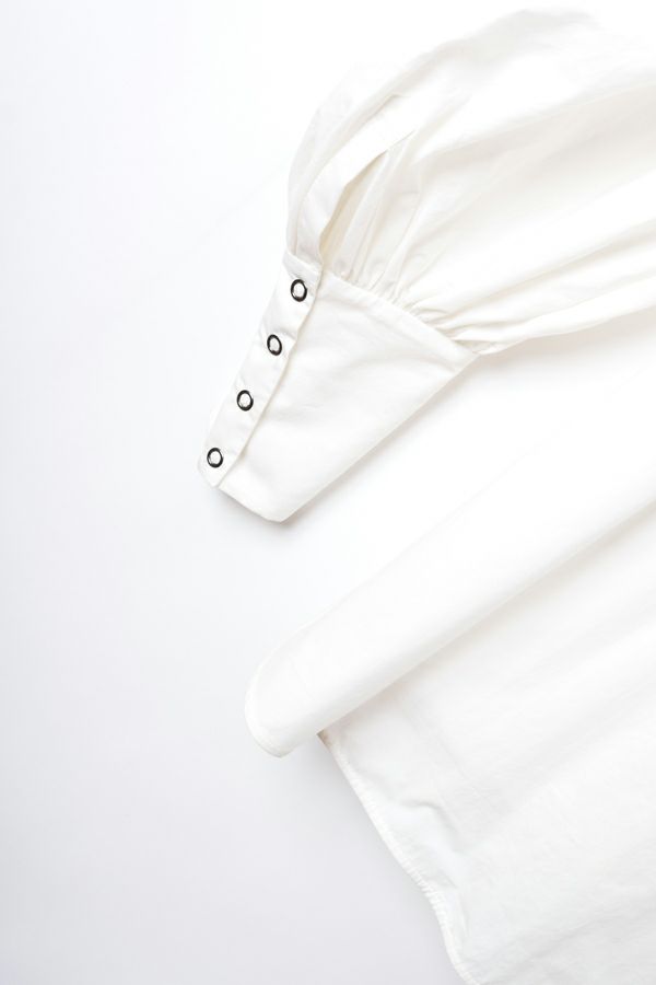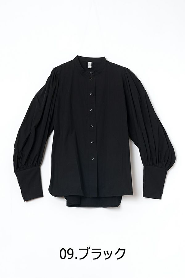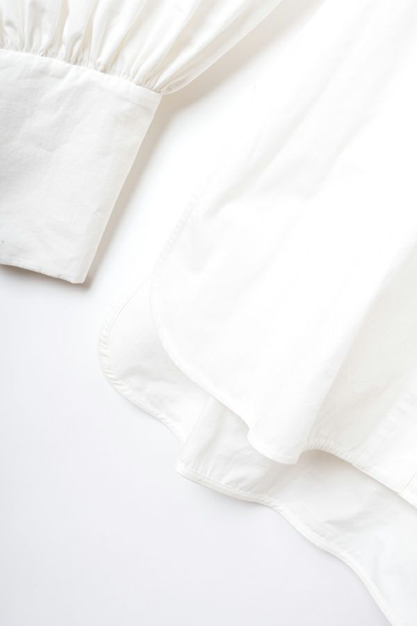 大胆なボリュームのお袖が特徴的なコットンシャツ。 張り感のある素材で構築的なシルエットに。 裾のカーブラインは脇で曲線で繋げて柔らかい印象になり、後ろヨークはウエスティンシャツのカットでワンポイントプラス。 360度どこから見ても抜かりない拘りのシャツです。