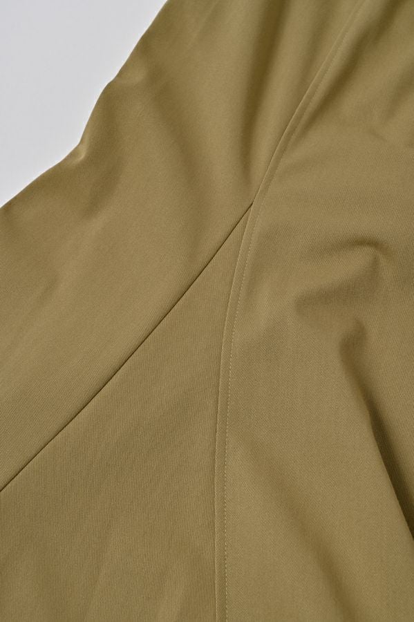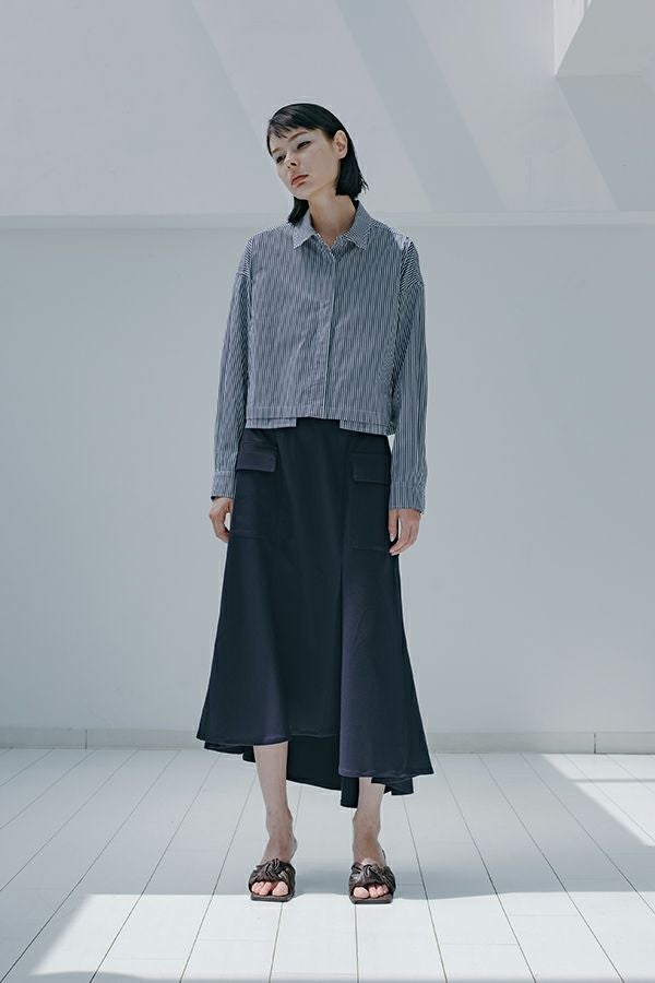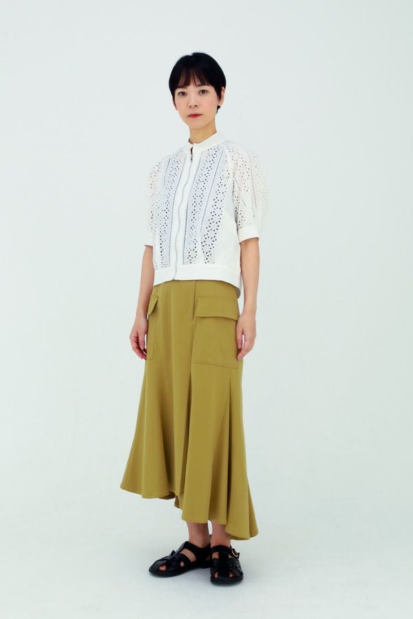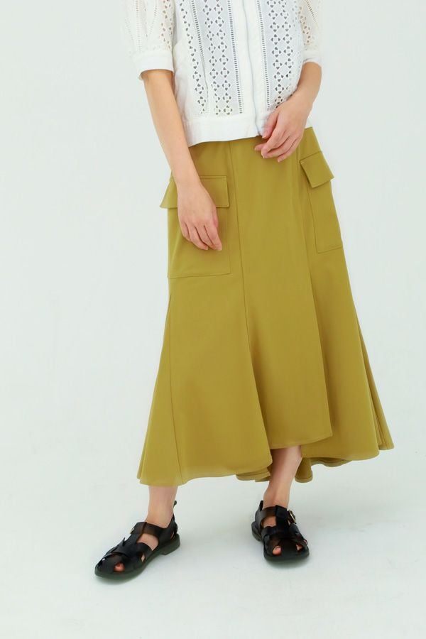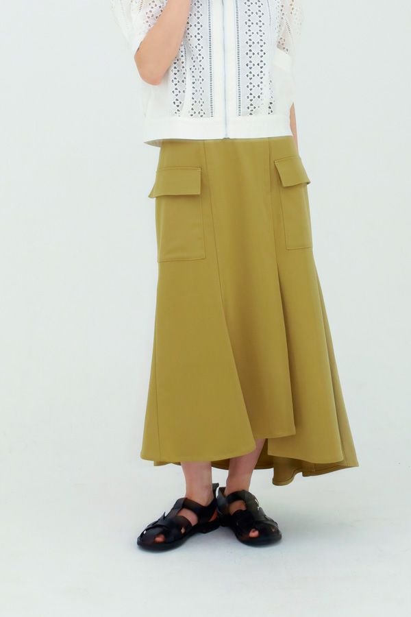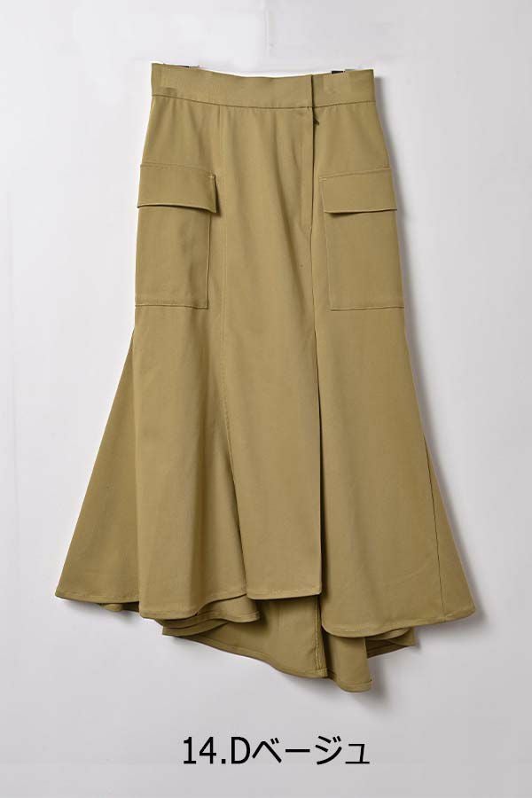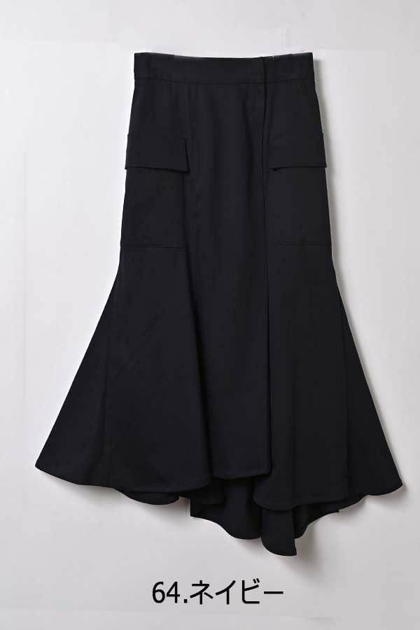 アシンメトリーヘムでANGELINAっぽいミリタリーディティールのマーメイドスカート。 左前のベンツ開きがポイントです。後ろウエストはゴムが入っているのでアジャスト可能です。ショート丈のジャケットやブルゾンと合わせたスタイリングがおすすめです