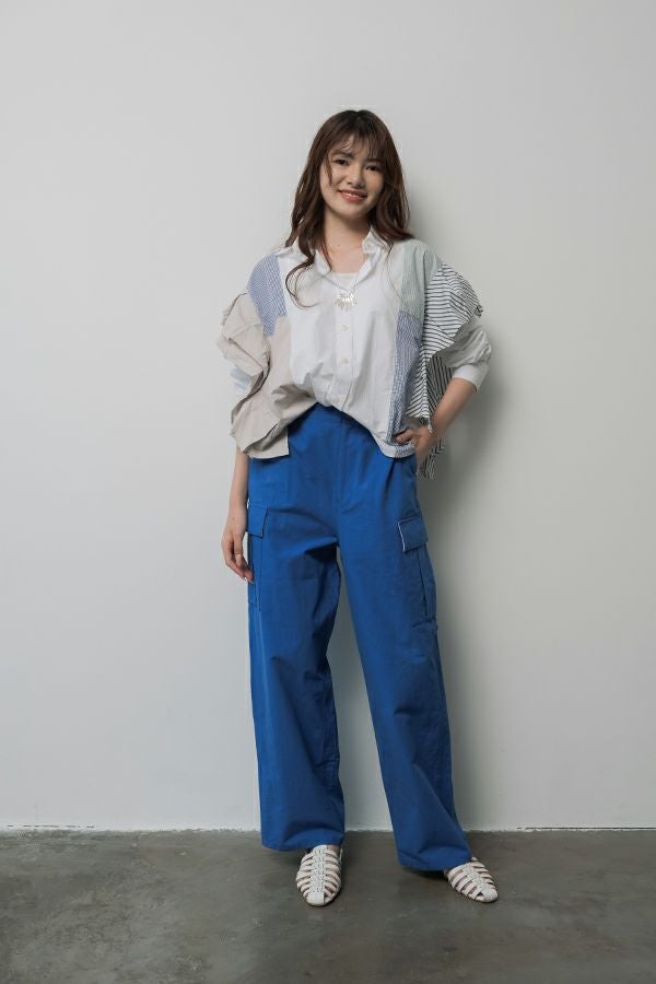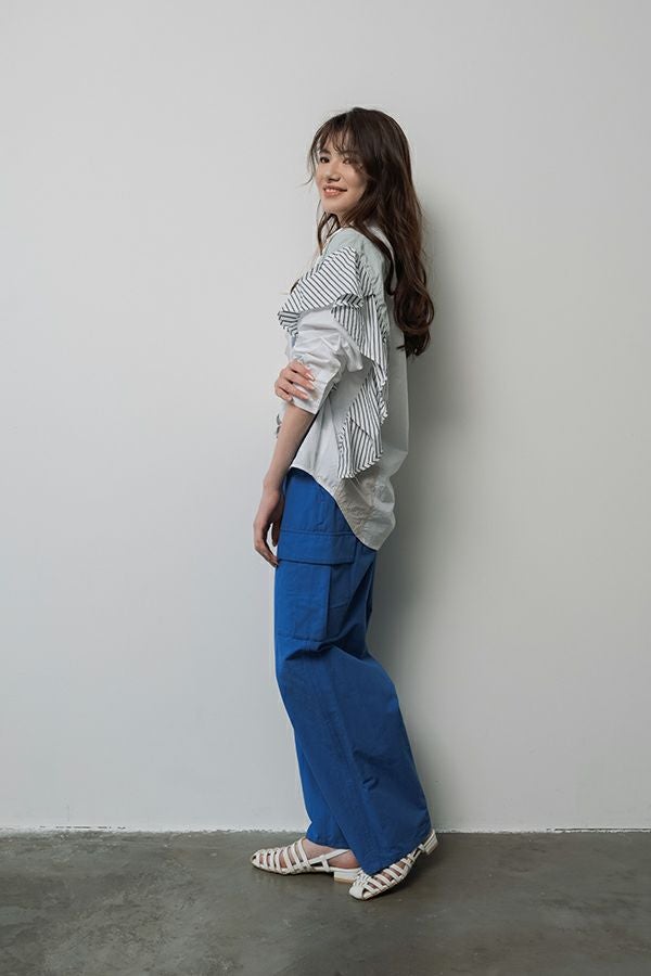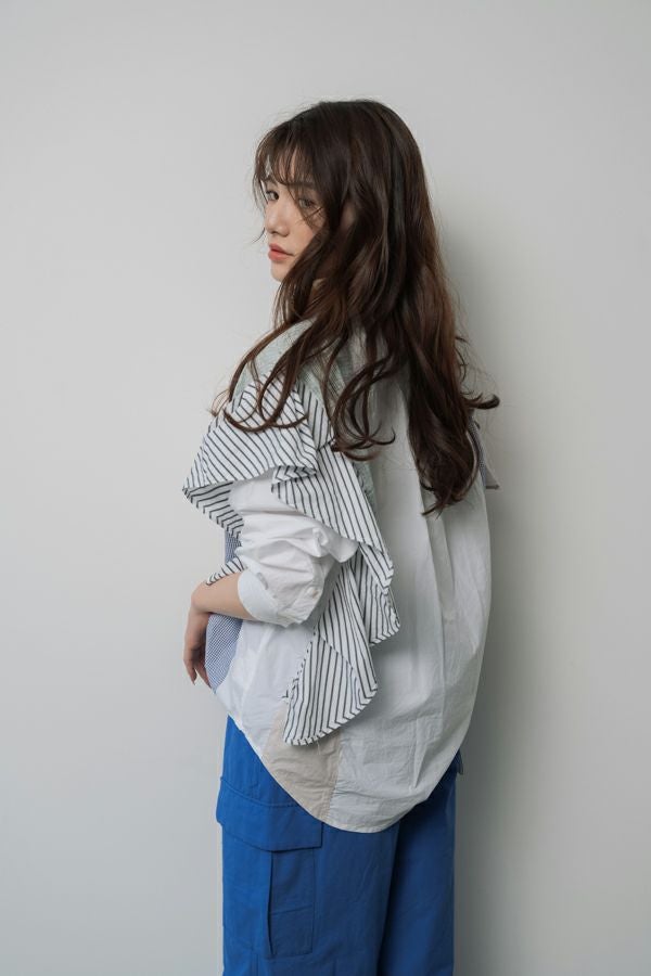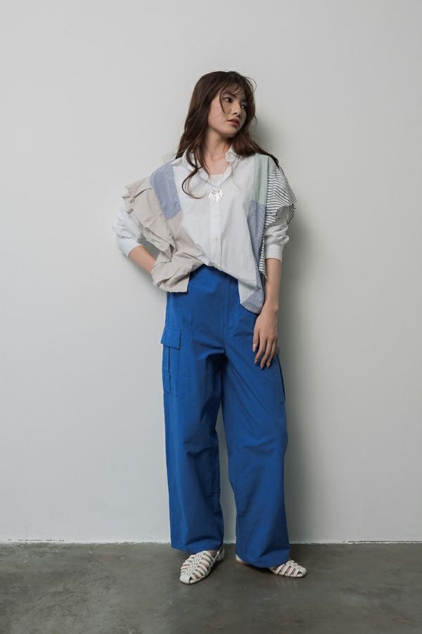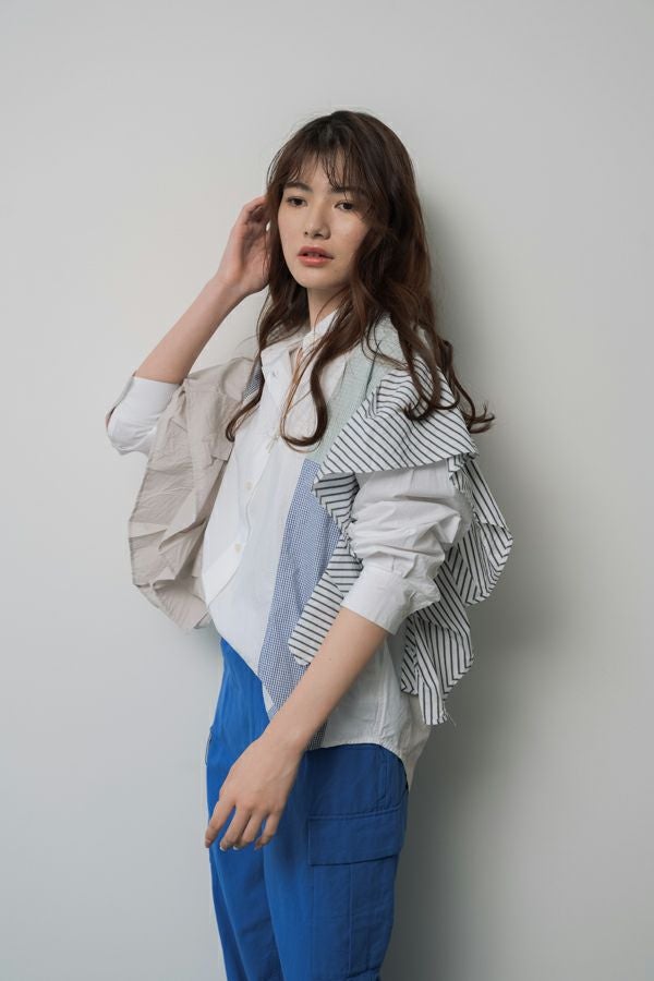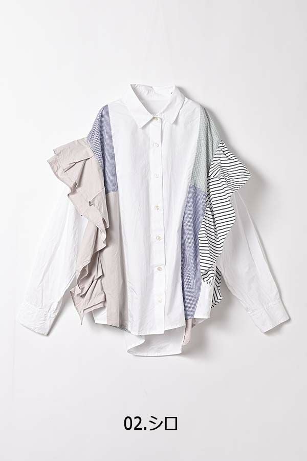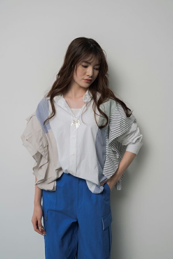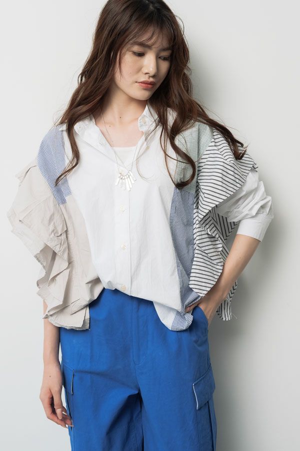 存在感のあるフリルが目を惹く、デザインブラウス。 組み合わせる生地を左右アンバランスに散らし、肩先からストンと落ちる位置からのフリル + 製品洗いで、甘く見えがちな印象を大人カジュアルに仕上げた一枚。小さめの衿にすることでシャープさもプラス。