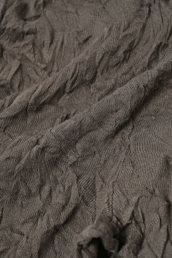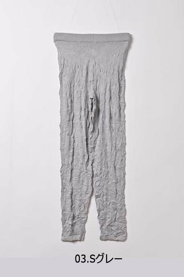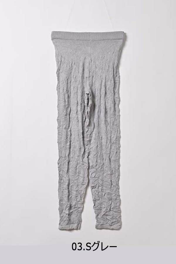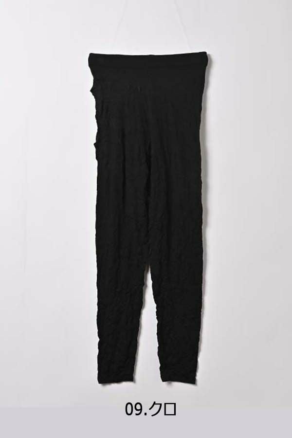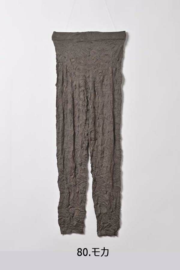 定番ロングランヒットで作り続けているシワ加工シリーズのパンツが出来上がりました!プルオーバー同様、肌触りが良く足にもくっつき過ぎないシルエットがワンピースやスカート、幅広のパンツの下にも合わせられ、足を出したくないお客様にも喜んで頂けるアイテムになっています。無地で4色展開。色違いで何本も欲しい!綿とポリエステルの混紡素材で、ソフトな肌触りなので、真夏以外 年中着用可能です。シワ加工に必ず必要なポリエステルは、ポリステルの特徴である熱に強く一度熱で変形させると元に戻らない性質を利用。ポリステルの混率が高いほどシワ加工のセット性も高くなります。今回ポリエステルの特性を生かして肌に優しい天然繊維の綿素材との混紡素材で市場では少ないシワ加工商品は希少価値大です。