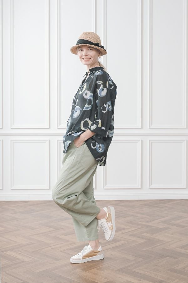 akaneオリジナルのサークルドットプリントは清涼感のある、ゆったりとしたAラインブラウスです。 部分的に使った3つの素材が効果的です。 衿元と後ろのギャザー、紐(ドローストリング)でゆるふわフォルムを楽しめます。 大きく開いた前のスリットは首を長く見せ、太めの袖は動きやすく腕をスッキリ感じさせます。 ヒップが隠れる丈なのでパンツ合わせがGOOD!