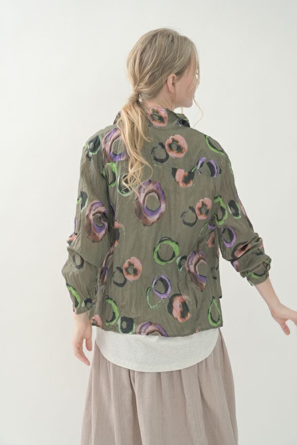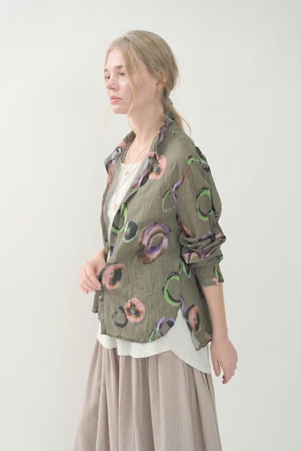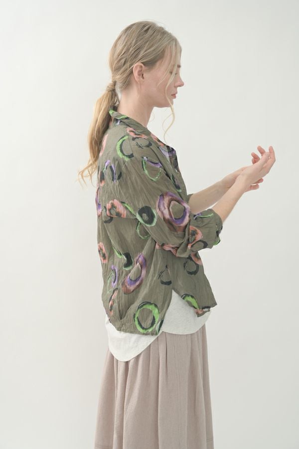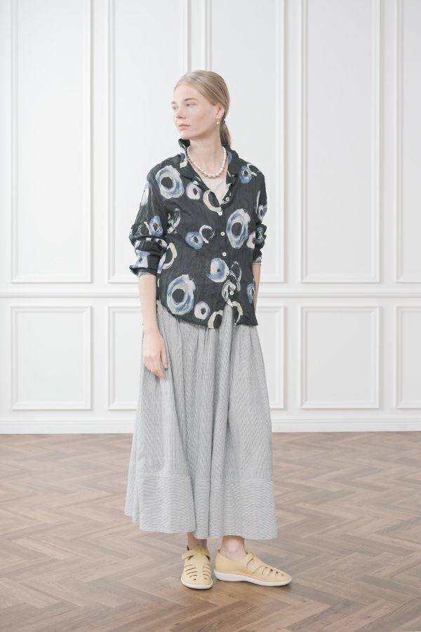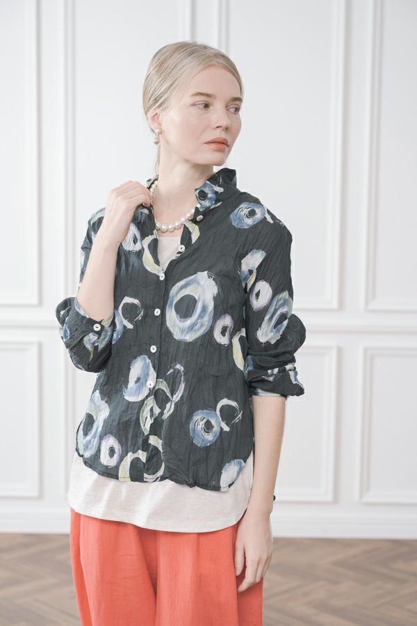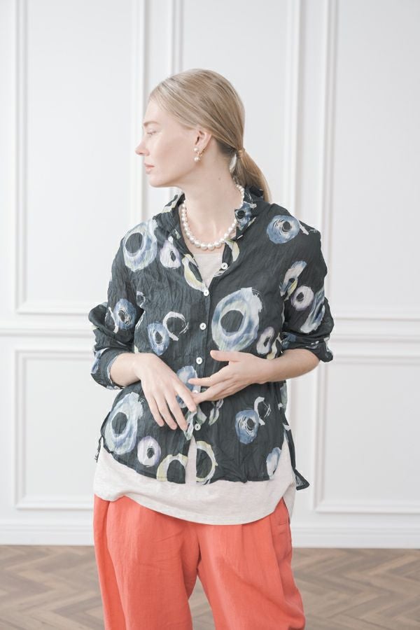 akaneオリジナルのサークルドットプリントはスッキリとしたカラーで動きのある柄です。 ワッシャー加工を施しているので、洗濯や保管に気を使わず、サッと羽織れるブラウスです。並んだ釦が可愛らしく、釦を大きく開けると首を長く見せれます。 旅行や持ち歩きにも最適のアイテムです。フワッと広がるギャザースカートを合わせてるとバランス良く見えます。