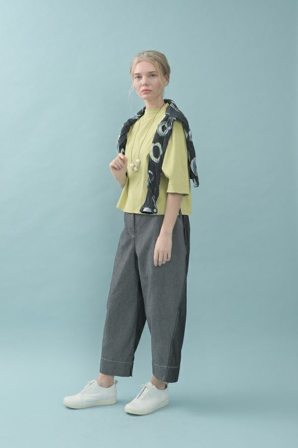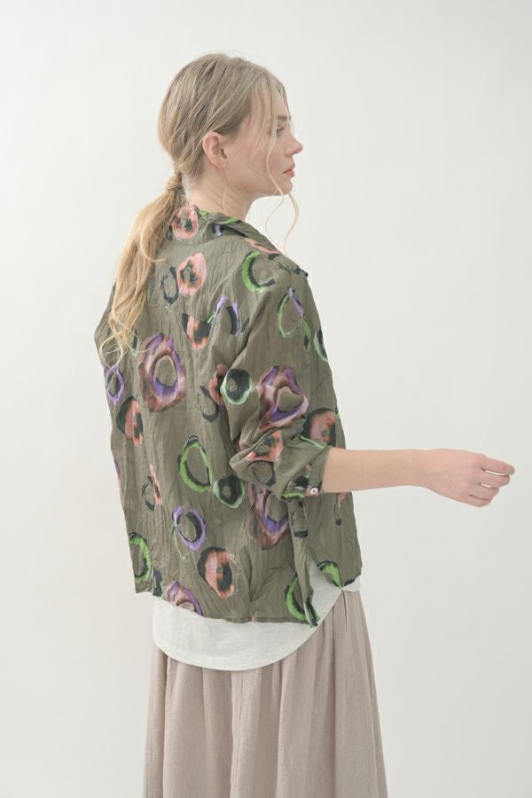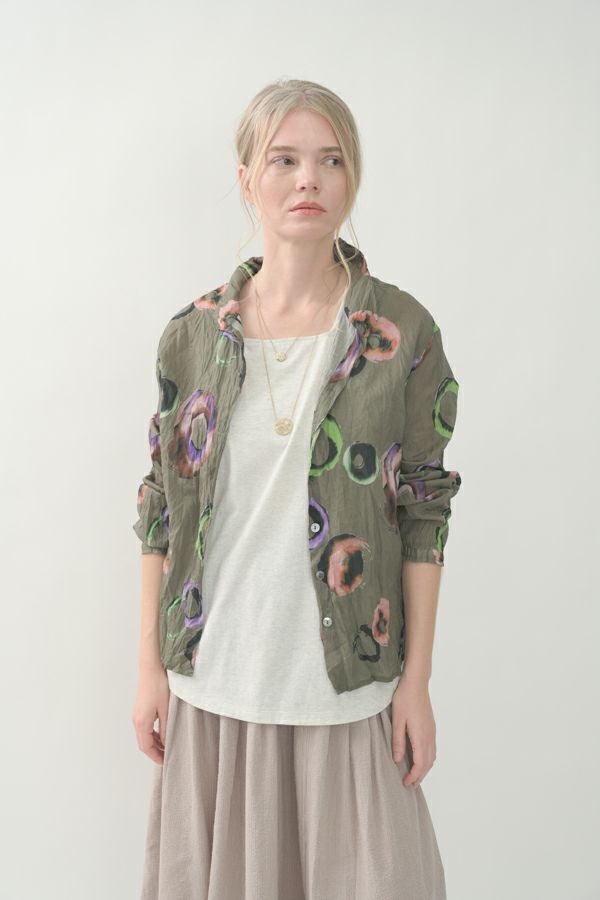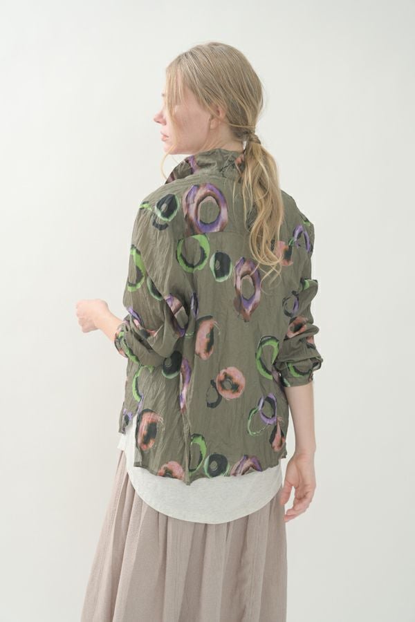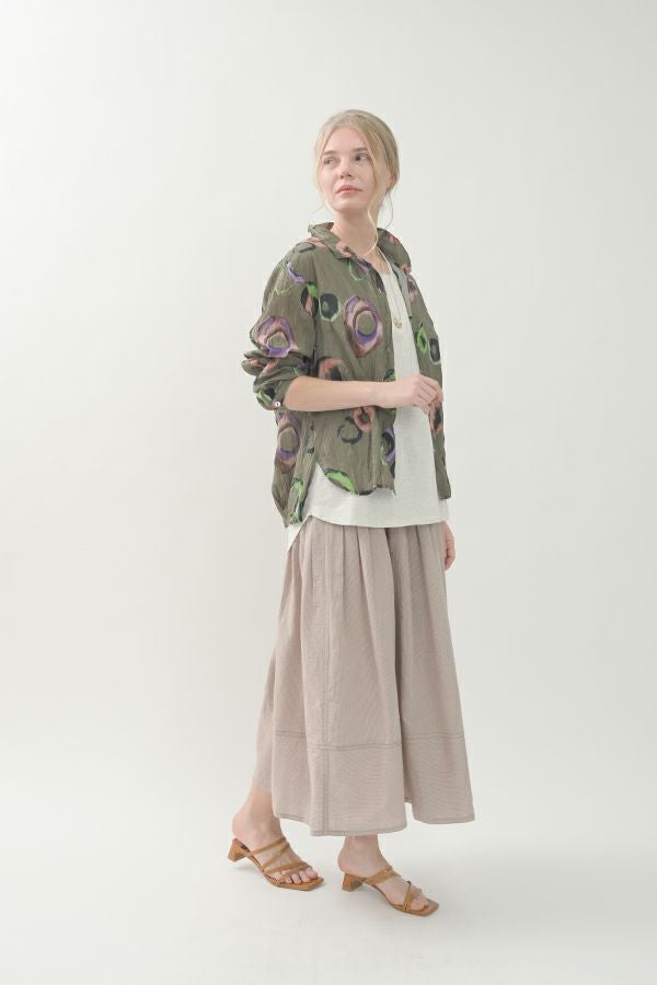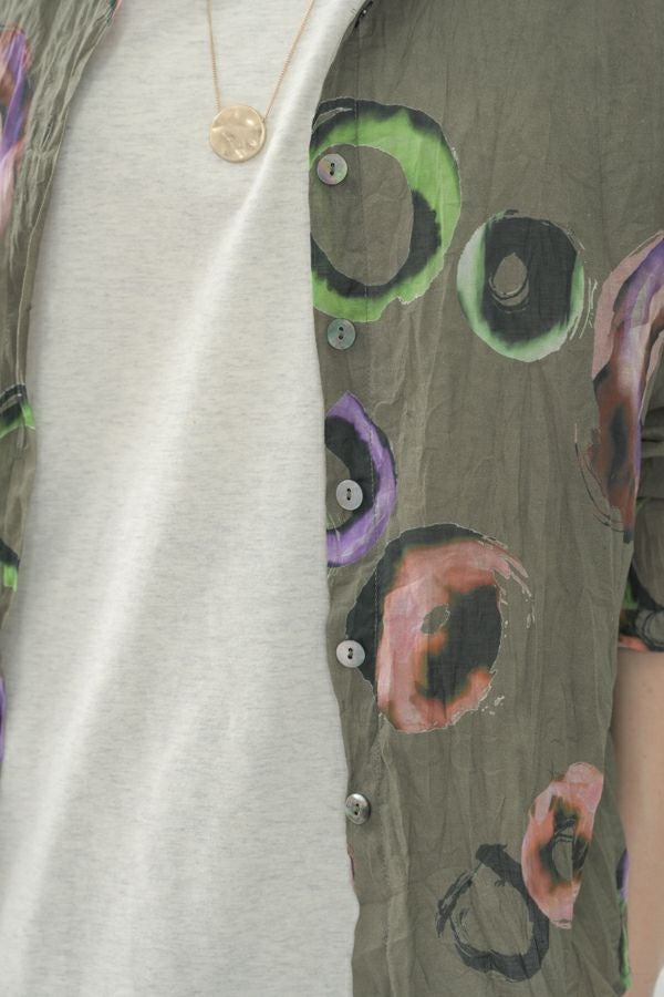 akaneオリジナルのサークルドットプリントはスッキリとしたカラーで動きのある柄です。 ワッシャー加工を施しているので、洗濯や保管に気を使わず、サッと羽織れるブラウスです。並んだ釦が可愛らしく、釦を大きく開けると首を長く見せれます。 旅行や持ち歩きにも最適のアイテムです。フワッと広がるギャザースカートを合わせてるとバランス良く見えます。