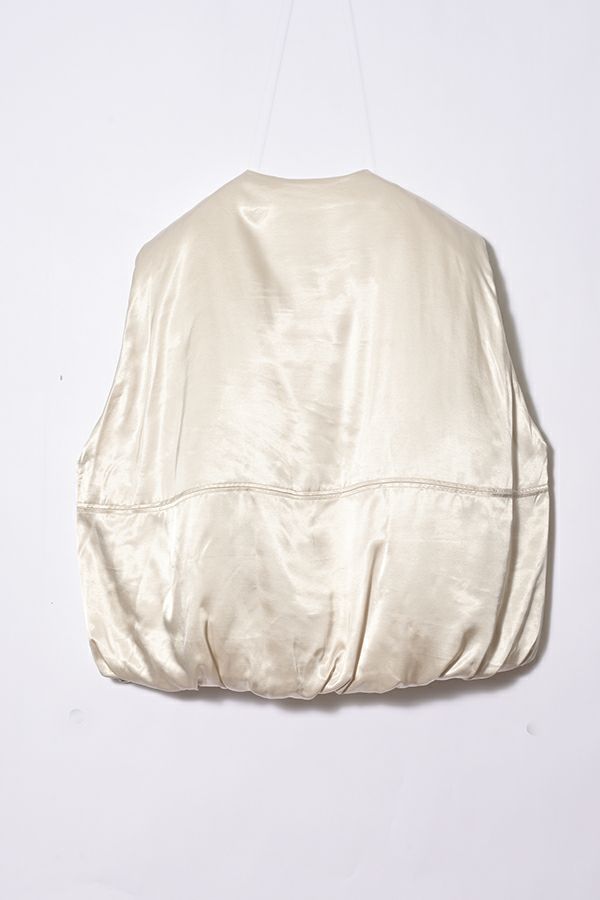 しっかり中綿を入れ、丸みを帯びたビッグシルエットのベストはマニッシュとフェミニンを絶妙に持ち合わせた1着です。ジャケットの上からでも着られるサイズ感で、サテン地なのでカジュアルになりすぎず、キレイめコーデを少し外したいときのアイテムとして活躍すること間違いなし!