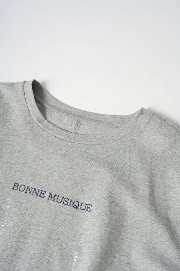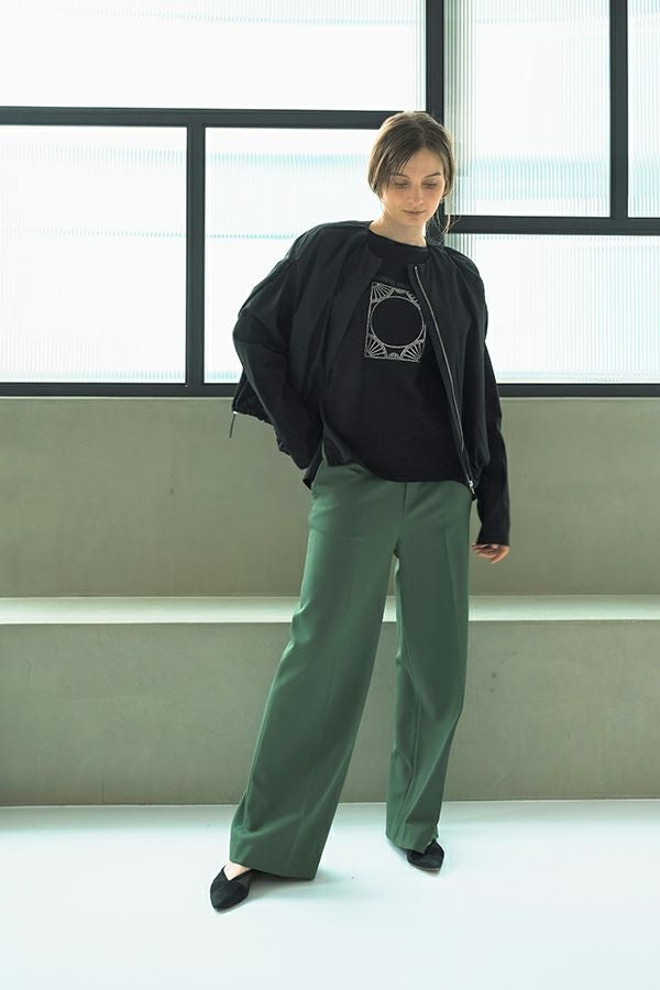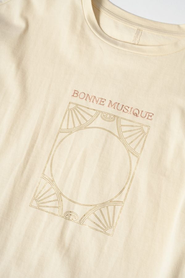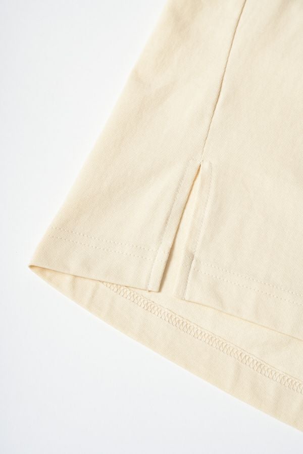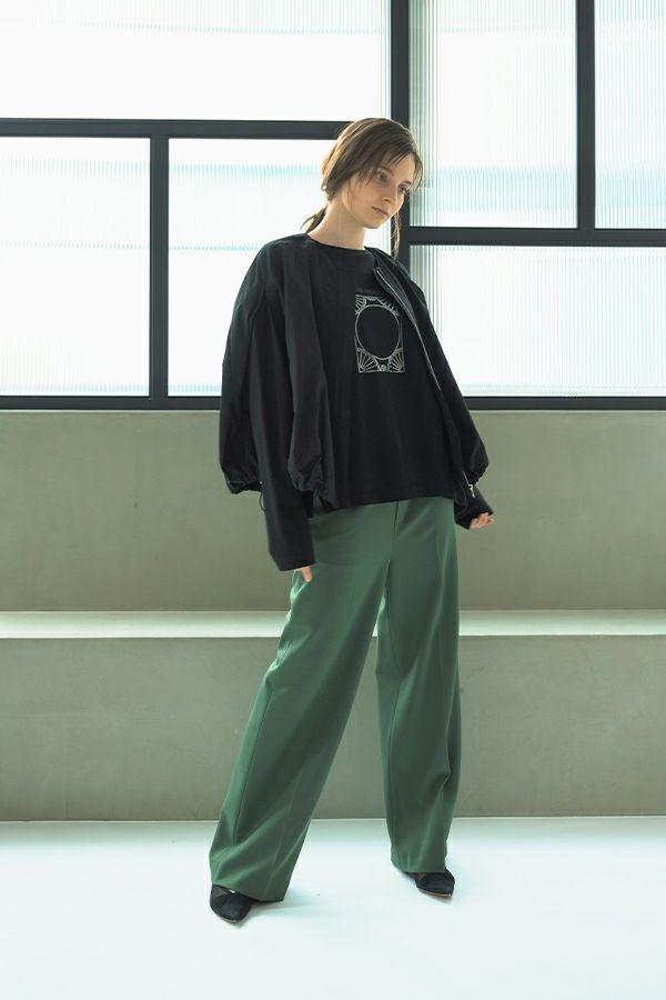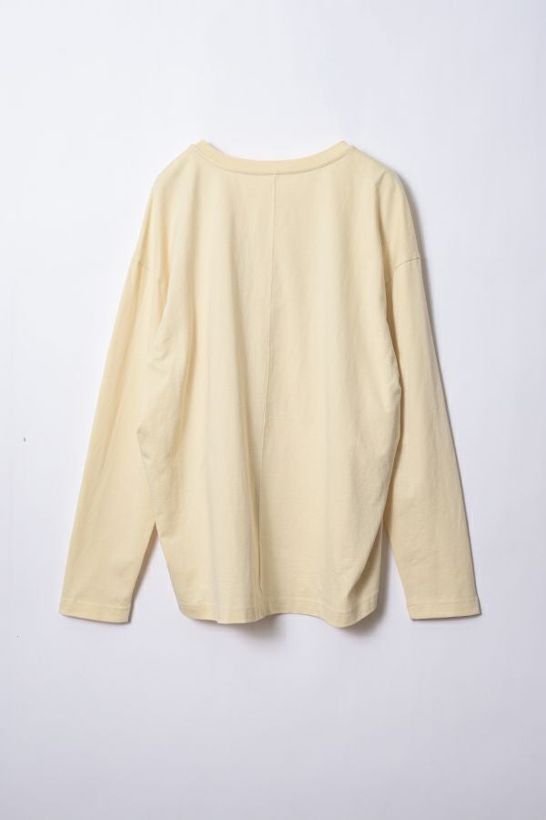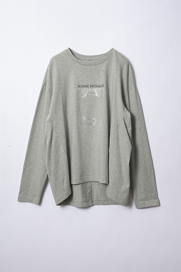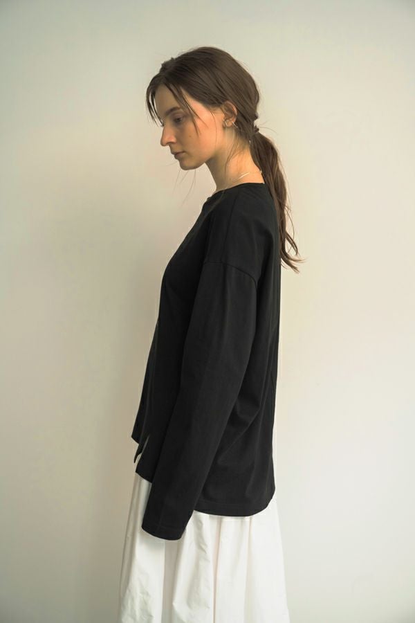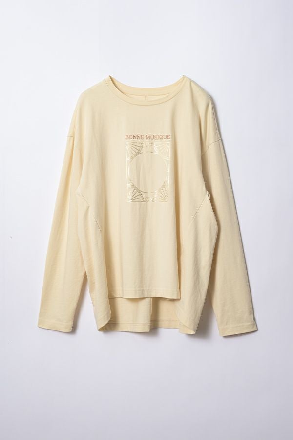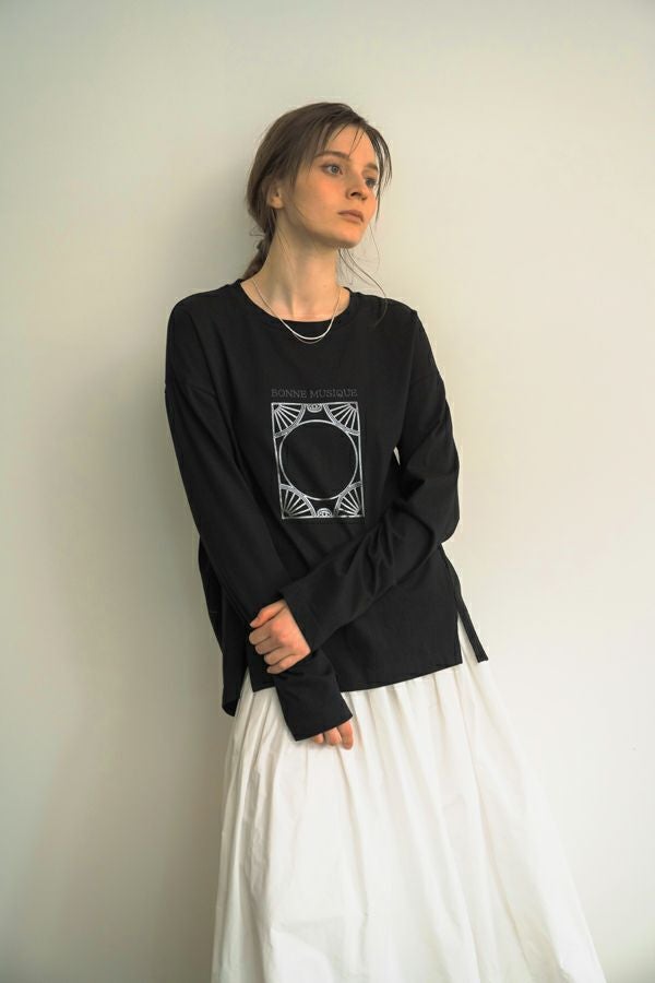 デイリーに使いやすい長袖ロゴTシャツ。コットン100%のサラッとした肌ざわりが心地よく、両脇に入ったタックと裾のスリットで自然なニュアンスを作ります。 首元はミニマルなクルーネック。程よいオーバーサイズ感で胸元のシャープな箔プリントがポイントになっています。 ベーシックなアイテムなのでスカートなど甘さのあるボトムと合わせたり、カラーパンツや柄ボトムなどと合わせた、旬の着こなしもおススメです。