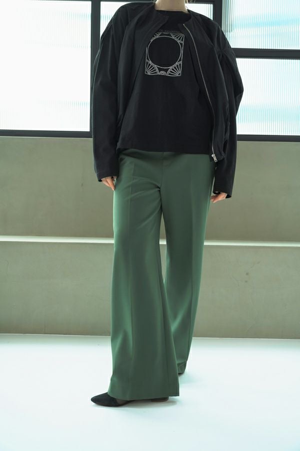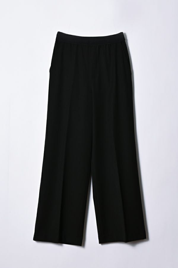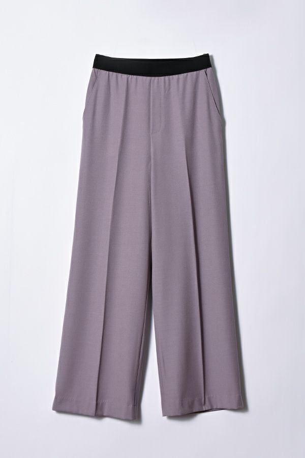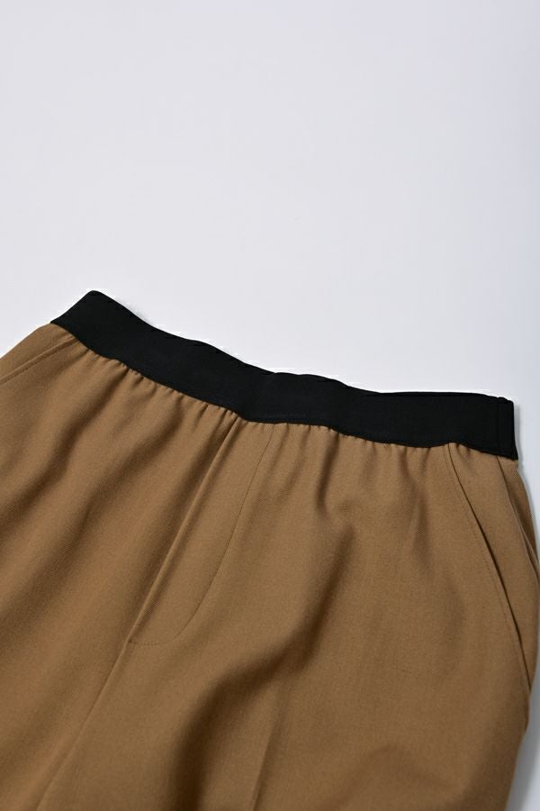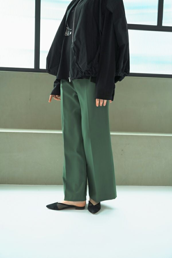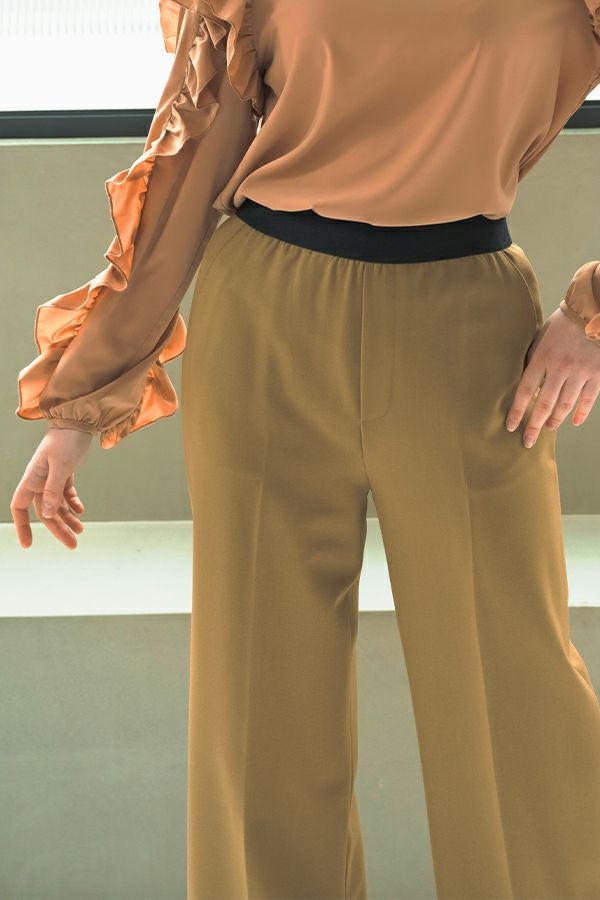 綺麗なシルエットでウエストゴムの万能セミワイドパンツ。 素材にウールが少し入った、微起毛がかった表面生地でウォーム感があります。 深みのある穏やかな秋らしいカラー展開となっています。落ち感のある生地感とセンタープレスの入ったラインで、脚のラインを拾わず脚長に見えます。 トップスのバランスを選ばず汎用性の高いパンツなので、何にでも合いますがキレイめなパンツなので、足元にはスニーカー合わせが可愛いいのでおススメです。