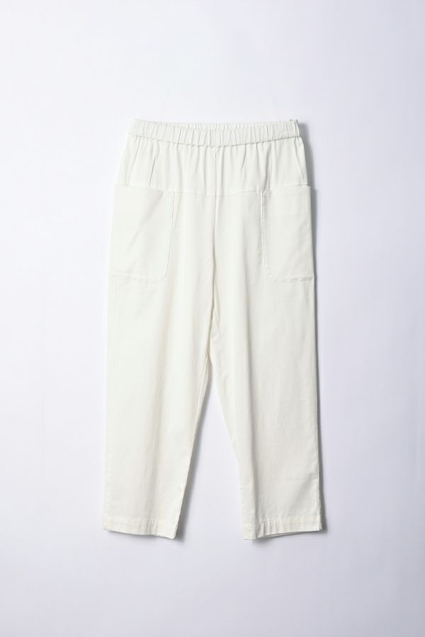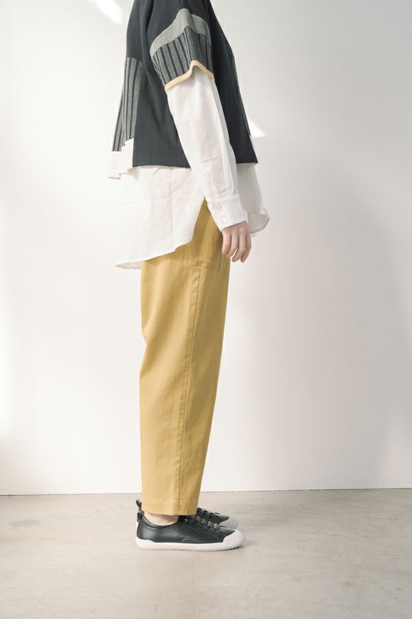 ストレッチ抜群!カジュアルでもきれいめでも着こなせるフルレングス丈のスリムパンツ。 ウエスト総ゴムで伸びを確保しつつ、中ヒップの切替えがポイント!お腹廻りがギャザーで膨らまず もたつかないのでスッキリ見えます。ヒップと太腿はサイドに付いた大きなパッチポケットが体型カバーの役割に。膝下からはふくらはぎのシルエットが出ない絶妙な分量感が嬉しい1着。 特殊な洗い加工を施し、ソフトで光沢感のある風合いに。膝がでにくくシワになりにくいのが特徴です。目を惹くイエローが着こなしのアクセントに! ライトブルゾン(24228-6526C-R/24228-6521M-R)や、ヒップが隠れるトップス(24228-1573J-R)などの下に合わせてスッキリ着こなすのがおススメです。