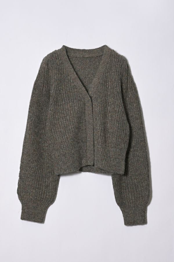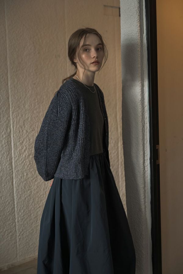 トレンドであるグリッター素材の糸で編み上げた、オケージョンにも相応しい華やなカーディガン。 肩幅を小さくして、袖の付け根部分にタックと程よいボリューム感のあるスリーブシルエットでドラマチックに仕上げました。オケージョンスタイルにもスタイリングしやすいように、スッキリとした衿に前立てのグログランテープがアクセントです。 腰より少し高めの位置に設定した裾リブが、着用時に目線が上がるようデザインされているので、ハイウエストのスカートやボリュームシルエットのボトムスを合わせるとスタイルバランスがよいです。