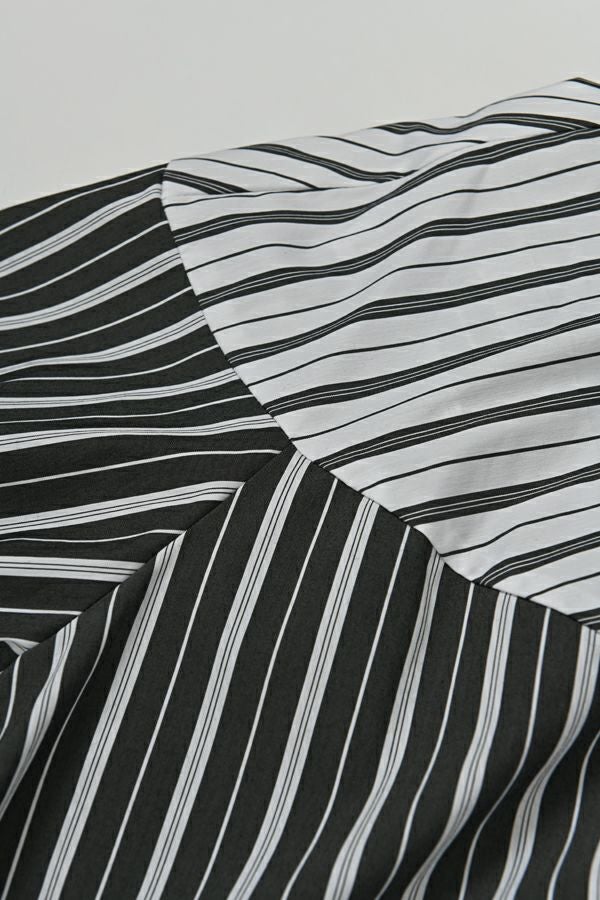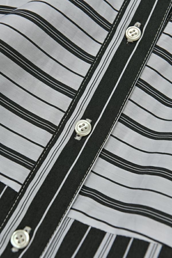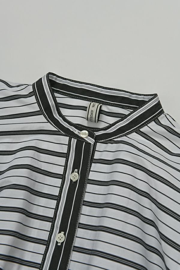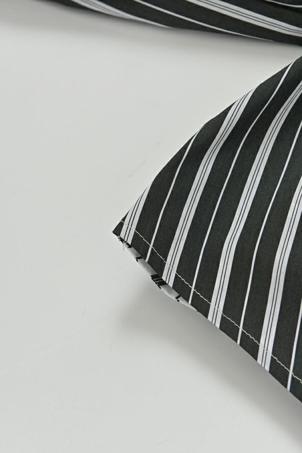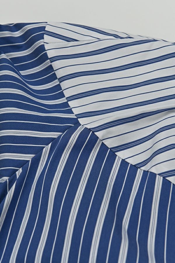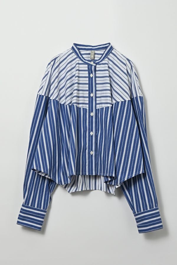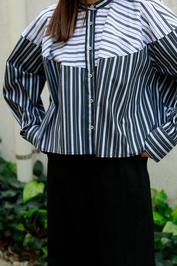「1枚で主役級!」立体感が際立つシャツブラウス。 2配色のストライプ使いのインパクトに加え、フレアーの入れ方と切替が立体的な構造が、まるでランタンを思わせるような特徴的なシルエットに仕上がりました。 短丈でシャツ地を使用しているので、風通しも良く軽やかに着用頂けます。ワンピースなどに合わせる羽織としてもスタイルアップ効果を維持してくれ、シルエットにメリハリが出てこなれ感を演出できます。 短丈のトップスはバランスが取りやすいのでどんなボトムにでも相性良◎ ●同型で無地タイプ(25153-4025P)も有。