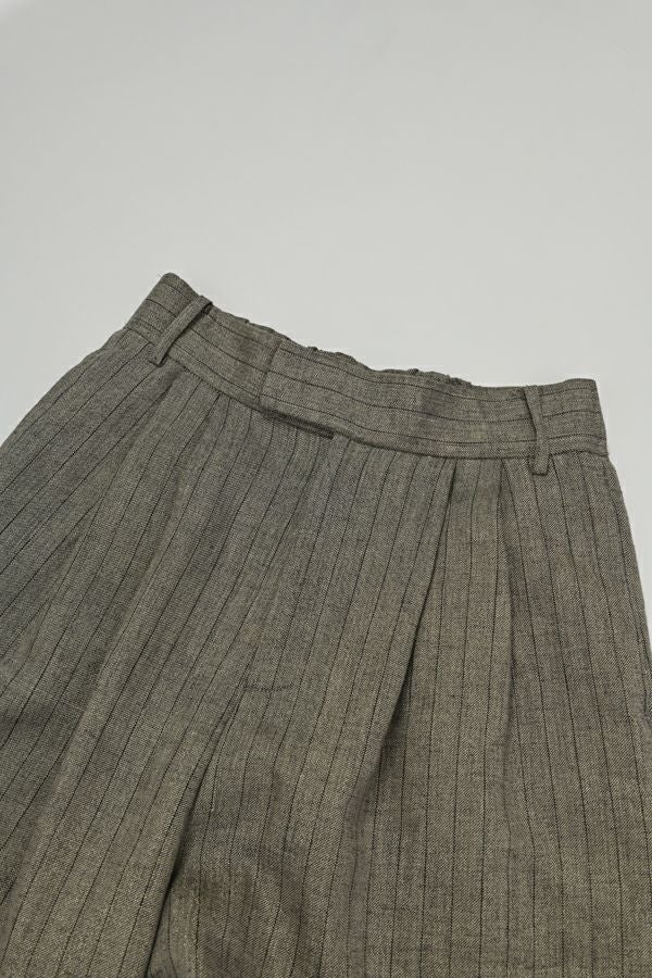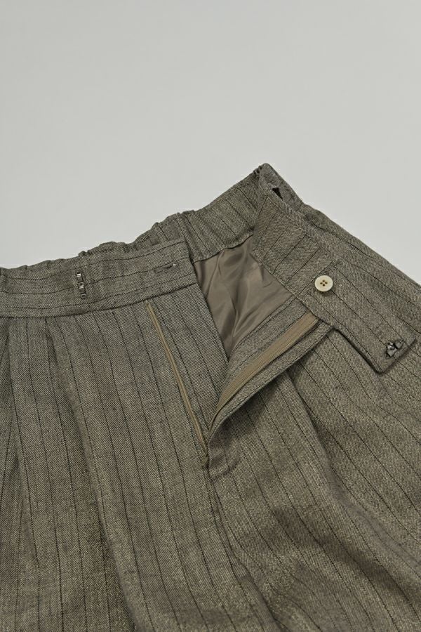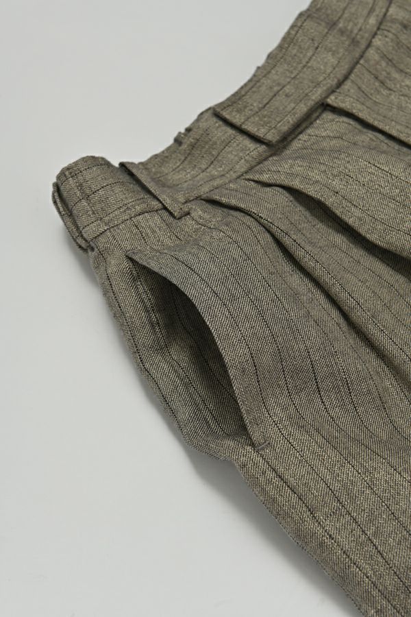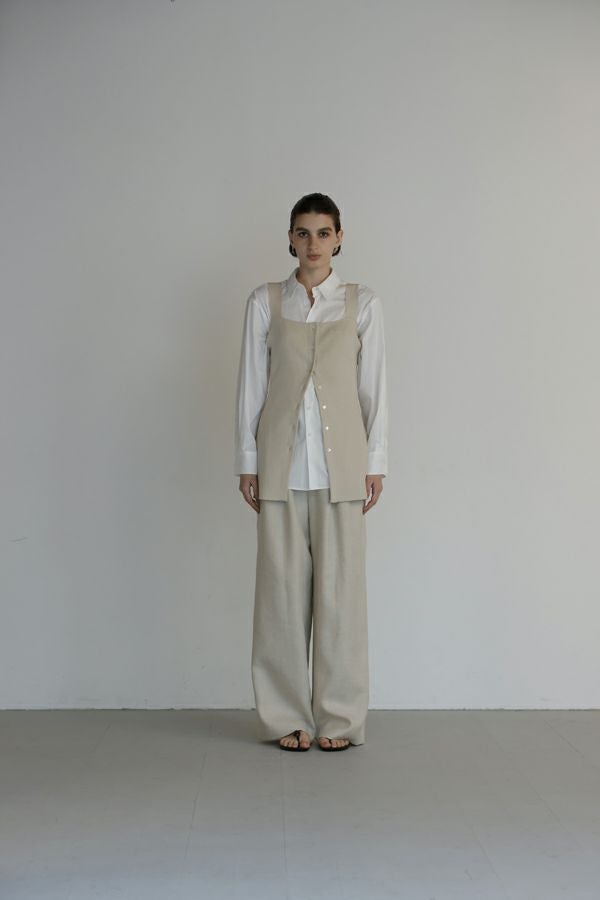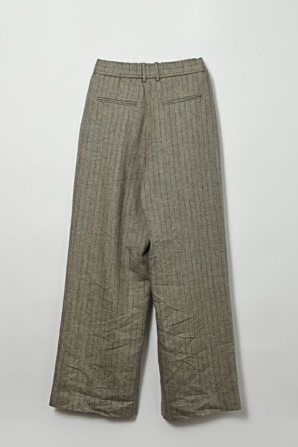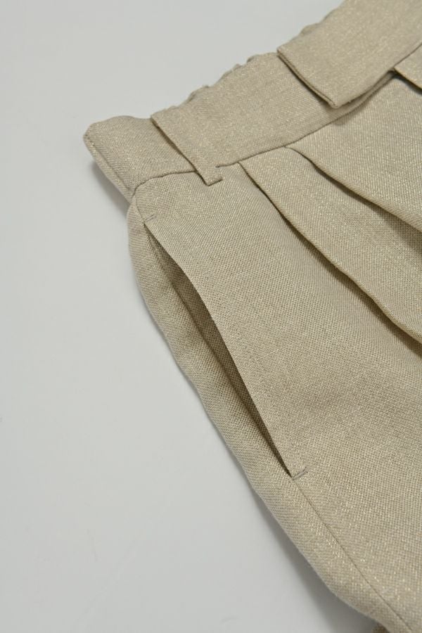 拘りが光るラグジュアリーなワイドパンツ。 リネンのナチュラルなフシを活かしたツイルの表面感と、リネンの持つ清涼感にラメ糸を打ち込んだ素材です。【 同品番で無地ベースとストライプベースの2パターン展開。】 印象的な素材なのでデザインはシンプルに、シルエットはボリューム感を持たせたワイドストレートに仕上げました。 シンプルなトップスでも決まりますし、袖にボリュームのあるようなフェミニン要素のあるトップスとのコーディネートもおすすめです。バッグやシューズに皮素材のものを合わせれば甘くなり過ぎなくて◎ ●2サイズ展開 ●同素材でラメリネンベスト(25153-5018Y)も有。 ●セットアップ可 ●日本製