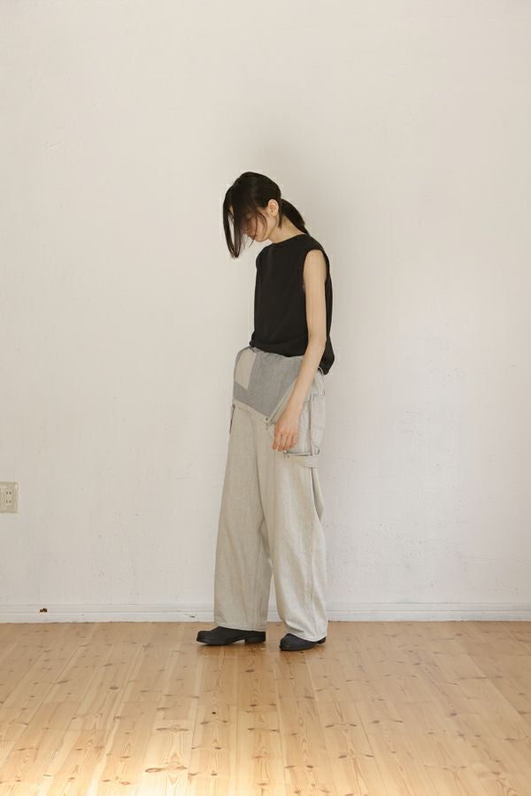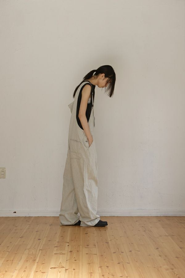 ゆったりとしたシルエットの大人オーバーオール。 生地に特徴があるので、デザインは極力シンプルに。 生地とデザインが上手く融合することで、カジュアルダウンしすぎない抜け感とラフさを表現しています。 ゆるシルエットなので、胸当て布を下ろして着用した際に両脇のベルトループが機能を発揮!ベルトを使えばズレ防止で、安心して着用できます。 前身頃の内側には、胸当てを下ろして着用した際に使用できるポケットのおまけつき。 インナーに厚手のものが着れるサイズ感なので、様々なシーズンで着用可能です。 使用した8.5OZ(オンス)のデニムは、リサイクルデニムを使用。デニムを裁断した時に発生した裁断くずを、綿(わた)に戻し、糸状へ形成。そのリサイクル糸を使用し、新しいデニムを織っています。元々の生地の風合いを残したリサイクル方法なので、インディゴカラーがうっすらと残っていますので、裏柄が薄いブルーになっています。 ホワイトデニムで、裏の糸を変更するのは、昔汚れを目立たせないようにするローテクの機能です。