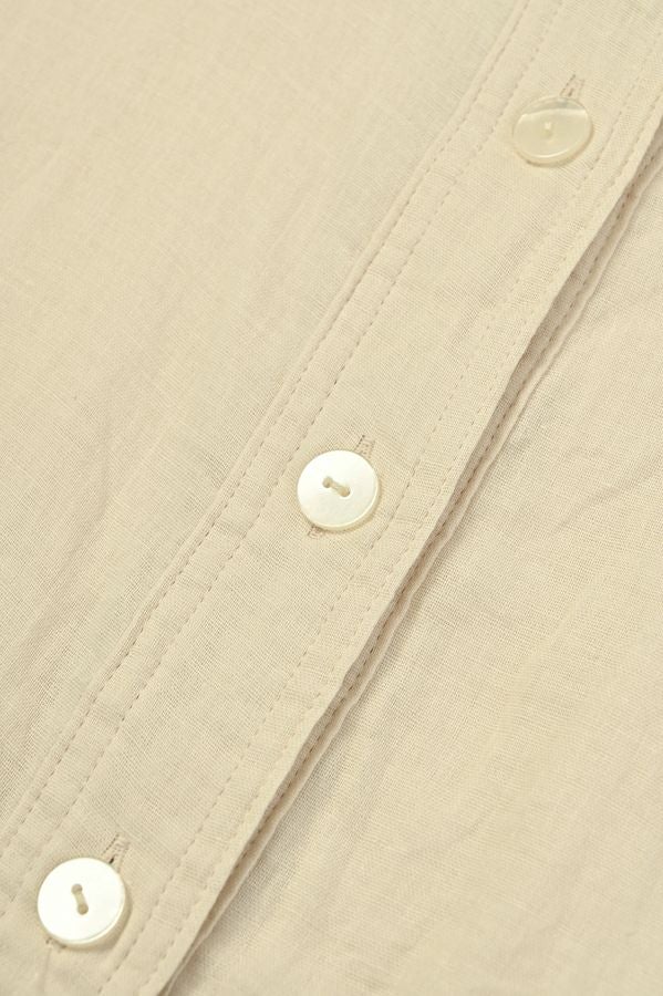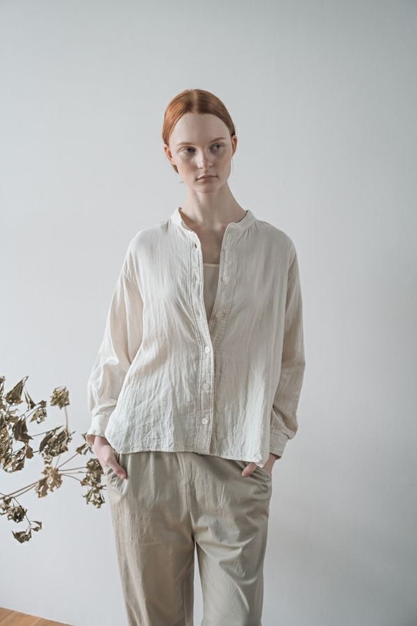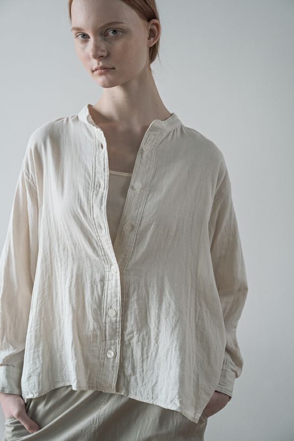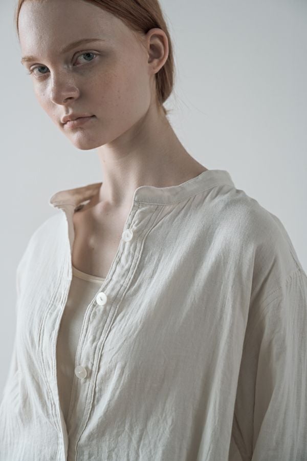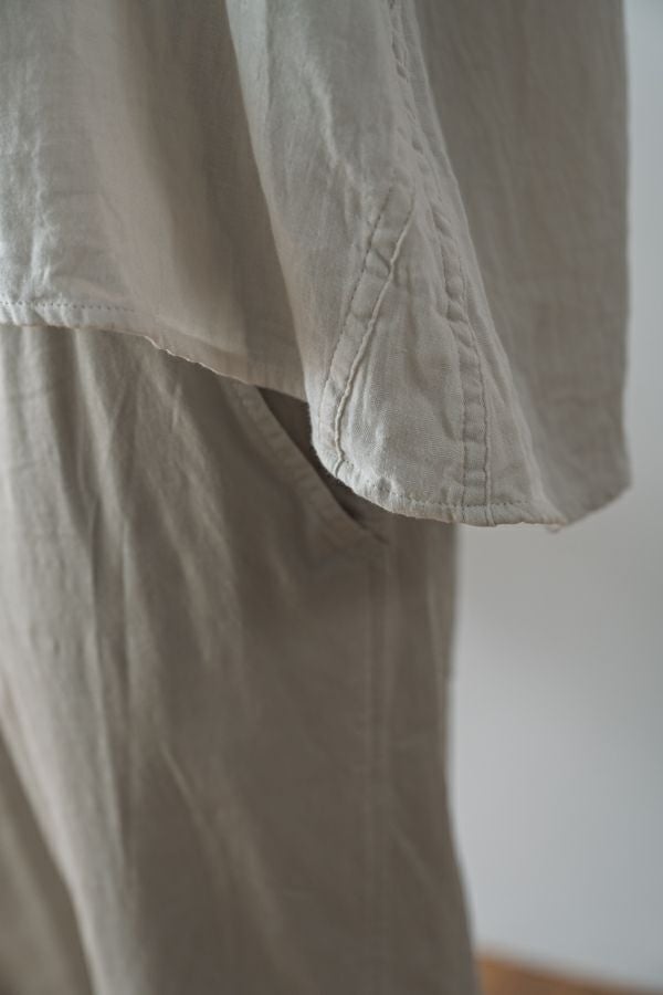 デリケートなお肌の方にも安心の着心地を提案、ナチュラルなソフトシャツ。 今夏から新シリーズの「BINKAN-SAN」 *カサカサした乾燥肌 *ホルモンバランスや季節によってゆらぐ肌 *アレルギーの痒みや肌トラブル *静電気の刺激で痒みやチクチク ずっと敏感肌で悩んでいたデザイナー目線でデリケートなお肌の方にも安心の着心地を提案します。 素材だけでなく内側の縫製にも気遣い、一番気になるチクチク感が無く、オールシーズンにわたり、つい手に取ってしまうシリーズです。 日本製のソフトで膨らみのあるダブルガーゼ素材は、イージーケアでソフト。サラッとした肌触りが良い、自然な風合いそのまま、ノーアイロンで着用可能。ゆとりあるボクシーなセミAラインシルエットで、ポケットのないシンプルなカラーレスのデザイン。ワイドな前立てや、ボタンサイズ、裾のマチ入りなどディテールはさり気なく主張するバランスで設計されています。 シンプルなので、どんなものにも合わせやすい汎用性の高いです。1枚着はもちろん、羽織りとしてもオールシーズン使える便利アイテムです。 ●日本製