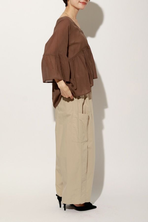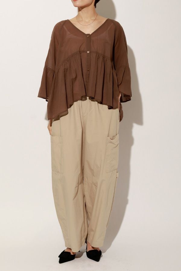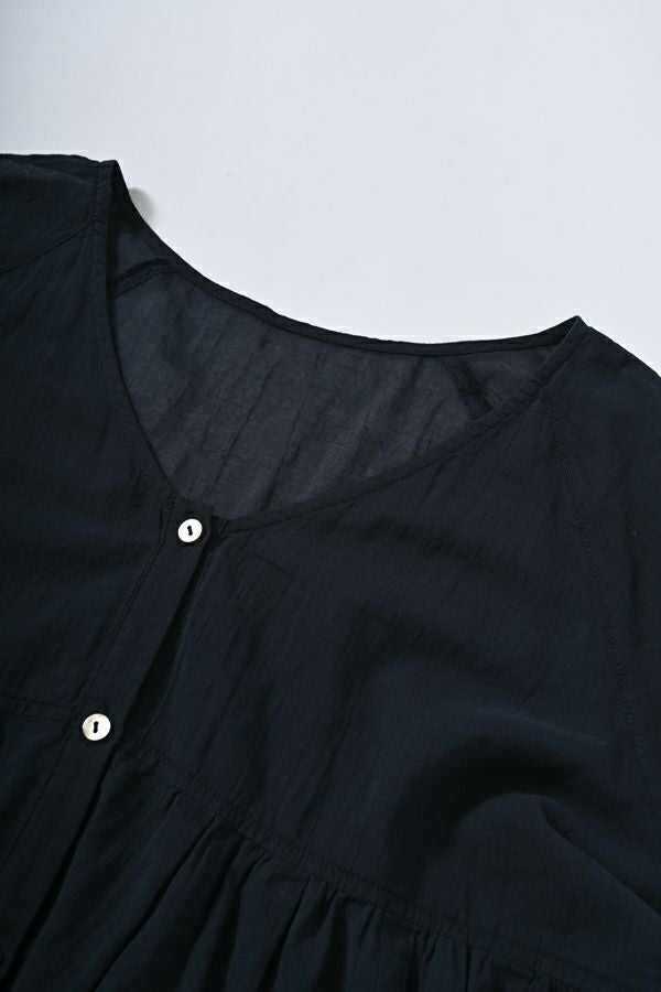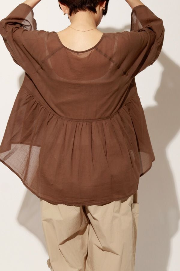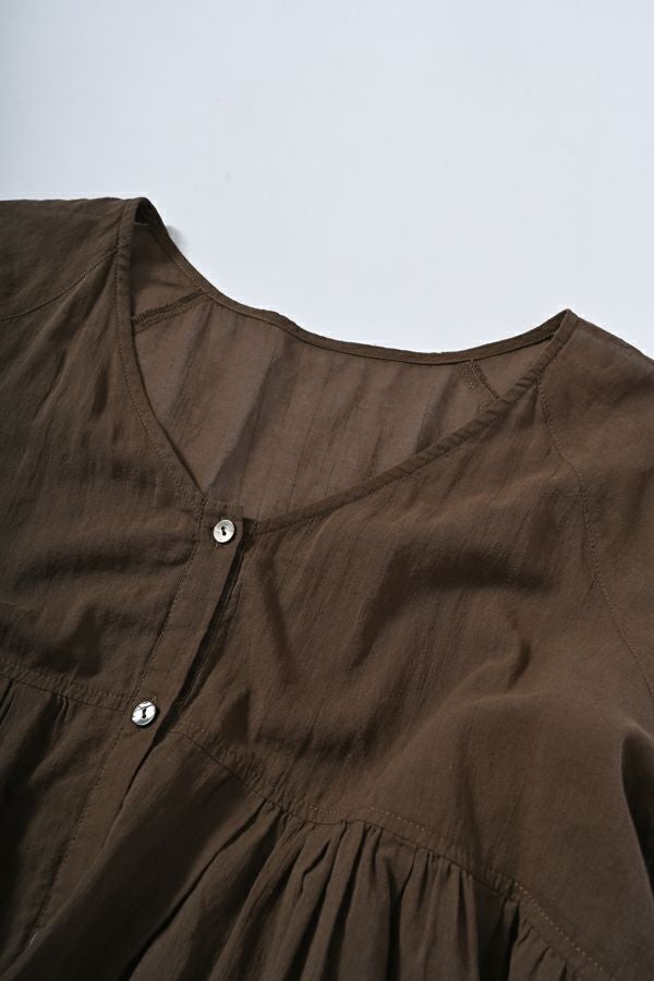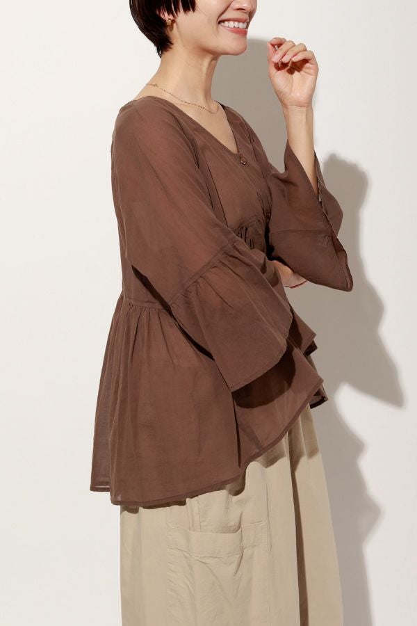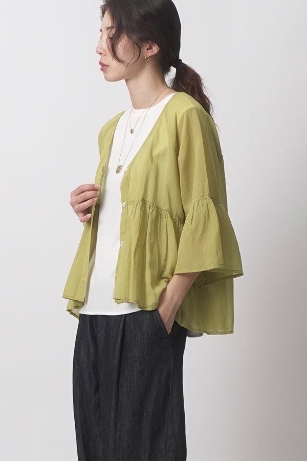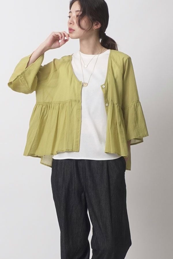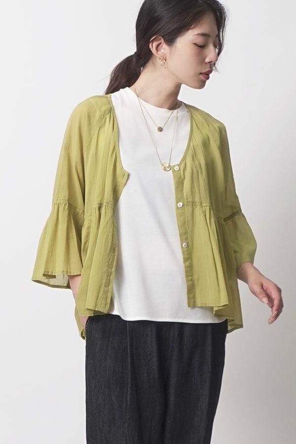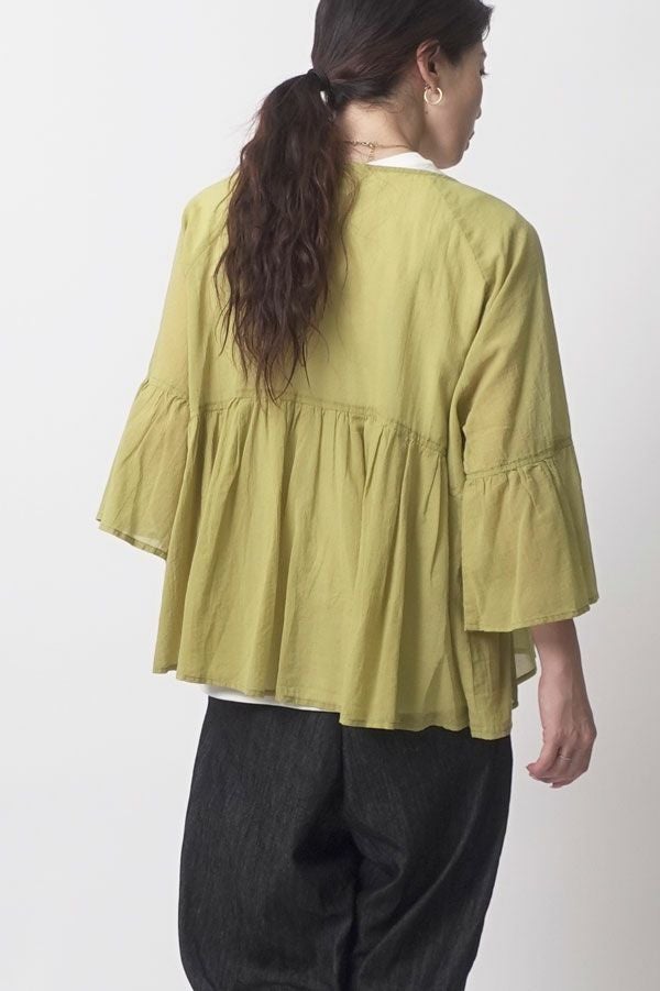 ゆるっと着心地抜群、旬顔コットンボレロ。夏の暑さに対応した大人気の綿強燃素材から、ギャザーたっぷりのティアードボレロブラウスを展開。 シフォンのように透け感のある柔らかい質感で、さらっとしていて涼しく落ち感もあり着心地抜群です。ふんわりシルエットが大人可愛い。 ギャザーがたっぷりと施された袖口と、バストライン下の切り替えが優美な雰囲気を演出。エレガントなフェミニンスタイルに仕上げます。ラグラン袖でゆったりとしたシルエットなので、インナーを選ばず重ね着しやすい一着。夏の羽織りとして重宝します。●同素材のティアードワンピース(25178-2324B-R)とセットアップ可●手洗い可