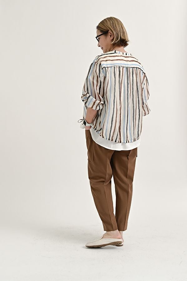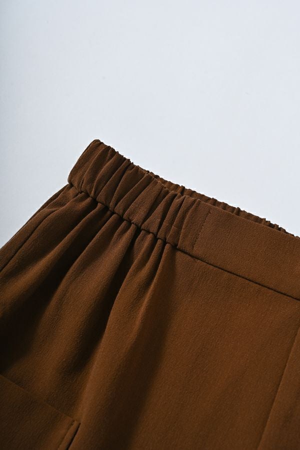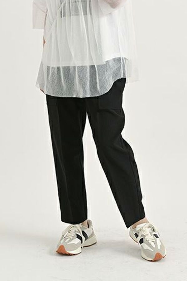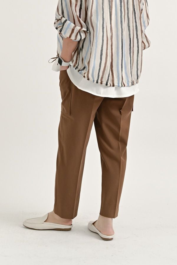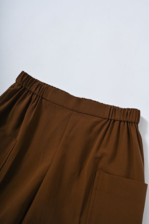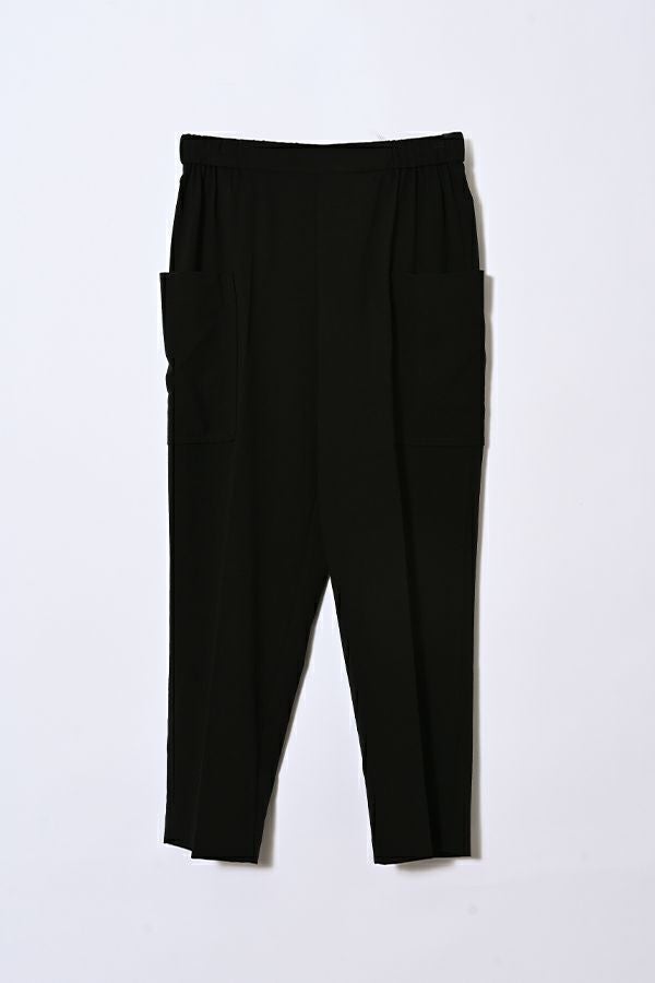 穿くだけで即美脚、涼しさと快適さを兼ね備えた極上パンツ。 縦ストレッチが効いた軽やかで涼しいジョーゼット素材のスティックパンツ。 シワになりにくく、快適な穿き心地が魅力です。 両サイドのパッチポケットがヒップ周りをカバーし、美しいシルエットを保ちながらも、楽な着心地を実現。前中心にギャザーを入れずスッキリと仕上げ、センタープレスで脚長効果も抜群です。きれいめな仕上がりながら、脇から後ろ部分はゴム仕様で、長時間の着用でも快適。 トップスを選ばず、着回し力抜群の一枚です。 この夏、あなたの新定番パンツになる予感。