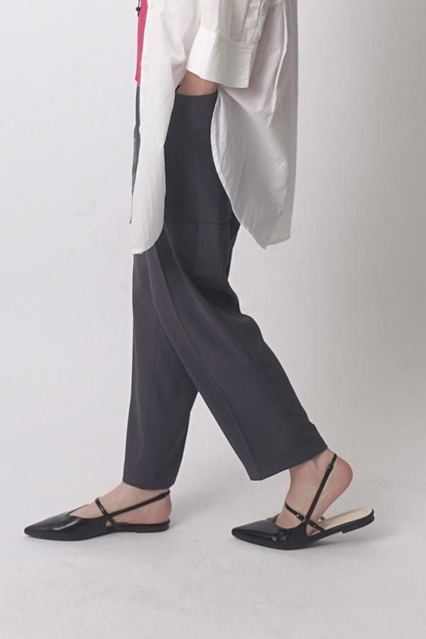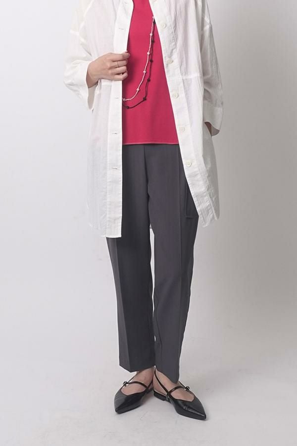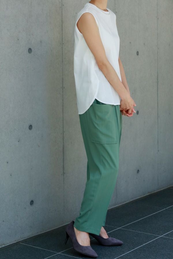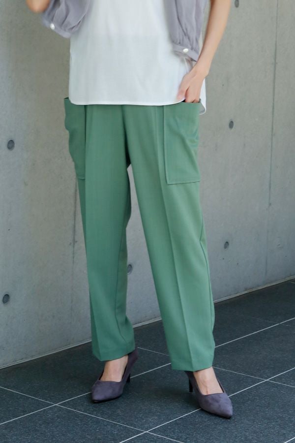 穿くだけで即美脚、涼しさと快適さを兼ね備えた極上パンツ。 縦ストレッチが効いた軽やかで涼しいジョーゼット素材のスティックパンツ。 シワになりにくく、快適な穿き心地が魅力です。 両サイドのパッチポケットがヒップ周りをカバーし、美しいシルエットを保ちながらも、楽な着心地を実現。前中心にギャザーを入れずスッキリと仕上げ、センタープレスで脚長効果も抜群です。きれいめな仕上がりながら、脇から後ろ部分はゴム仕様で、長時間の着用でも快適。 トップスを選ばず、着回し力抜群の一枚です。 この夏、あなたの新定番パンツになる予感。
