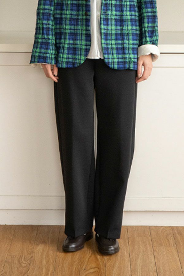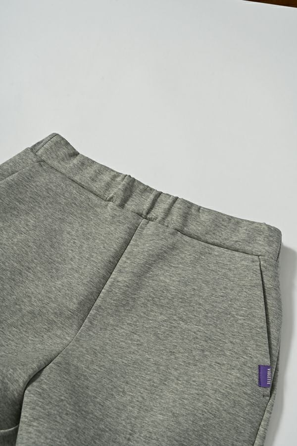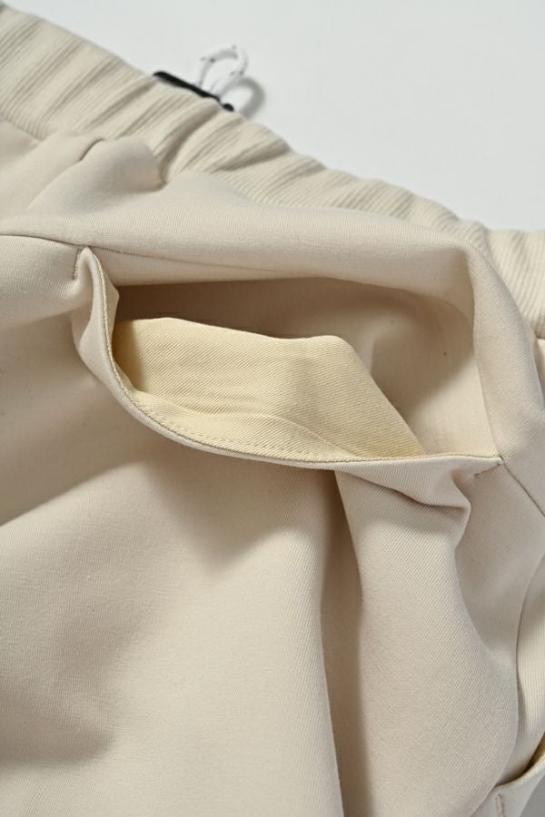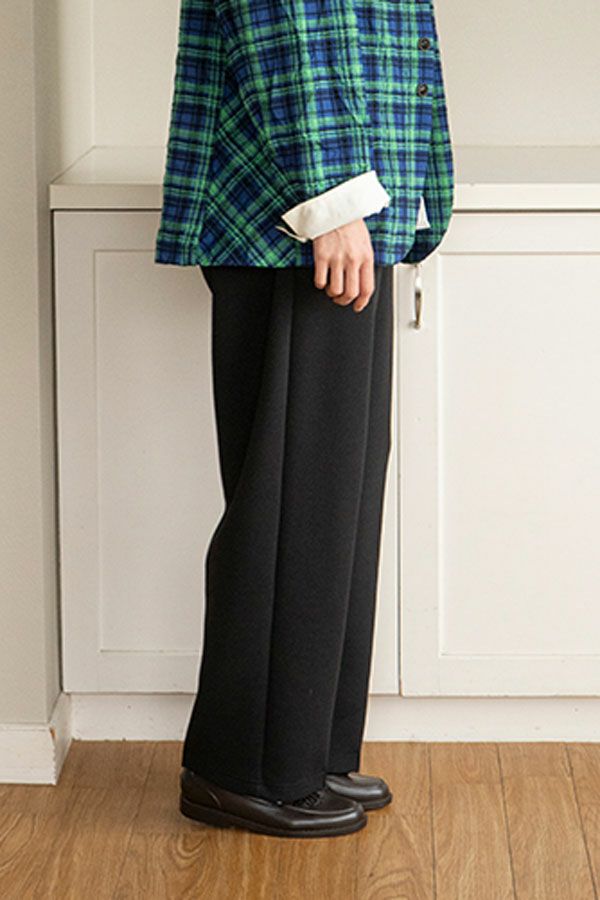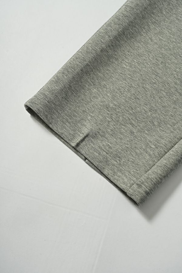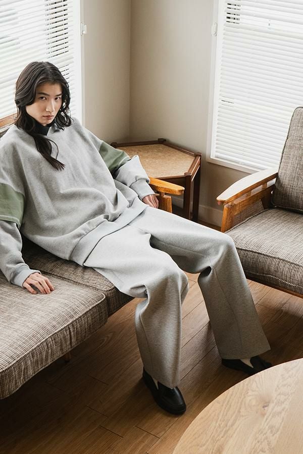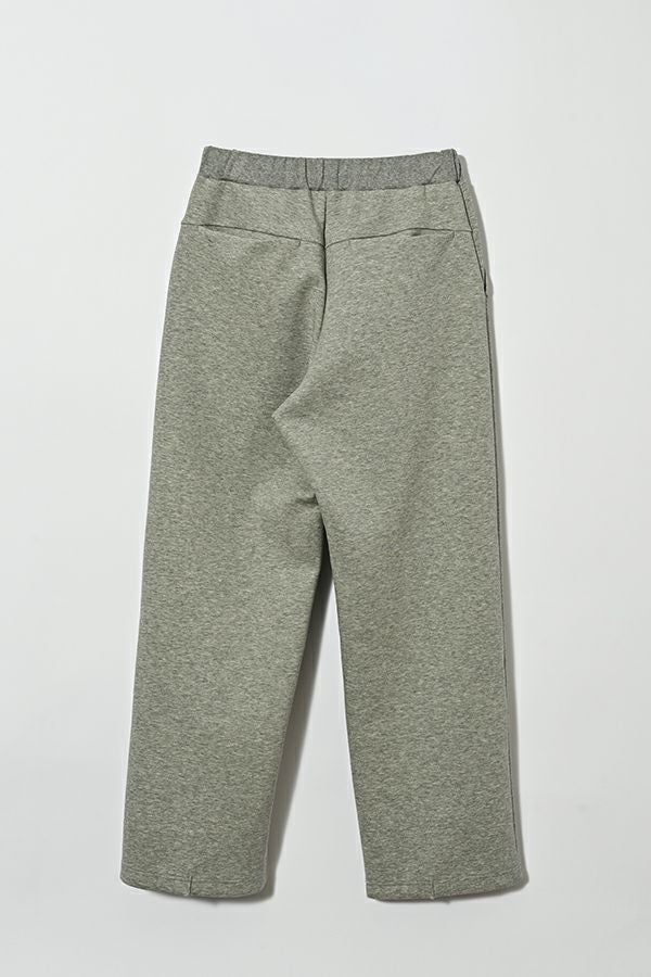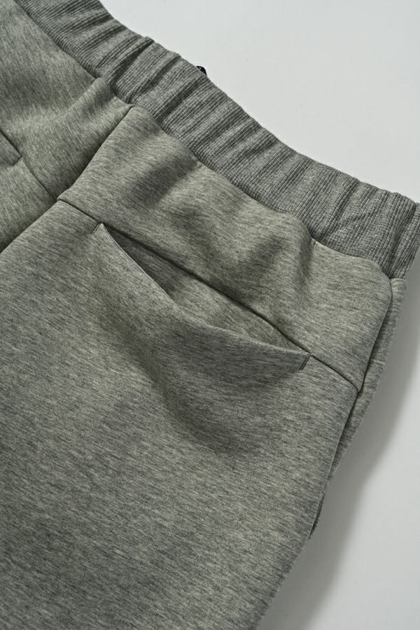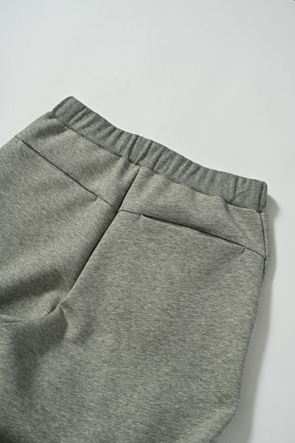 穿きやすさと上品な佇まいを兼ね備えた、大人のためのスウェットトラウザー。 スウェット特有のリラックス感を活かしつつ、トラウザーのパターンで仕立てることで、立ち姿まで美しく見えるシルエットに仕上げました。裾の一部をつまむことで、センターたたみが綺麗に出るよう工夫されており、ラフな素材でありながらも凛とした印象を与える一本です。 生地には、適度なハリと伸縮性を備えたダンボール素材を使用。綿/ポリエステルで、ナチュラルな風合いを残しながらもきれいな目面に仕上がり、日常から少しきちんとしたシーンまで幅広く活躍してくれます。 ダンボール素材ならではのふくらみ感と軽さに加え、ほんのりとした保温性もあり、秋冬にも快適に着用できる素材感です。
