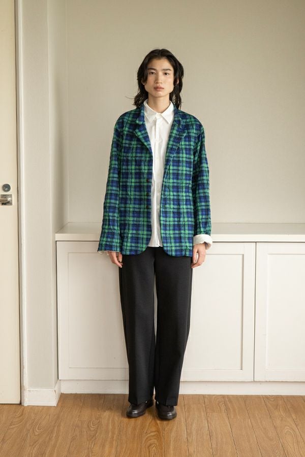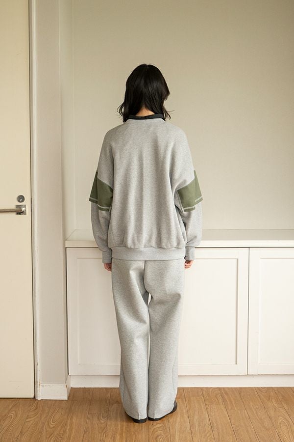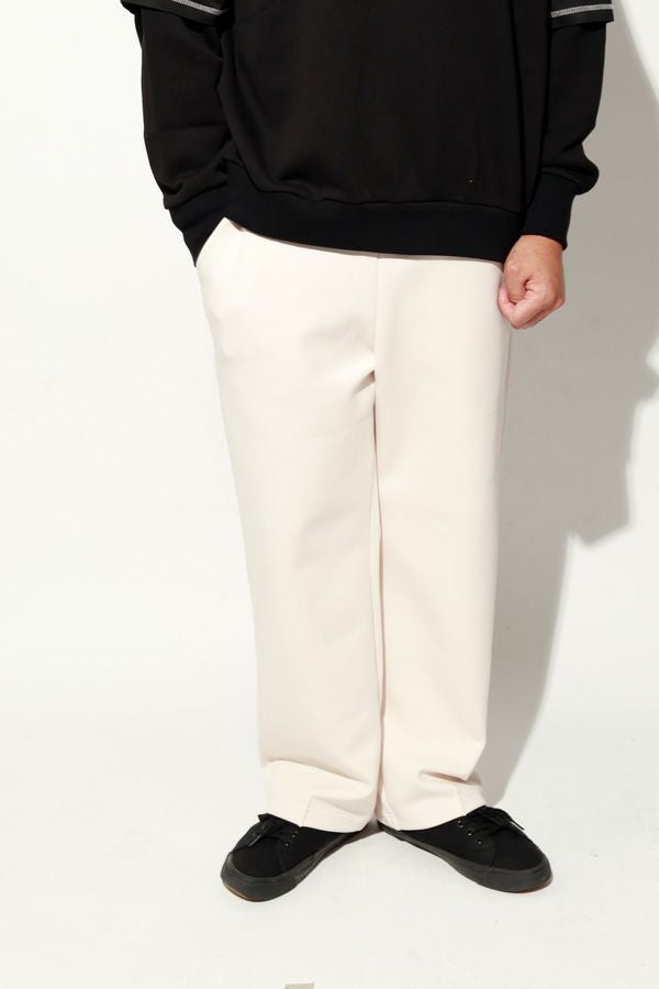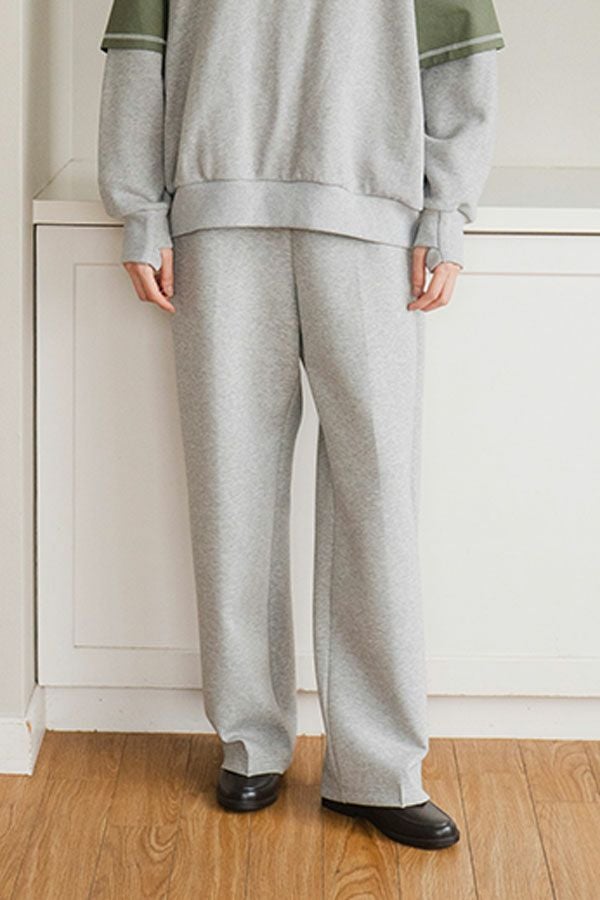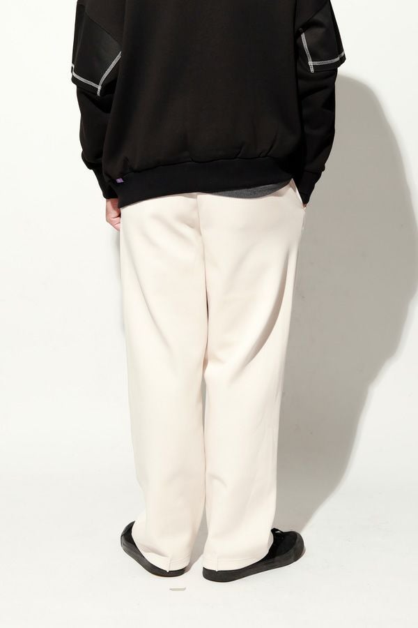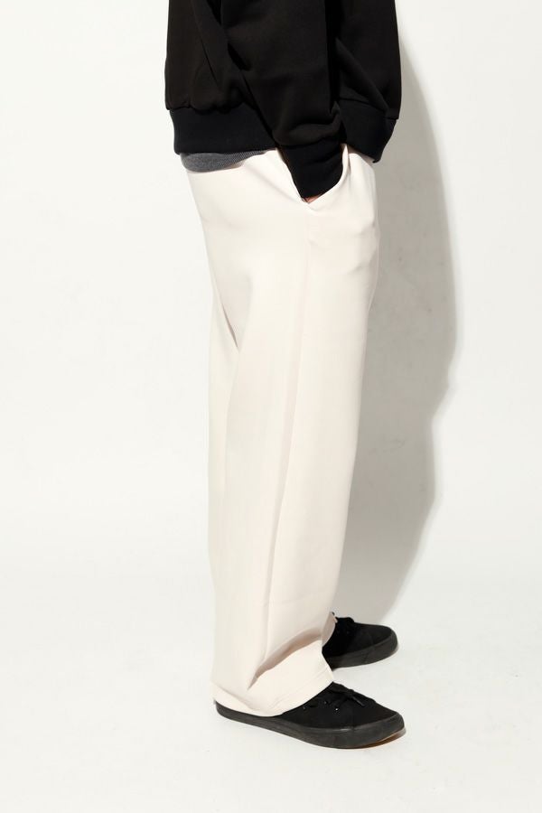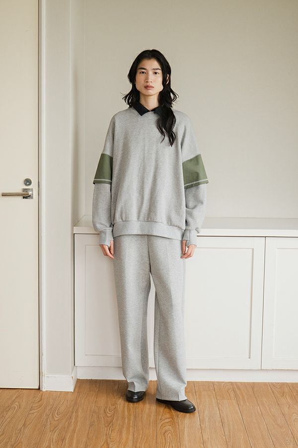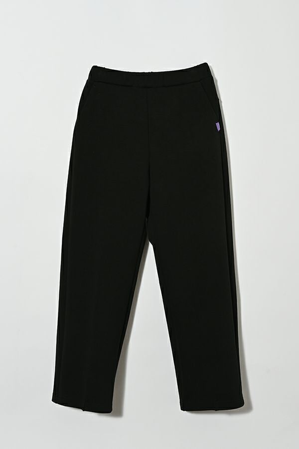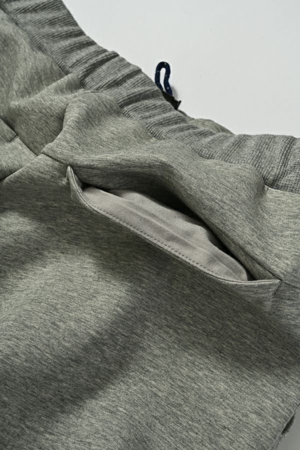 穿きやすさと上品な佇まいを兼ね備えた、大人のためのスウェットトラウザー。 スウェット特有のリラックス感を活かしつつ、トラウザーのパターンで仕立てることで、立ち姿まで美しく見えるシルエットに仕上げました。裾の一部をつまむことで、センターたたみが綺麗に出るよう工夫されており、ラフな素材でありながらも凛とした印象を与える一本です。 生地には、適度なハリと伸縮性を備えたダンボール素材を使用。綿/ポリエステルで、ナチュラルな風合いを残しながらもきれいな目面に仕上がり、日常から少しきちんとしたシーンまで幅広く活躍してくれます。 ダンボール素材ならではのふくらみ感と軽さに加え、ほんのりとした保温性もあり、秋冬にも快適に着用できる素材感です。