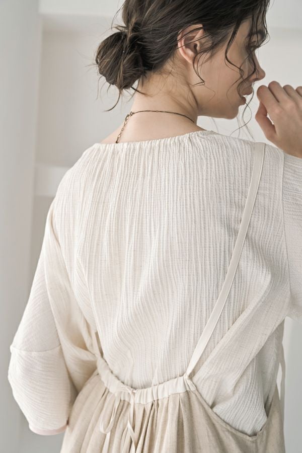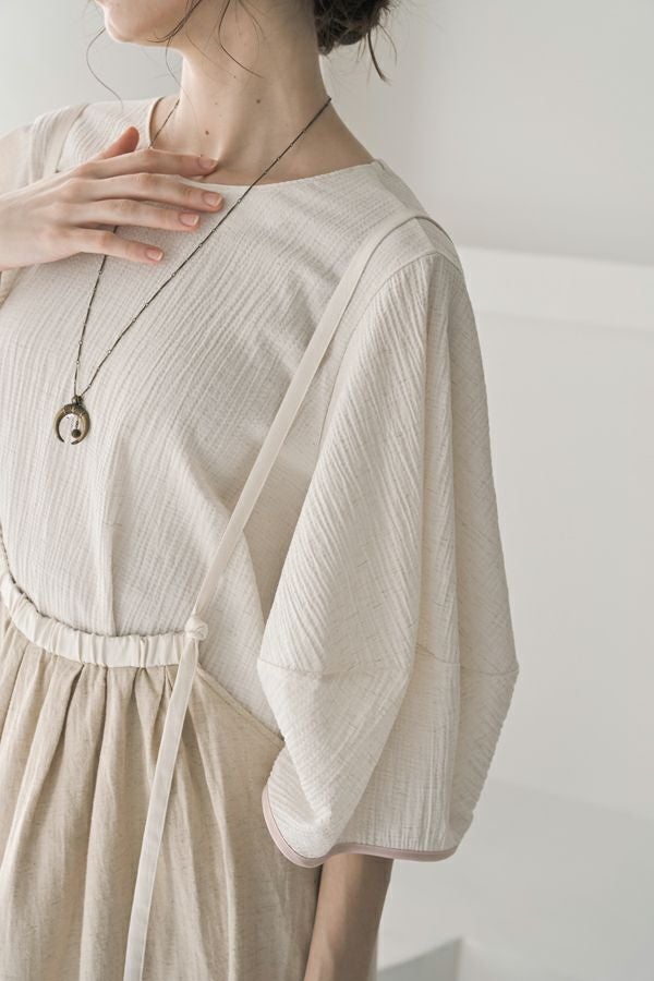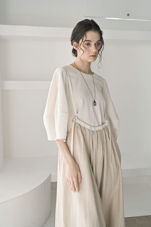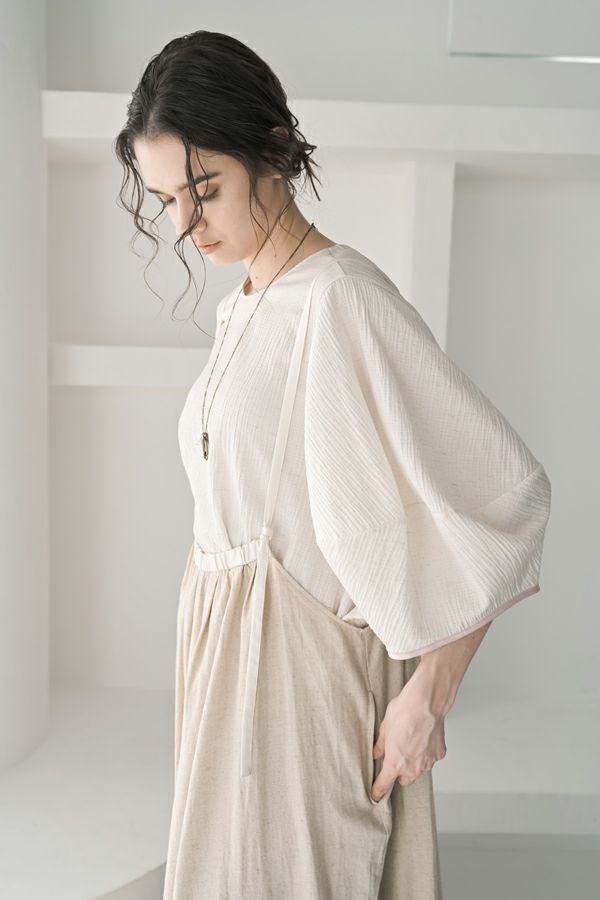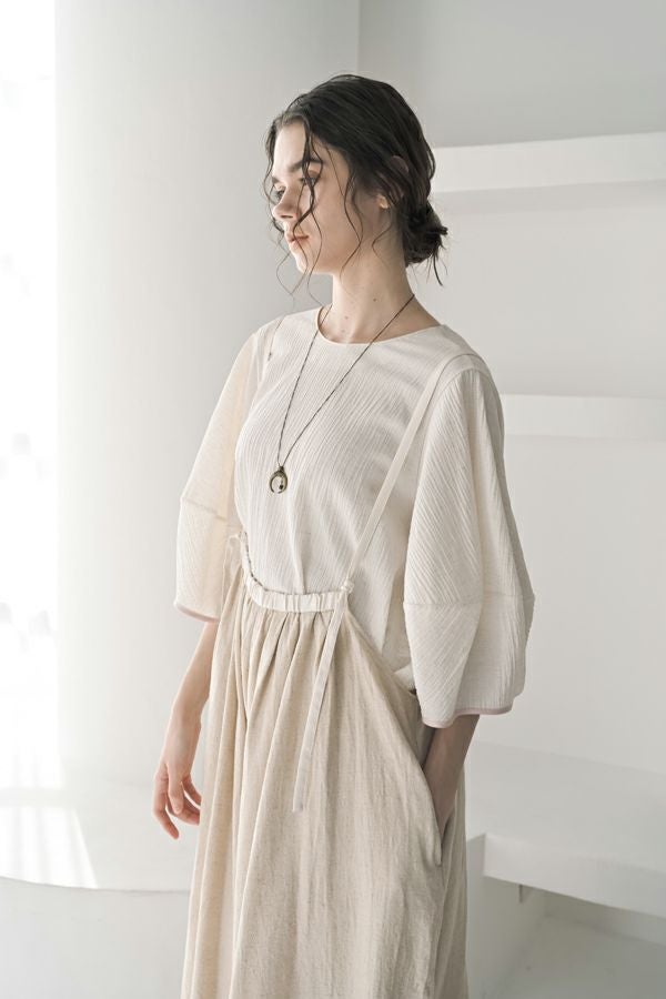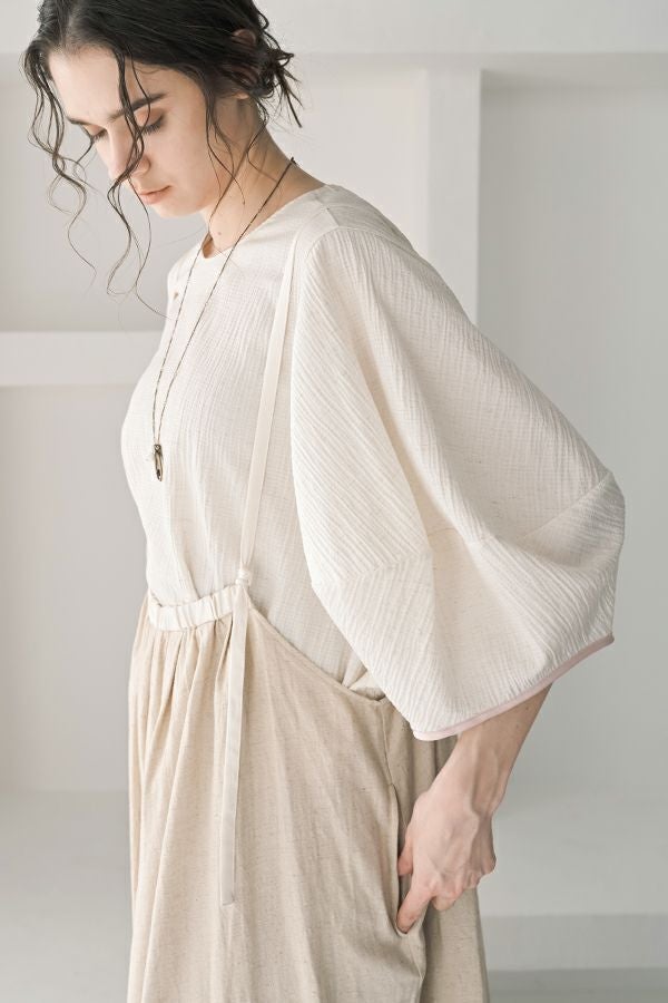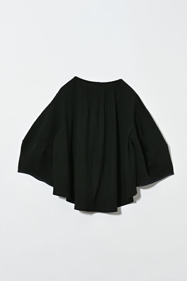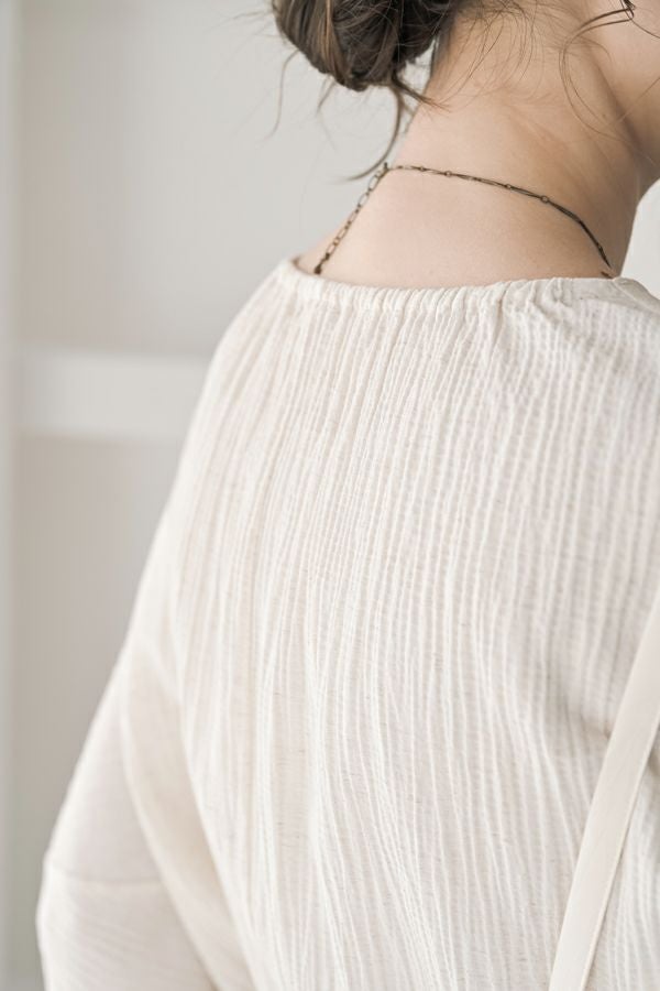 柔らかい印象をふわりと纏う、コクーンシルエットのブラウス。 少しハリ感のある生地がシルエットに立体感を作り、腕が程よく隠れて細見えするようになっているのも拘りポイント。 表面が波打ったような素材に、デザインが絶妙にマッチし、大人ゆる感を表現。後ろ衿はゴム仕様になっていて、着脱しやすく、Tシャツ感覚で着られるのに一枚で映える。ON/OFFどちらにも対応でき、コーデが格上げされるアイテムです。 デニムと合わせたり、マニッシュなスラックス合わせで着るのもカッコよく、ブラックのワイドパンツなどと合わせて、グッとモダンなスタイリングも可能。下にシアーなロングスリーブ合わせで、レイヤースタイリングもおススメです。