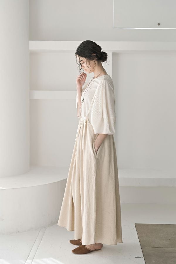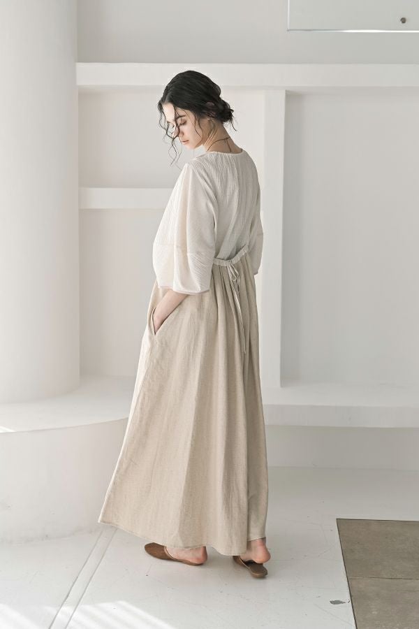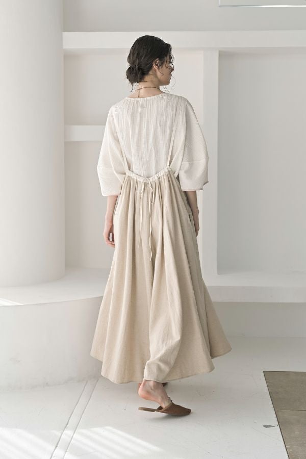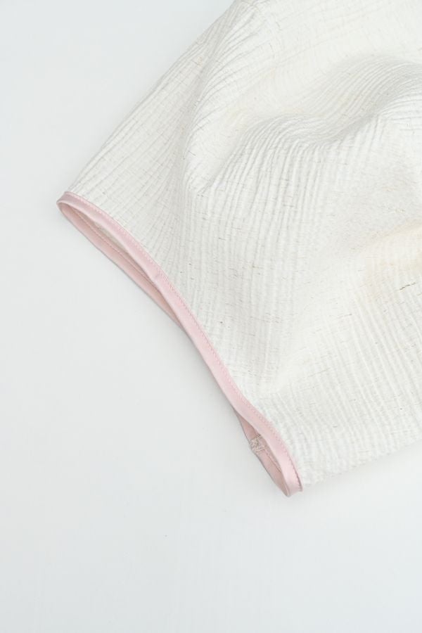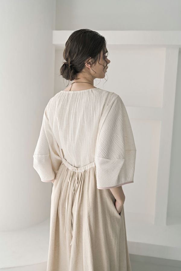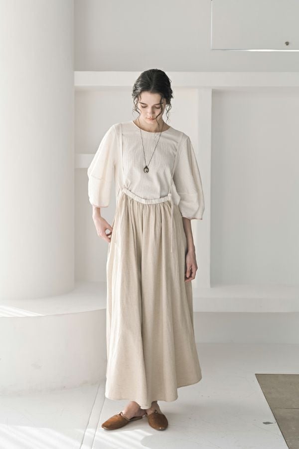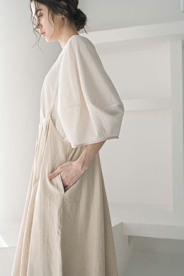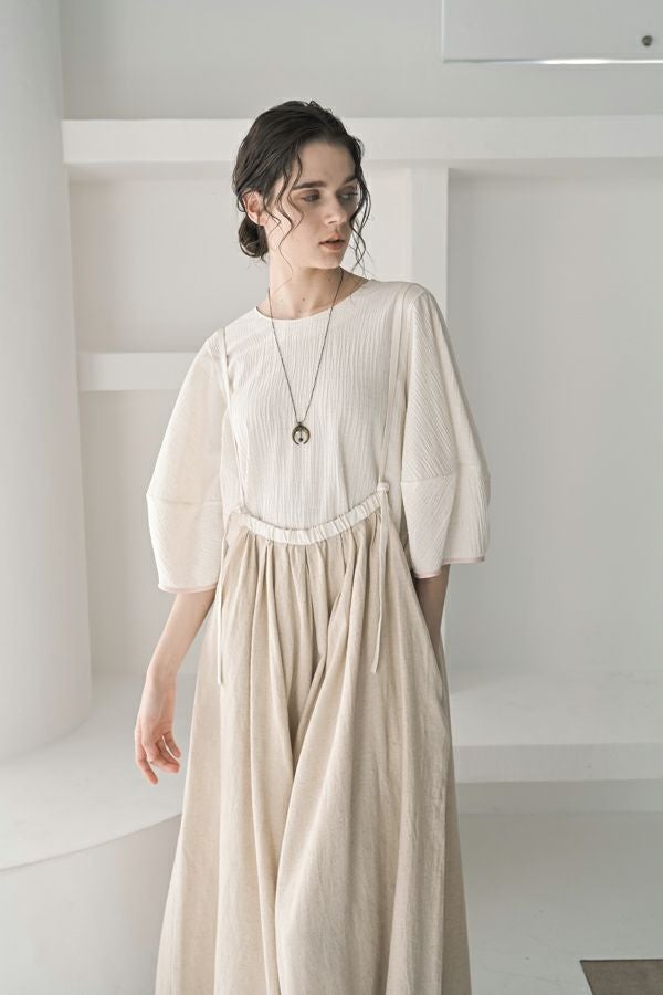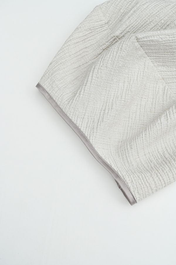 柔らかい印象をふわりと纏う、コクーンシルエットのブラウス。 少しハリ感のある生地がシルエットに立体感を作り、腕が程よく隠れて細見えするようになっているのも拘りポイント。 表面が波打ったような素材に、デザインが絶妙にマッチし、大人ゆる感を表現。後ろ衿はゴム仕様になっていて、着脱しやすく、Tシャツ感覚で着られるのに一枚で映える。ON/OFFどちらにも対応でき、コーデが格上げされるアイテムです。 デニムと合わせたり、マニッシュなスラックス合わせで着るのもカッコよく、ブラックのワイドパンツなどと合わせて、グッとモダンなスタイリングも可能。下にシアーなロングスリーブ合わせで、レイヤースタイリングもおススメです。