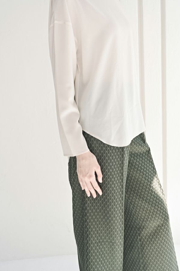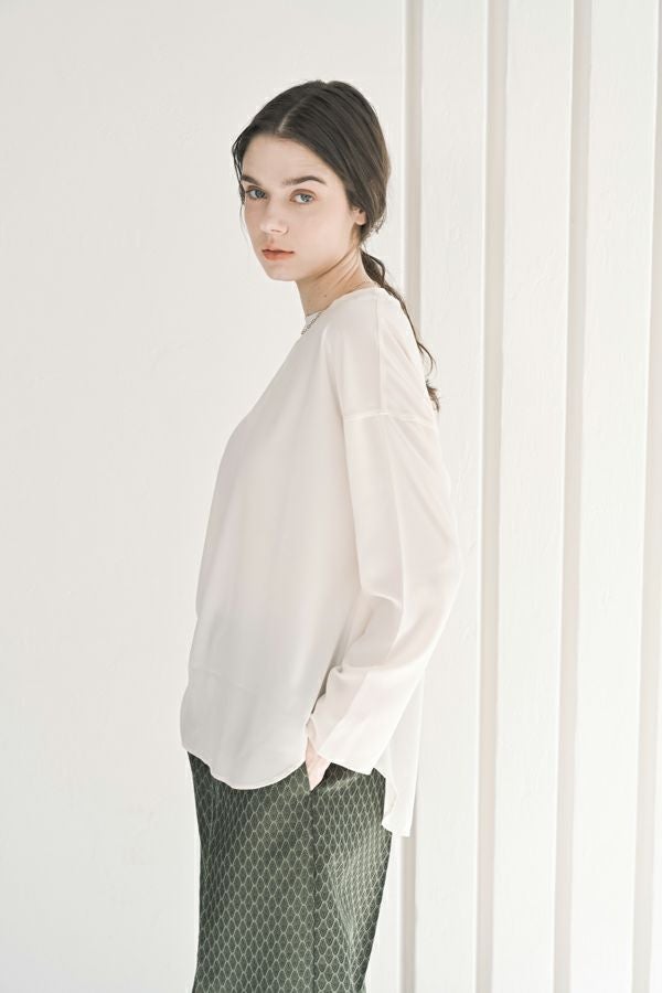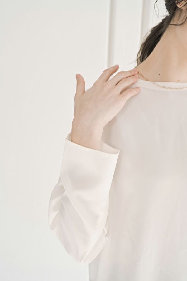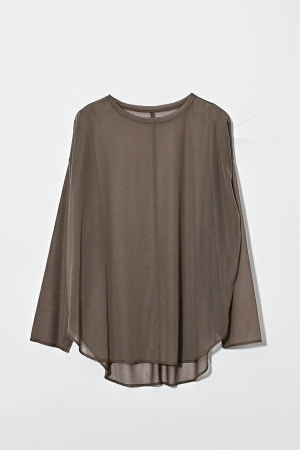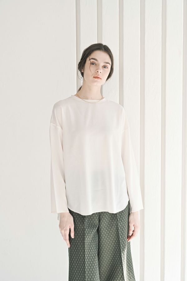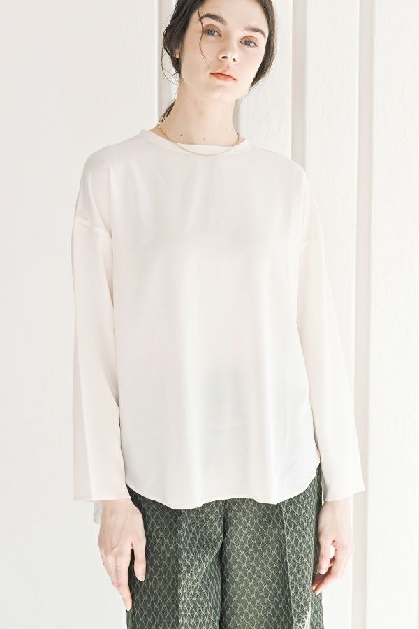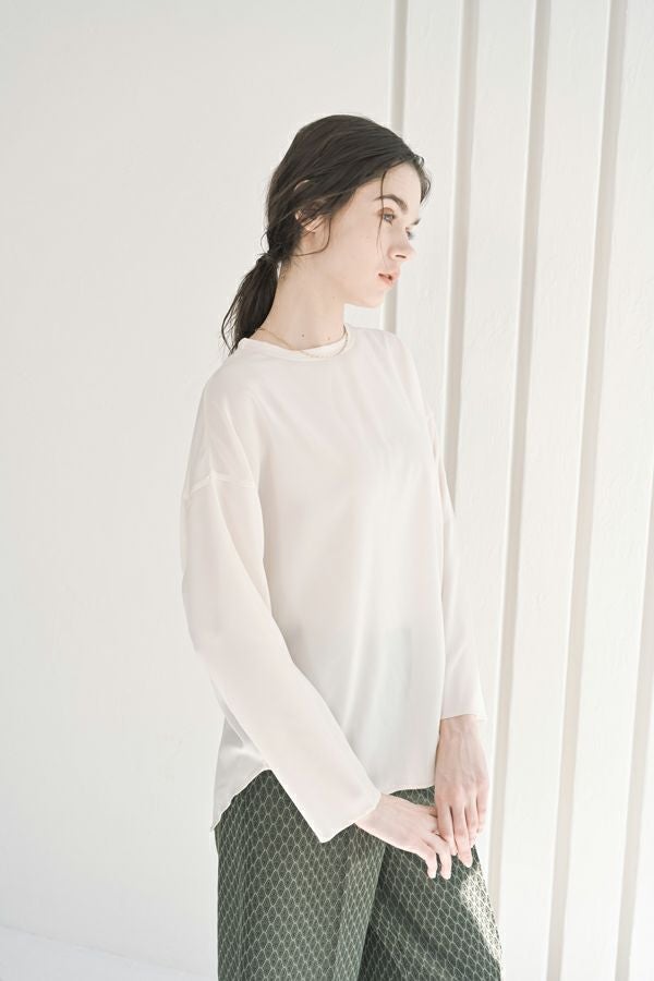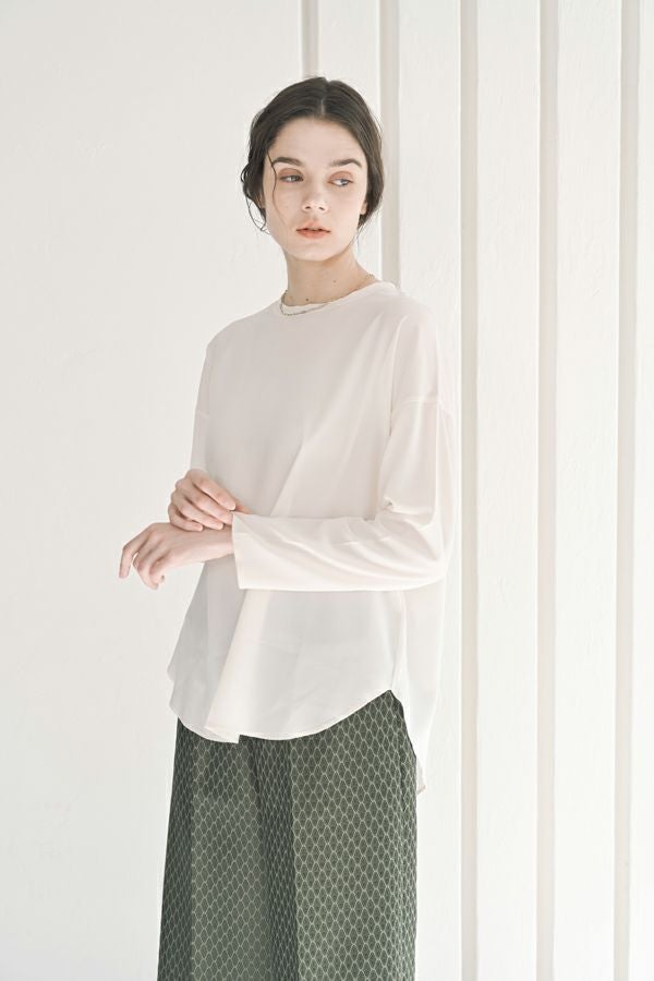 シンプル&軽やか、オールシーズン活躍するシフォンロンTEE。 ほどよくゆとりを持たせた身幅に、すっきりとした細めの袖がバランスの良いシルエットを演出。 合繊素材ながらナチュラルなシワの表情が新鮮かつ繊細な印象に。さまざまなアイテムとのスタイリングが楽しめます。袖口と裾はカジュアルなロックで仕上げで、軽やかさをプラス。シーズンレスに活躍する一枚です。 ジャケットのインナーとしてはもちろん、ニットやシャツ、ビスチェとのレイヤードなど着こなしの可能性は無限大。薄手で使い勝手が良く、秋は一枚着として、冬から春先はインナーにと3シーズン活躍してくれます。 ●日本製