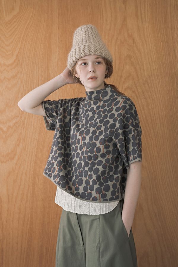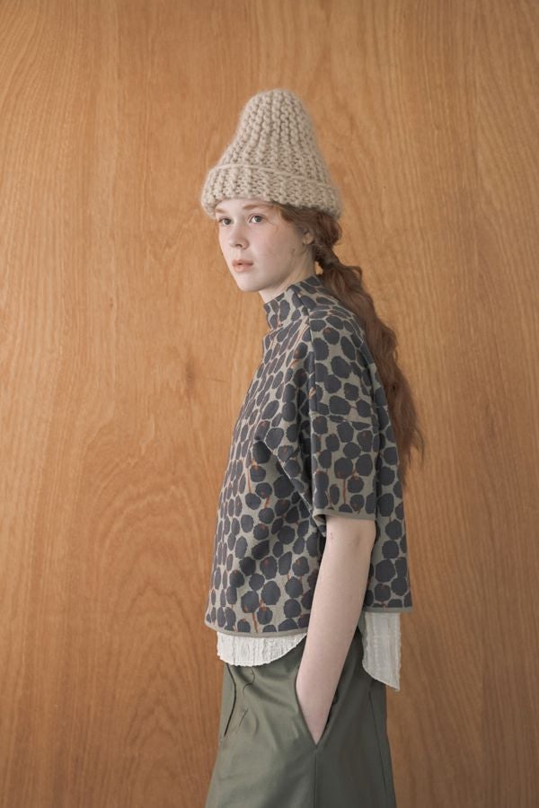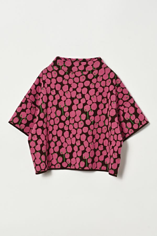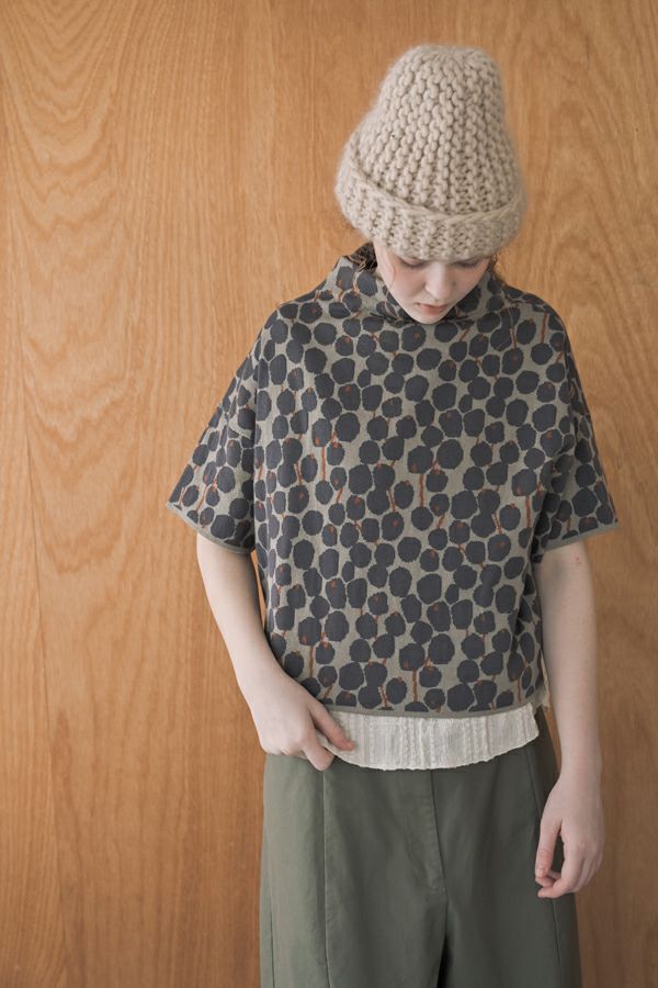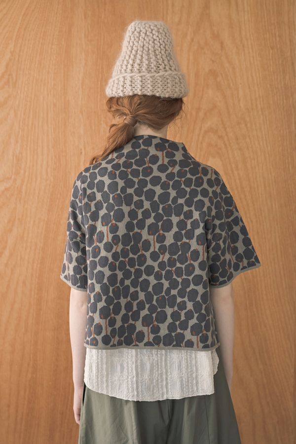 シックなトーンのベリー柄がキュート、大人可愛いニットベスト。 大人気定番のシワ加工シリーズ(25228-1004T-R)と同じ糸を使用している、毎年人気のボトルネックベストが今季は同系色のベリー柄で大人キュートなコーデアクセントとなる主役アイテムで登場。 ウールが入っていないので暑苦しくなく、気温が高い初秋は一枚着で半袖のデザインTシャツのように着られてロングシーズン着まわし可能で重宝します。衿まわりは開き過ぎず詰まり過ぎずに首を隠す設計です。 1枚着やインナーと重ね着してベスト着用の両方で安心して着回しを楽しめるのも嬉しいポイントです。 インナーを人気のシワワイドプルオーバー(25228-1004T-R)と合わせていただくとカラー組合わせによってイメージが変わるので、何色通りもその日の気分で変化出来るのも魅力です。 ●手洗い可