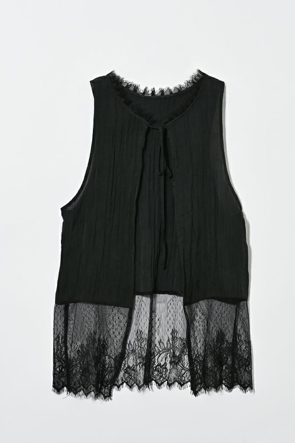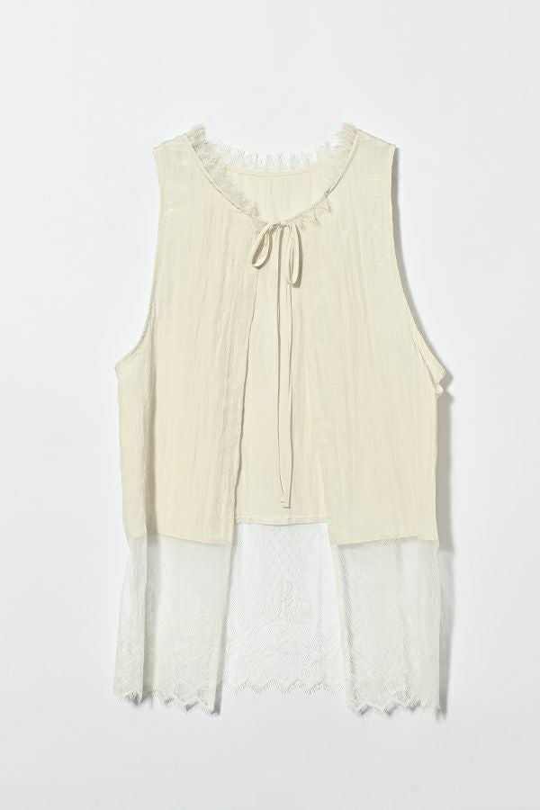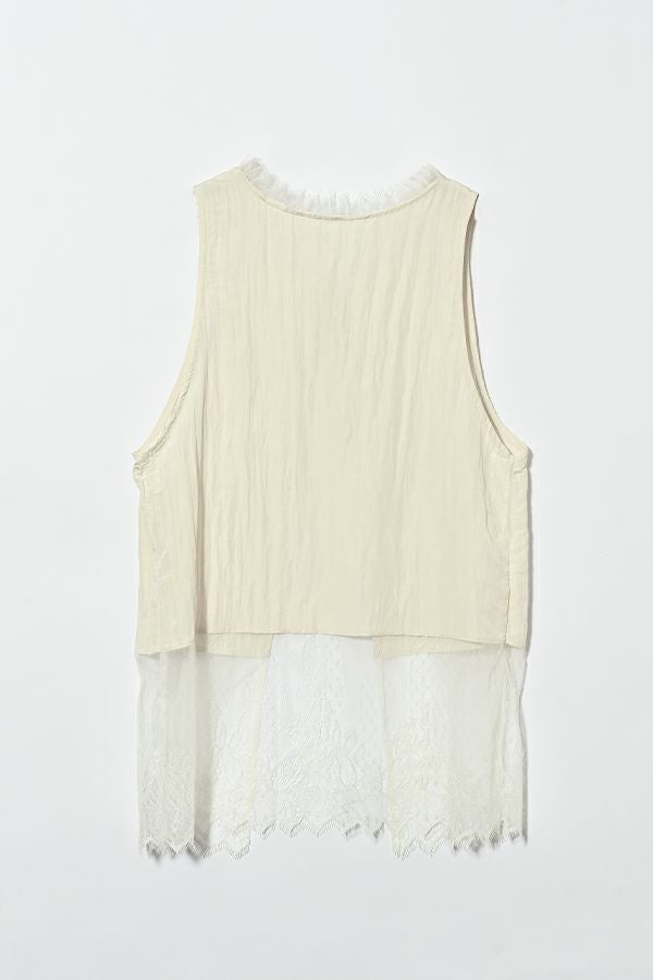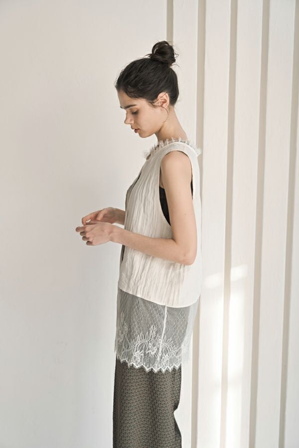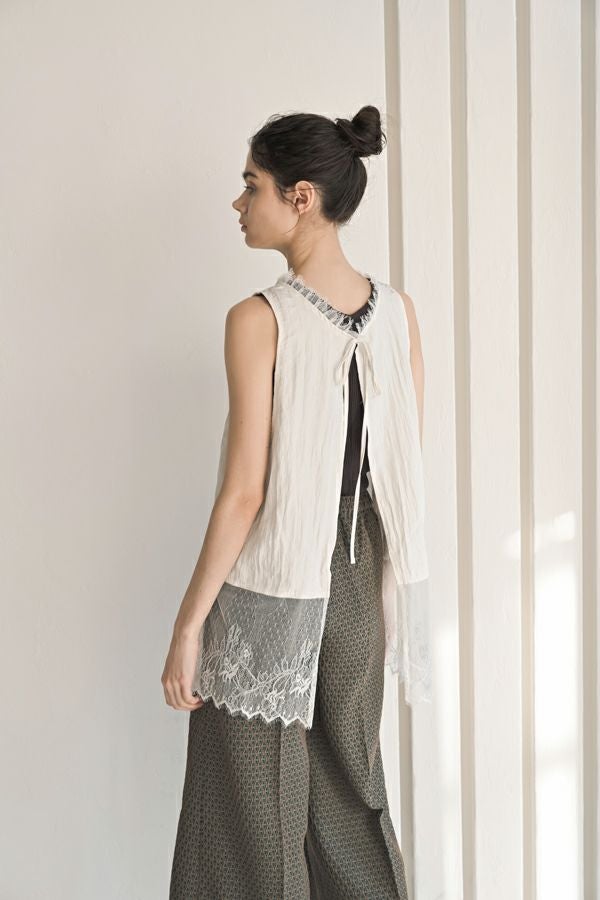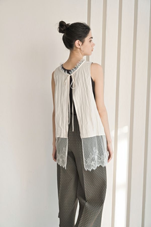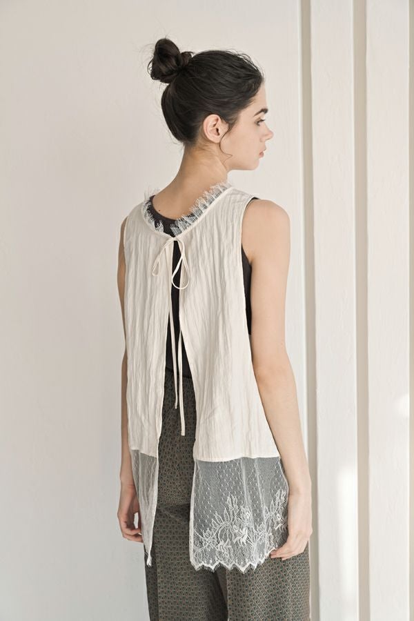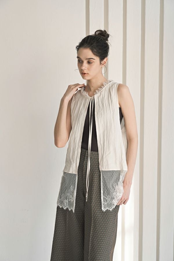 ヴィンテージライクな風合いが魅力、2WAYレースジレ。 マットサテンと繊細なレースの切り替えが、ランジェリーライクな上品さを演出。 衿ぐりにあしらったレースや、長めのリボンテープなど、細部までこだわりの詰まったデザインに仕上げました。 前後2wayで着用でき、リボンを後ろに持ってきてベストとしても活躍。レイヤードスタイルに取り入れるだけで、コーディネートにヴィンテージ感と女性らしいニュアンスをプラスしてくれる一着です。 薄手のロンTEE等のトップスにレイヤード。フェミニンな雰囲気を活かしつつ、デニムやチノパン、スラックスなどパンツスタイルと合わせることで、程よくカジュアルダウンした着こなしもおすすめです。