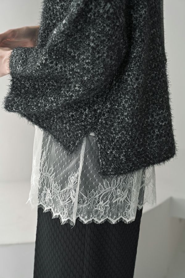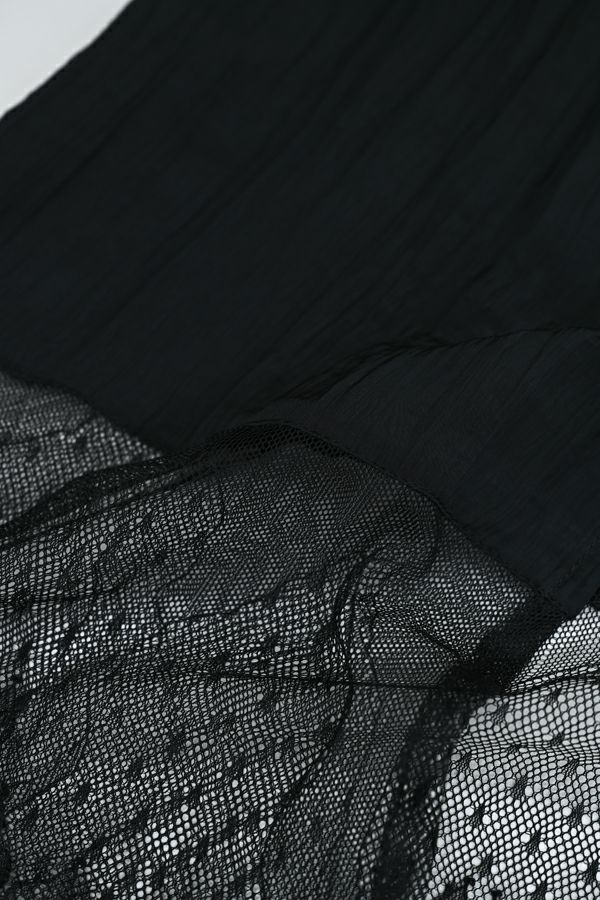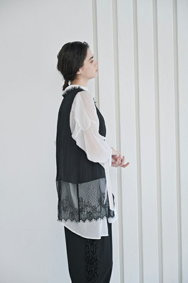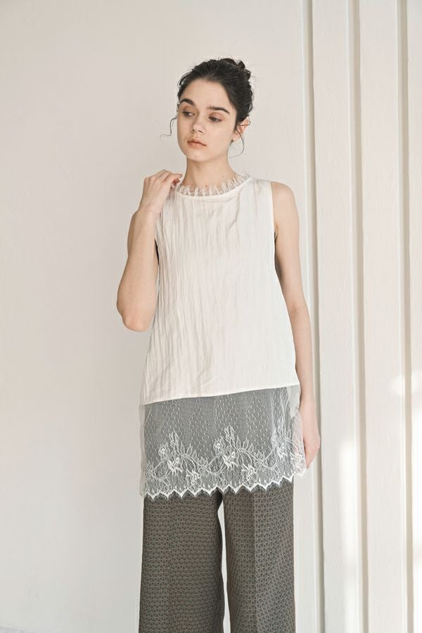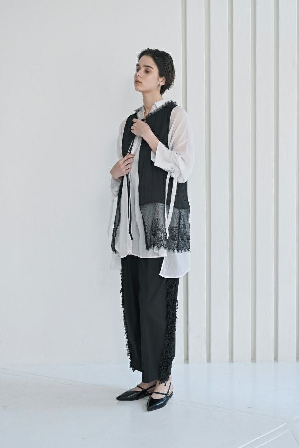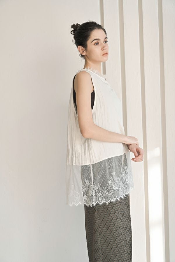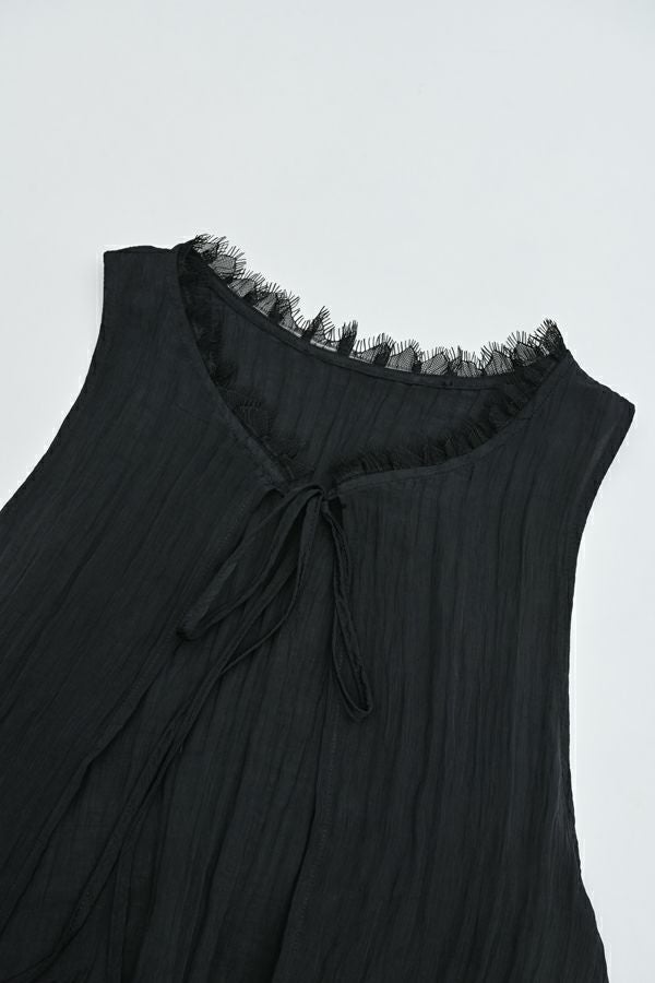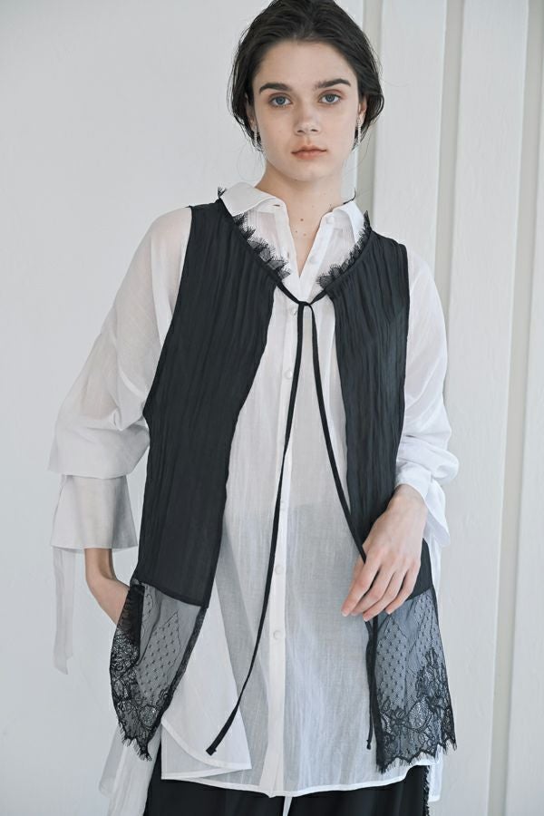 ヴィンテージライクな風合いが魅力、2WAYレースジレ。 マットサテンと繊細なレースの切り替えが、ランジェリーライクな上品さを演出。 衿ぐりにあしらったレースや、長めのリボンテープなど、細部までこだわりの詰まったデザインに仕上げました。 前後2wayで着用でき、リボンを後ろに持ってきてベストとしても活躍。レイヤードスタイルに取り入れるだけで、コーディネートにヴィンテージ感と女性らしいニュアンスをプラスしてくれる一着です。 薄手のロンTEE等のトップスにレイヤード。フェミニンな雰囲気を活かしつつ、デニムやチノパン、スラックスなどパンツスタイルと合わせることで、程よくカジュアルダウンした着こなしもおすすめです。