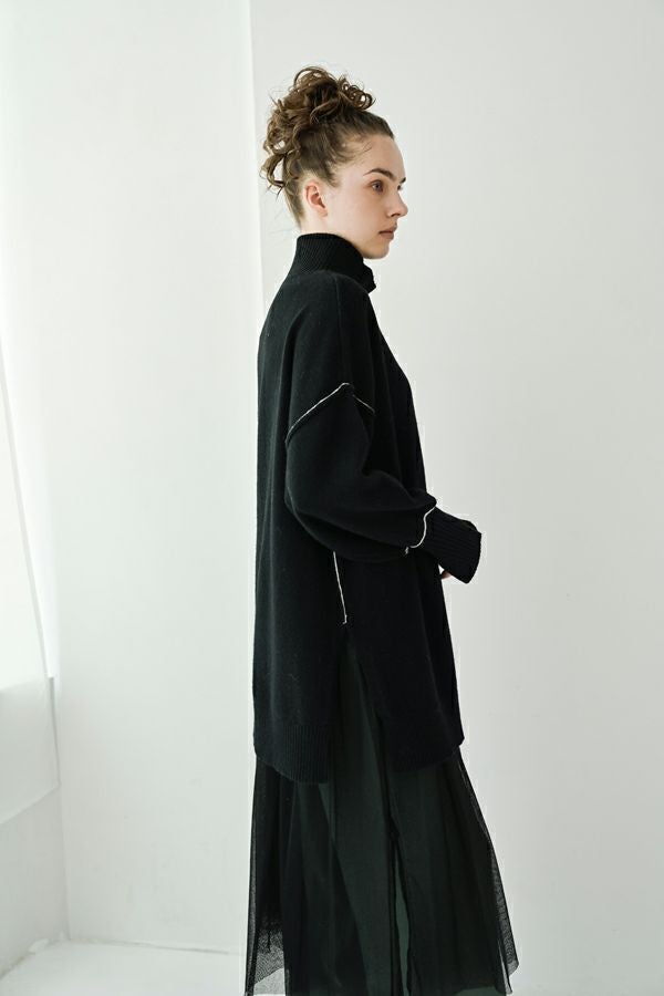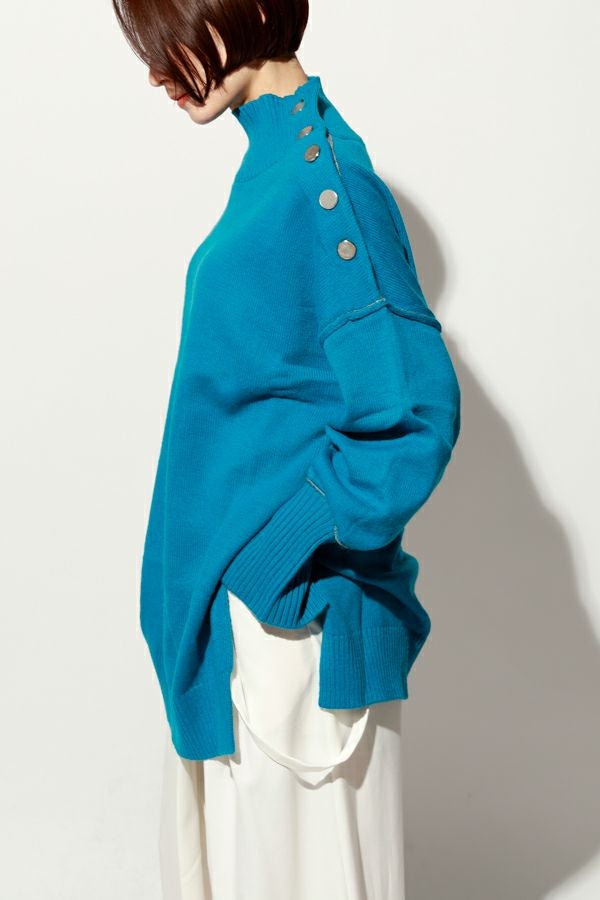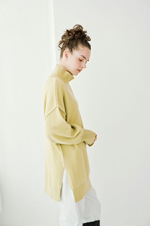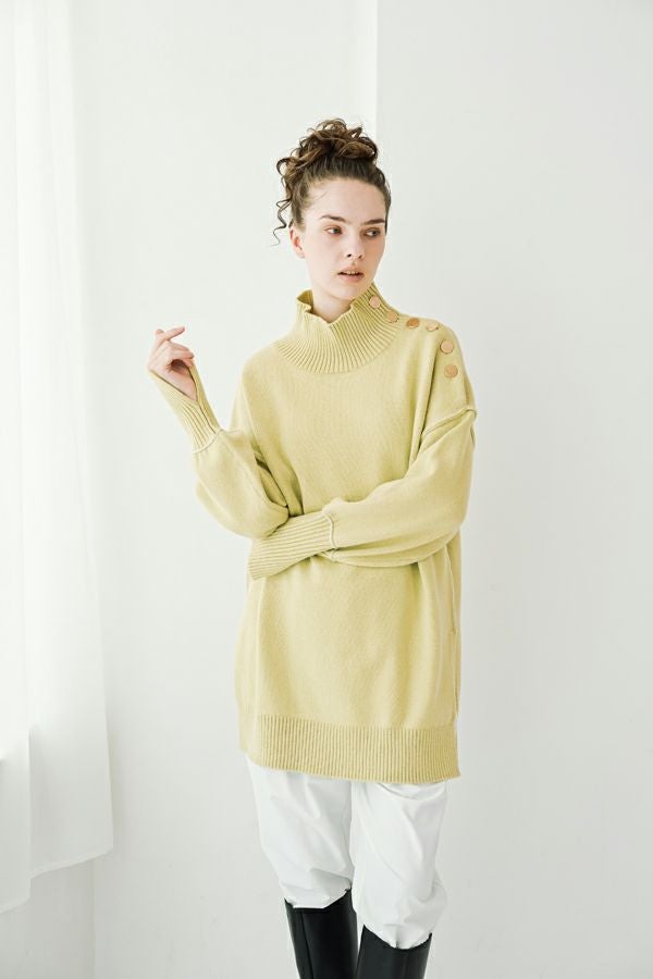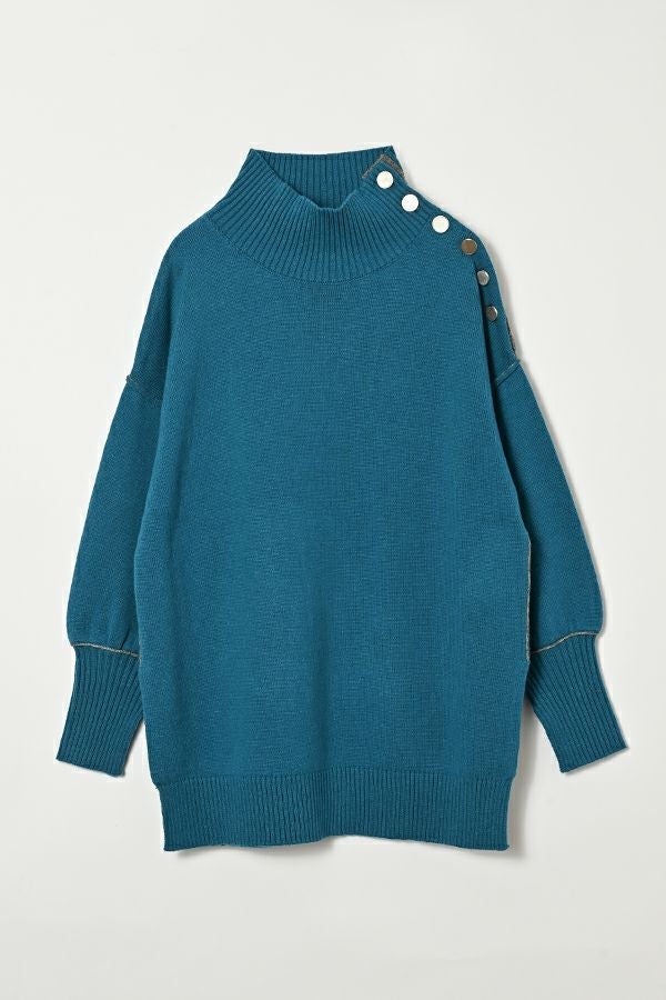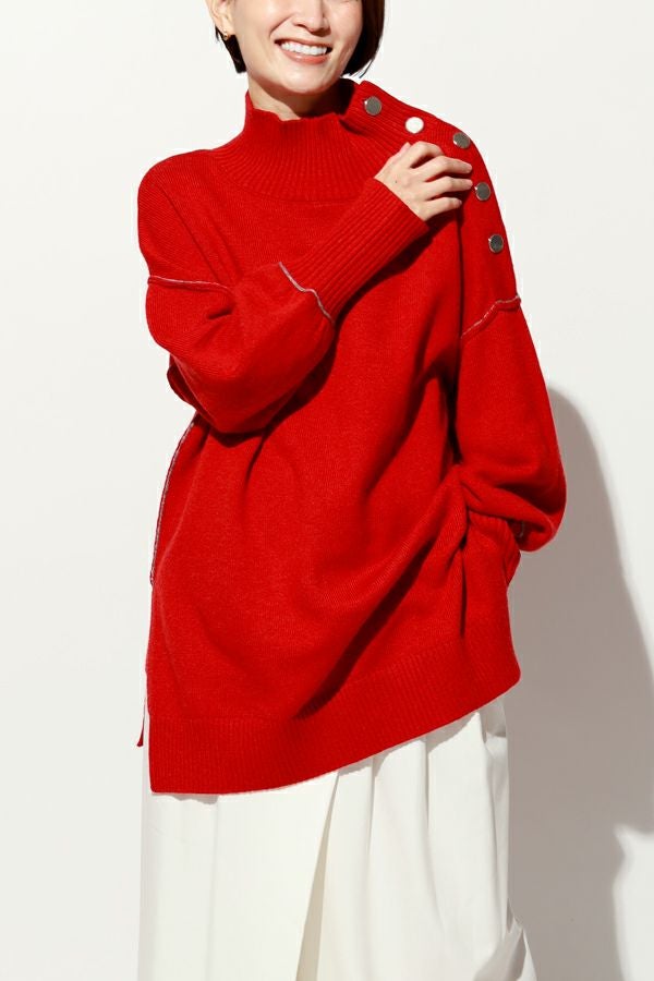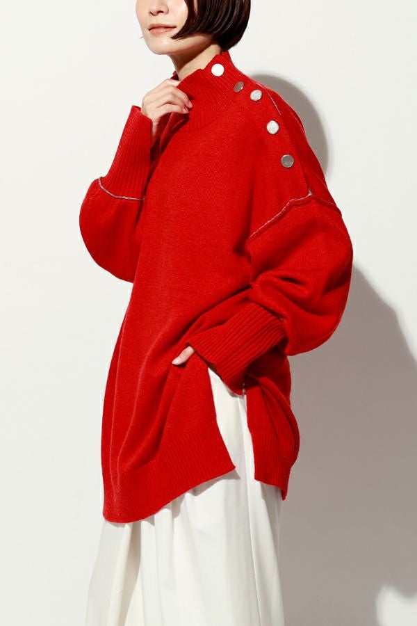 着るだけで決まる、色で遊べる。大人のための万能チュニックニット。 ゆとりのあるサイジングはサッと着こなすだけでサマになり、さりげないバイカラーデザイン、程よくボリューム感のある袖に長めの袖リブ設定でスリットを入れてクールな印象を演出。 ヒップを隠してくれる嬉しいチュニックレングスにはサイドに深めのスリットを入れて、腰周りがリラクシーに着用いただけるシルエットになっています。パンツだけではなくスカートに重ねてもバランスが取りやすいデザインに。 ハイネック衿は着苦しさを感じないようにほど良くゆとりを入れて首に沿う設計なのも嬉しいポイントです。 冬のワードローブに色違いで揃えたくなる、汎用性の高いチュニックニット。 c/#赤・ブルーはシルバーボタン仕様で、パンツスタイルでマニッシュな印象に。 c/#キミドリ・黒はゴールドボタンがポイントとなり、きれいめスカートと合わせてクールなオンスタイルも楽しめます。 シーンに応じて異なる表情が楽しめる、着回し力の高い一枚です。