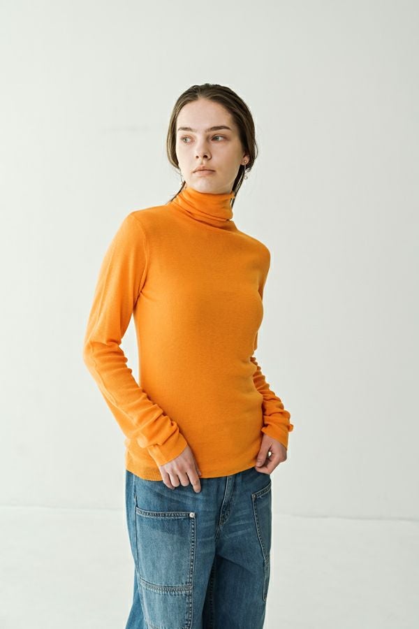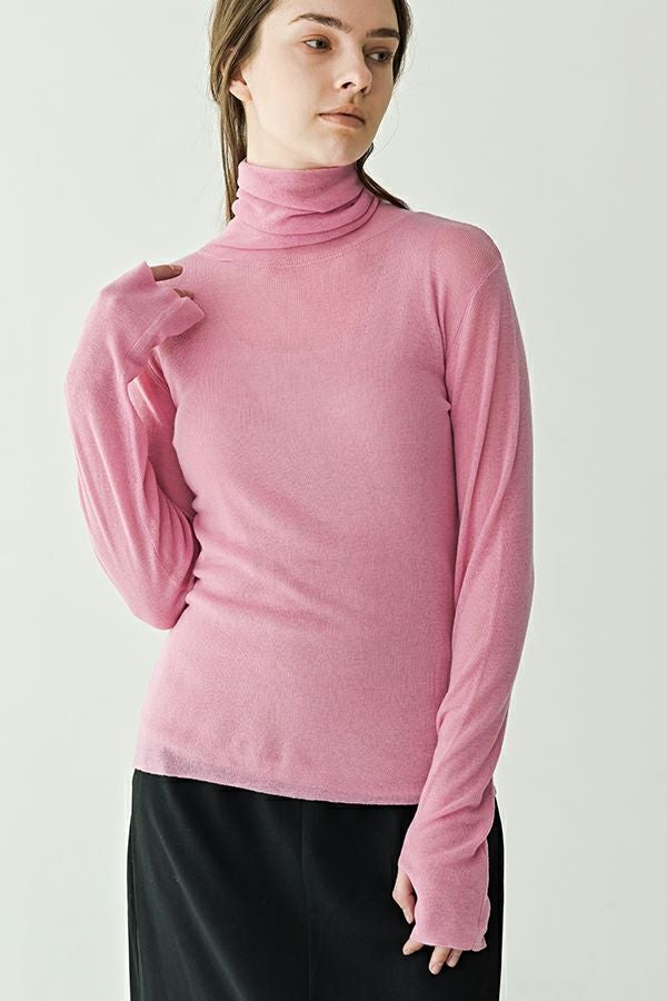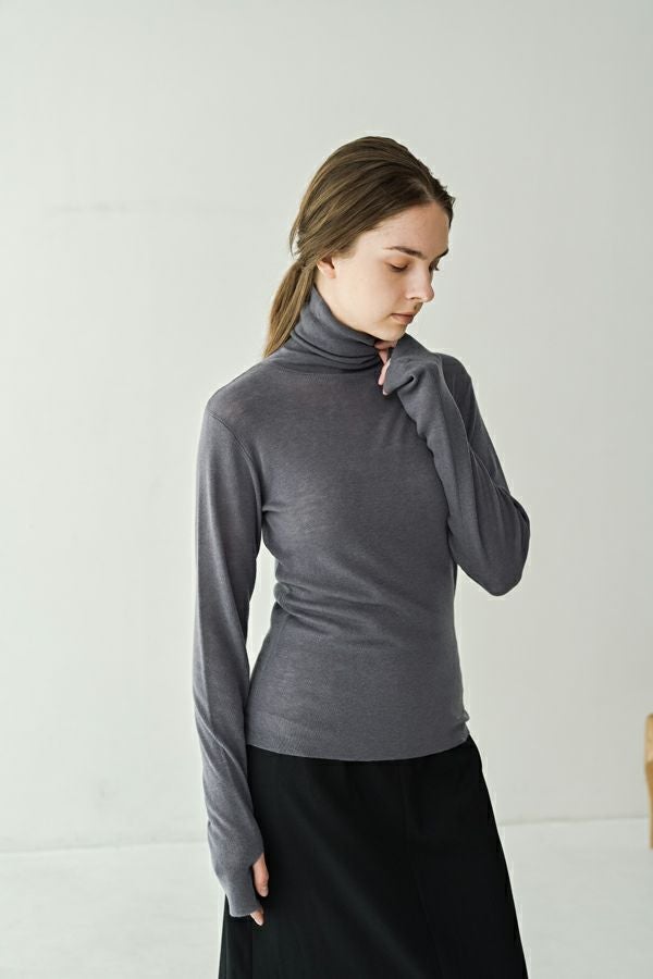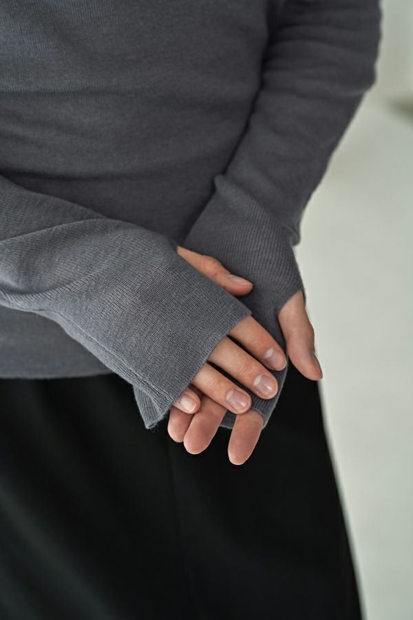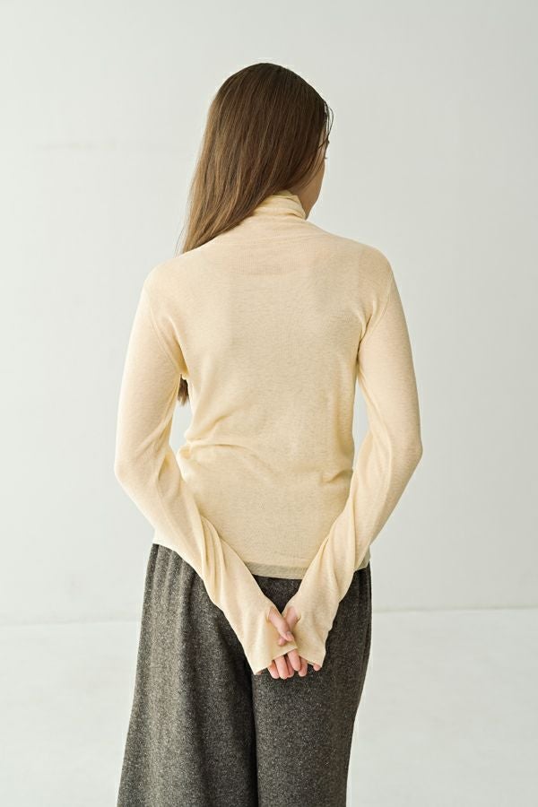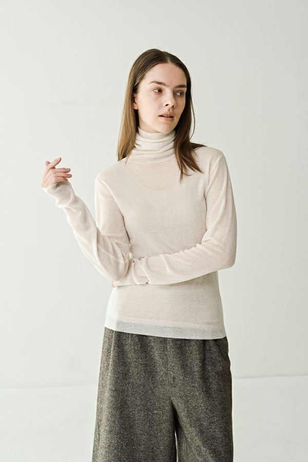 素肌が贅沢を知る、極上ウールのタートルリブプルオーバー。 毎日を少し特別にする、上質な肌触り。 まとった瞬間から手放せなくなる「ふわふわ、もちもち」の心地よさが、肌をやさしく包み込み、自分自身を思いやる一着に。今秋から登場の「mocochi(もこち)」シリーズです。 着ぶくれしない薄手のインナーニットながら、しっかりと暖かさをキープ。 冬の装いにクラス感を添える、頼れる存在です。 この特別な肌触りは、極細の上質なウールと、水で溶ける性質を持つ“水溶性ビニロン”を補強糸にして一緒に編み立てることで生まれます。最終の仕上げでビニロンが溶けてなくなり、純毛100%のニットへと仕上がります。 編み組織の間に空気を含むことで、軽やかでふんわりとした膨らみと柔らかさを実現。デリケートな肌にもやさしく寄り添い、敏感肌の方にもおすすめです。一度袖を通せばやみつきに。肌寒い季節の毎日に、つい手が伸びる上質なデイリーインナーです。 肌ざわりの良さと絶妙なフィット感で、インナーとして思わずヘビロテしたくなる一枚。長めのスリーブは親指が通せる仕様になっており、アームウォーマー風に着こなすことで、さりげないアクセントと機能性を両立。秋冬のレイヤードスタイルに欠かせない、品よく実用的な万能ニットです。 ●非常にデリケートな素材ですのでアクセサリー等の引っかけに注意して下さい。 ●糸及び編み組織の特性上、下垂れしやすいのでハンガーには掛けず、畳んだ状態で保管して下さい。 ●手洗い可